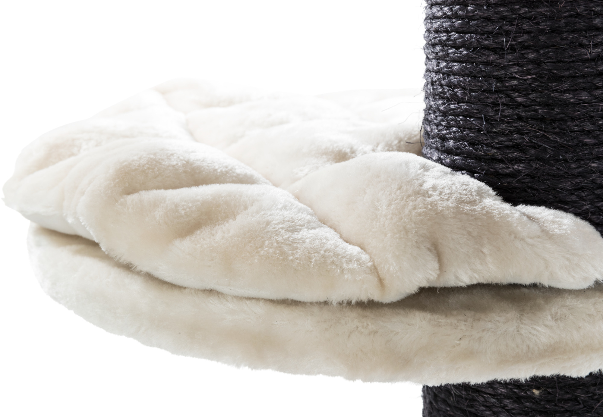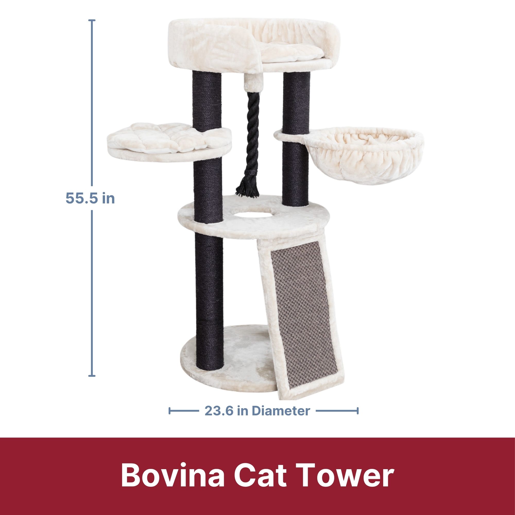 The TRIXIE Bovina Cat Tower will provide endless opportunities for cats to play, explore, scratch, or relax. Designed especially for large cats such as Maine Coons, any size cat or even multiple cats will enjoy this generously proportioned tower. Felines can sharpen their claws on one of two sturdy scratching posts instead of on your furniture or carpet, giving them a healthy outlet for their scratching instincts. All posts are covered in extra thick, durable sisal. The cat can curl up inside the extra-large hammock if a nap is in order. Are you feeling a little spunky? Jump, climb, or perch atop one of two plush-covered platforms, wait for unsuspecting prey, or enjoy the view. Both platforms include cozy cushions, and the top has a backrest for comfort and security. The cushions are removable and hand washable. Bovina features a climbing ramp that lets your cat run up the tower for even more feline fun. The climbing ramp doubles as an additional scratching surface with a sisal top. Plus, a sturdy rope for tempting more play. Suitable for cats of all ages and activity levels.