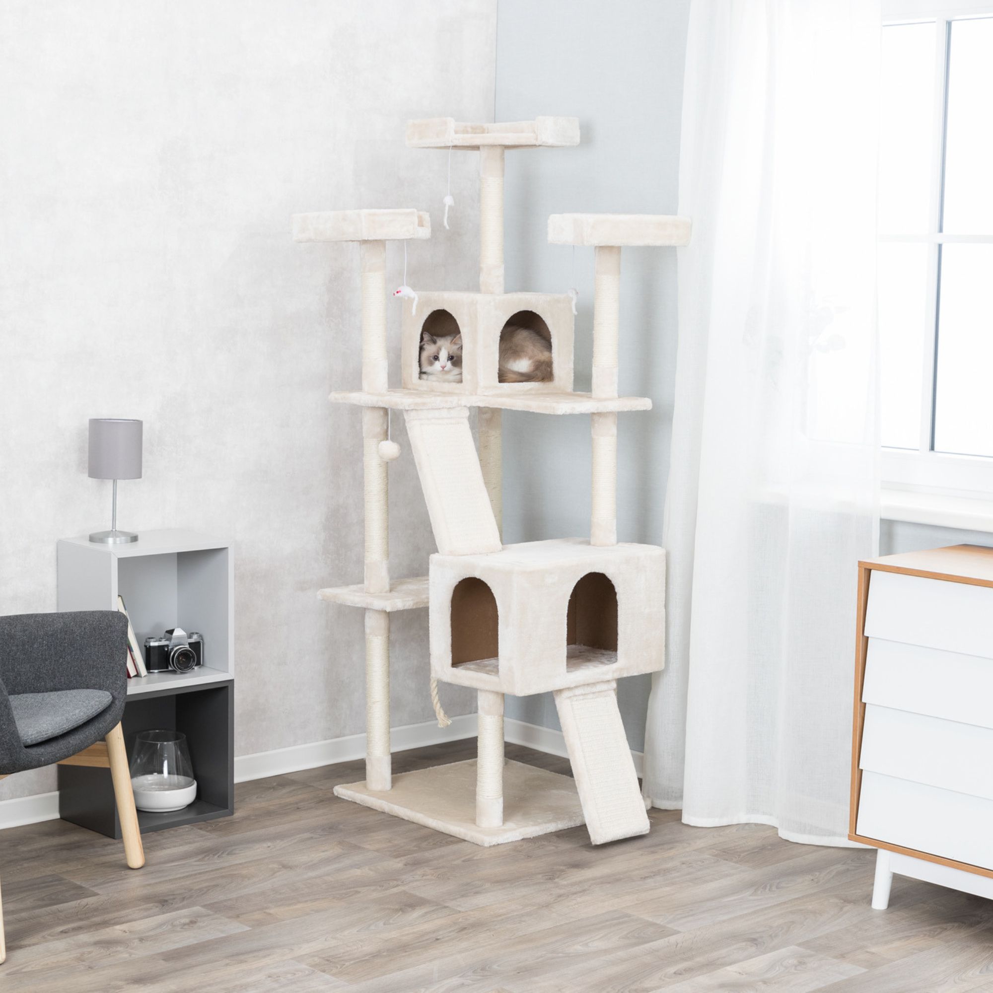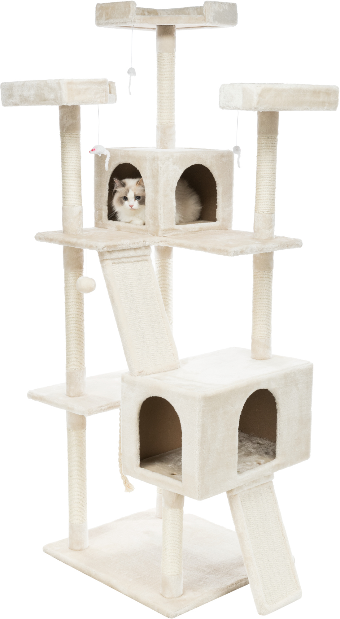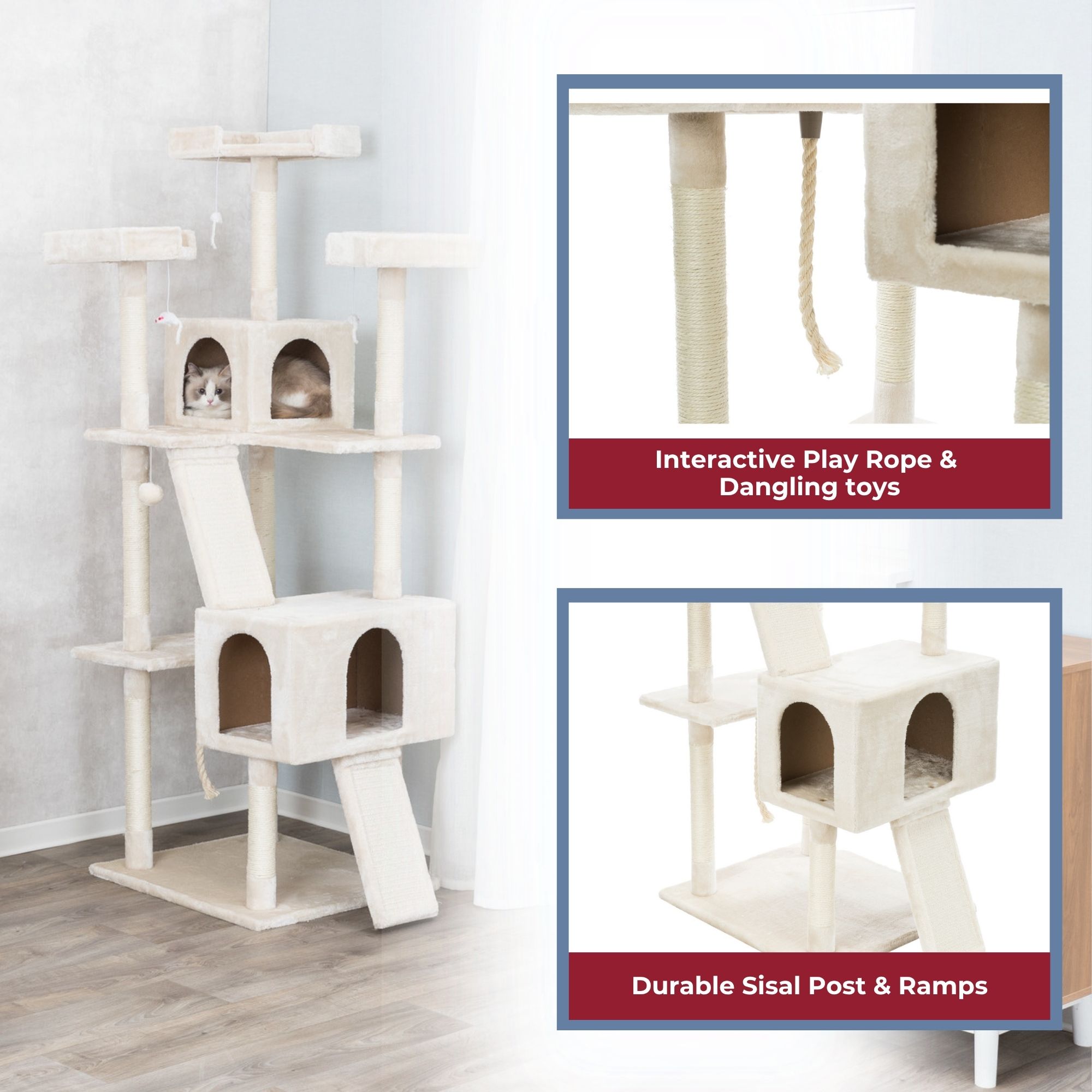 - Two climbing ramps for speedy ascents; ramps include natural sisal scratching surface