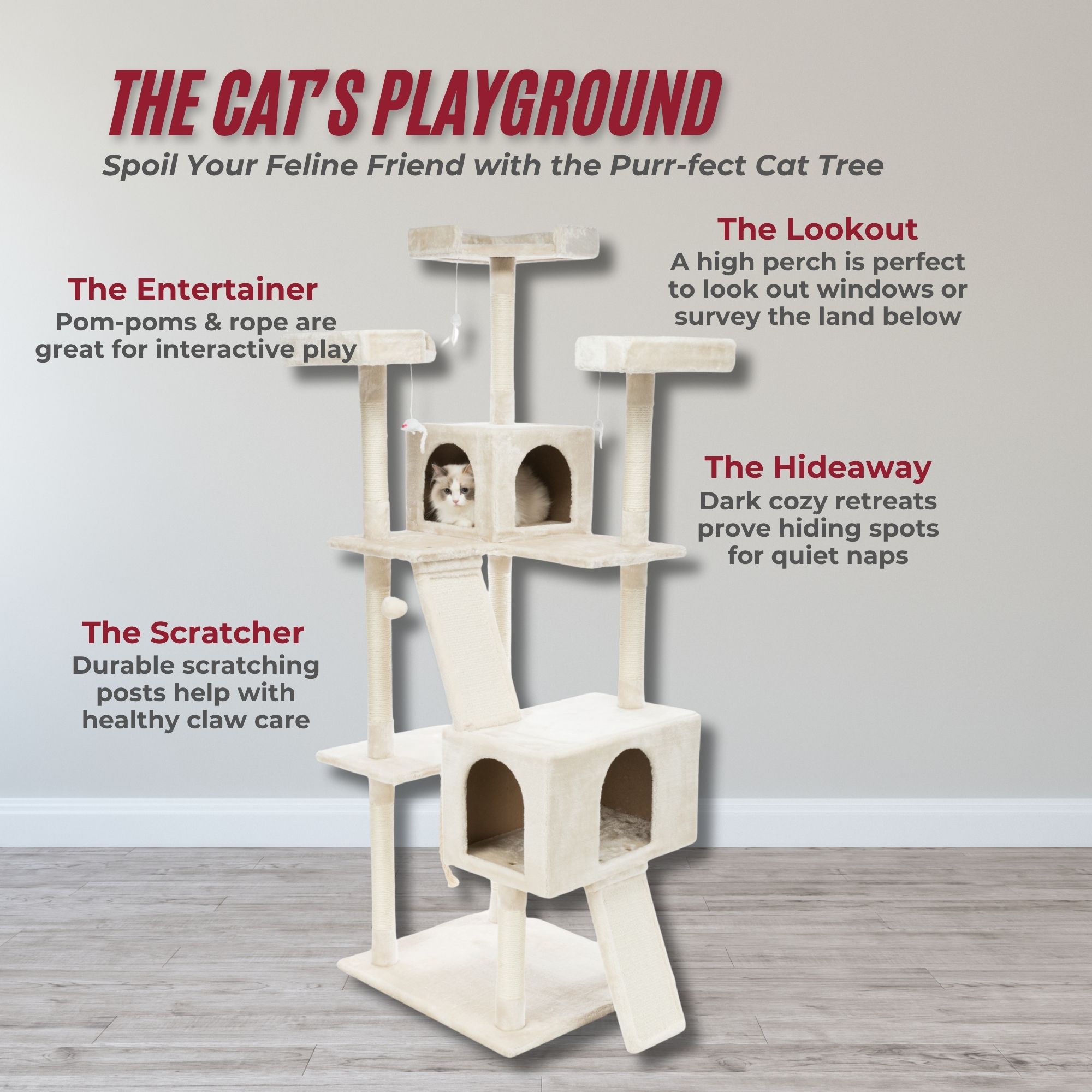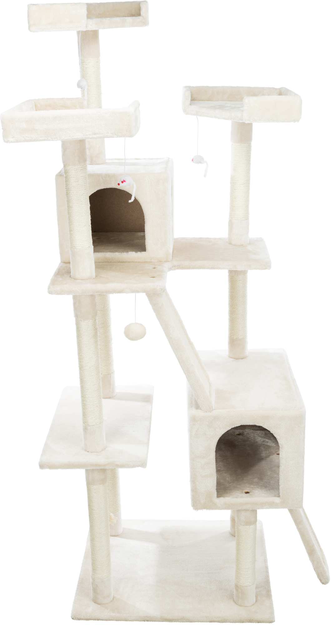 - Three tall scratching columns wrapped with natural sisal; a total of 10 scratching posts