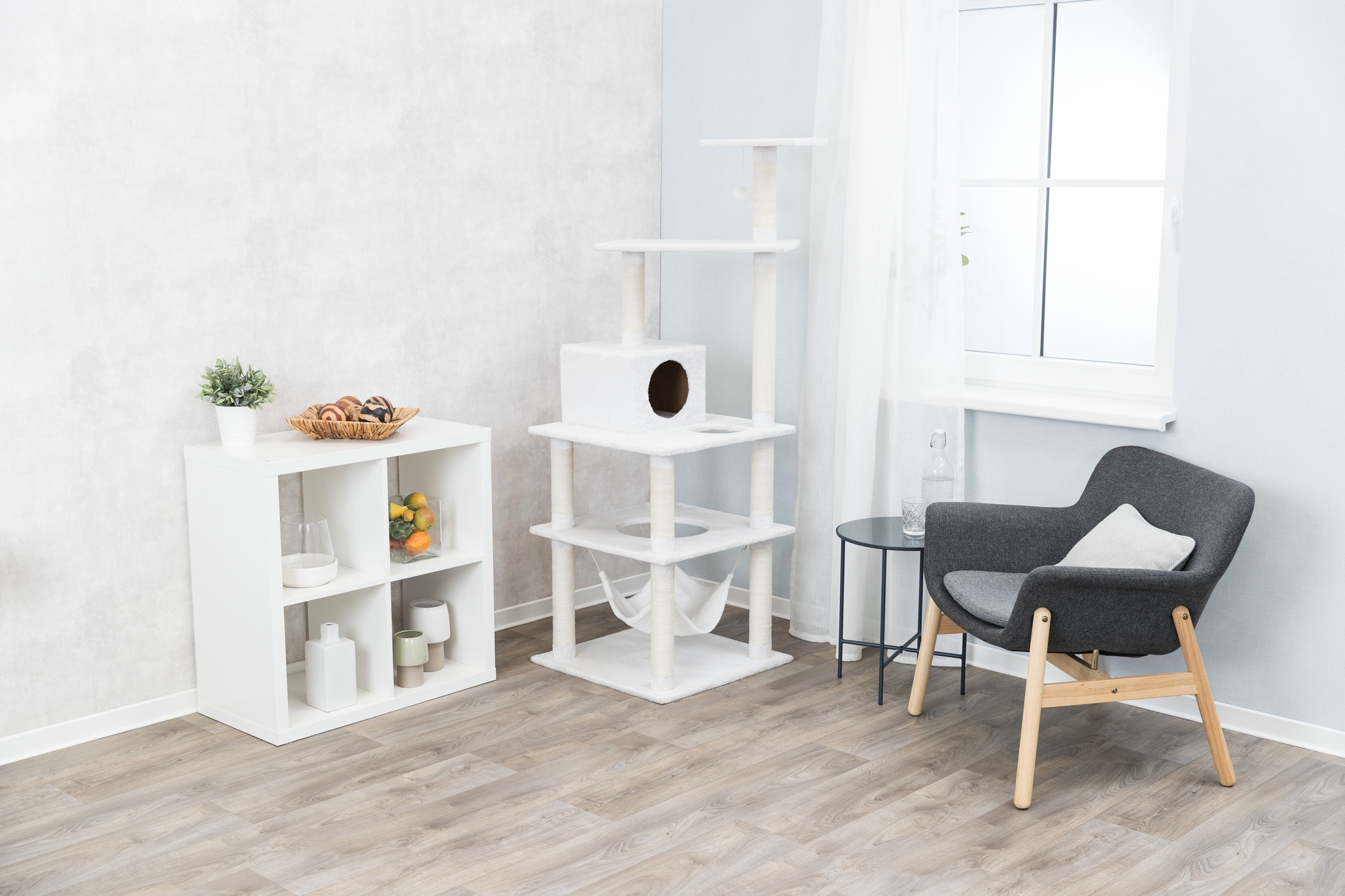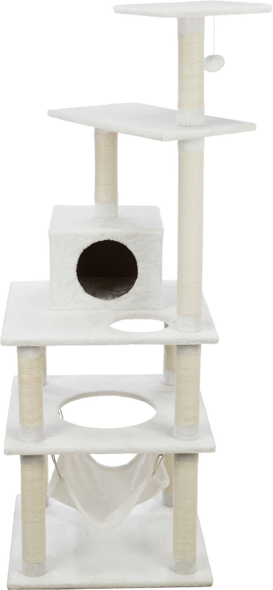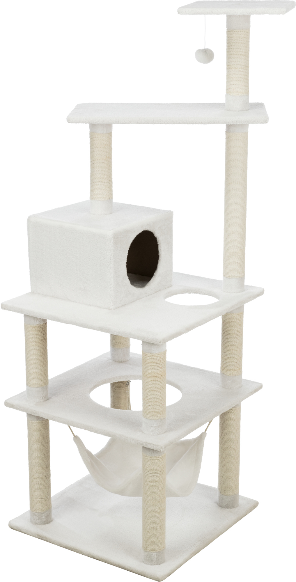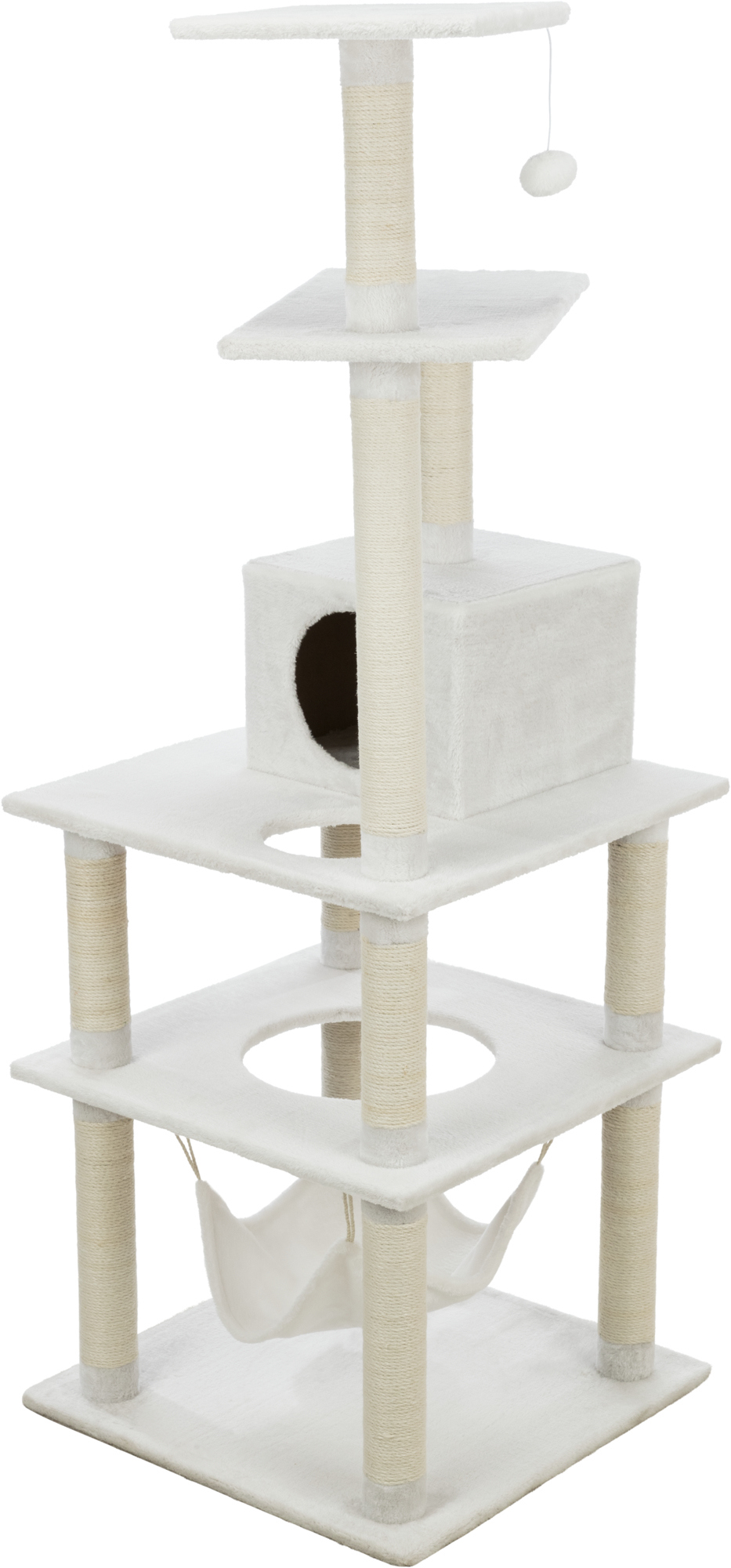 The TRIXIE Abby Cat Tree will provide endless opportunities for cats to play, explore, scratch, or just relax. Cats can sharpen their claws on one of eleven scratching posts instead of on your furniture, giving them a healthy outlet for their scratching instincts. All posts are covered in durable sisal. Your sweet kitty will fall fast asleep on any one of the plush covered platforms, condo or hammock, making it the perfect retreat. Feeling a little spunky? Jump, climb or perch atop one of six plush covered levels and lie in wait for unsuspecting prey or simply enjoy the view. The subtle fresh tones of the sisal and plush fabric also make this piece of cat furniture easy to integrate into your home decor. Suitable for cats of all ages and activity levels.
