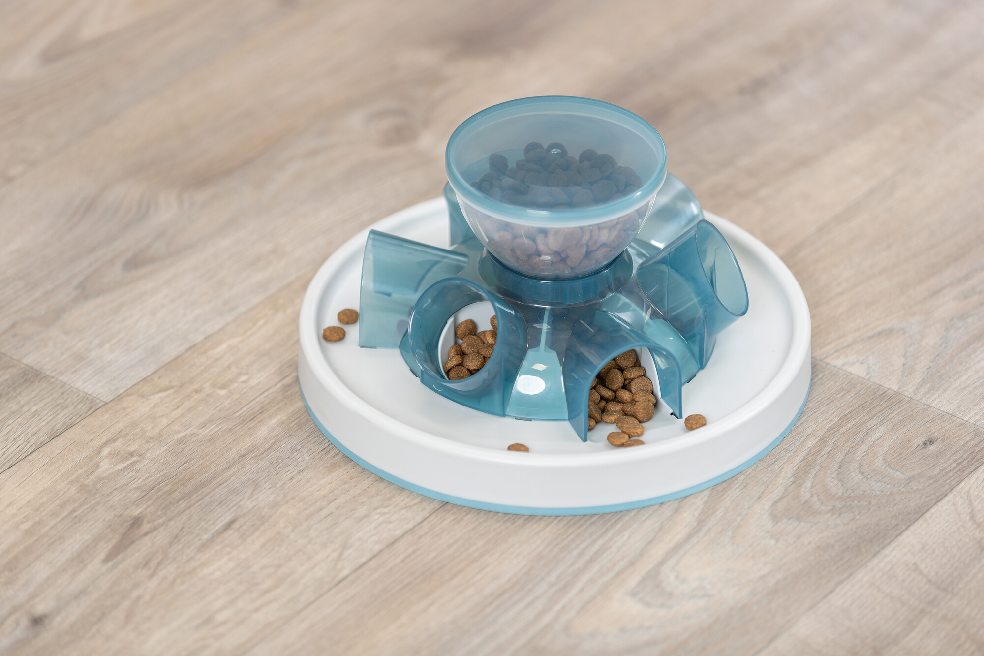 Cats are energetic and inquisitive animals. Channel their energy and curiosity into something positive with the TRIXIE Tunnel Feeder for Cats. Fill the center container with your pet's favorite small treats or dry food, and let the games begin. Their rewards tumble into six tunnels where your kitty can poke, scoop, and nibble away. You can also adjust the output level to regulate how quickly treats/food are released. It can also be used as a daily feeder. We've also included an instructional booklet with tips and tricks to stimulate your cat's curiosity through play.