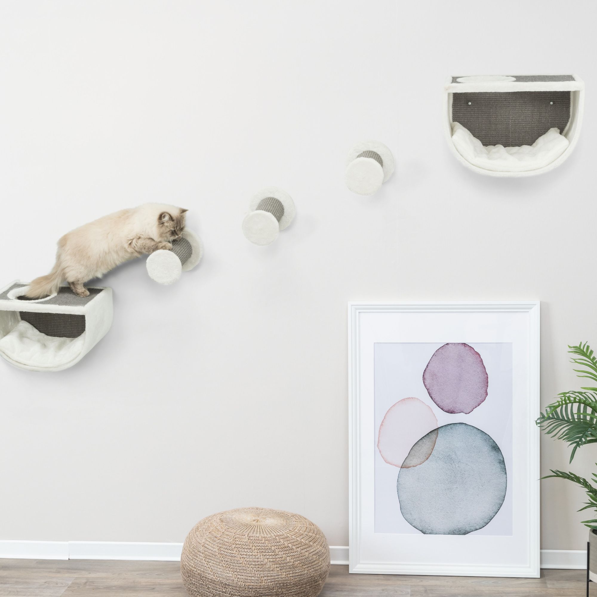 Elevate your feline friend and reclaim your floor space with this the TRIXIE Eden Wall Mount Cat Tree. A great space-saving lounging set, ideal for small spaces. Each of our 3 steps are wrapped with natural, durable sisal to engage your frisky feline. Our 2 plush lined condos are topped with a sisal scratching surface, providing more alternative scratching surfaces other than your fine furniture. If a nap or place to hide is in order, each condo shelf has an opening for your kitty to crawl inside and fall fast asleep as she sinks into the plush cushions, making it the perfect retreat. The removable cushions can be hand washed.