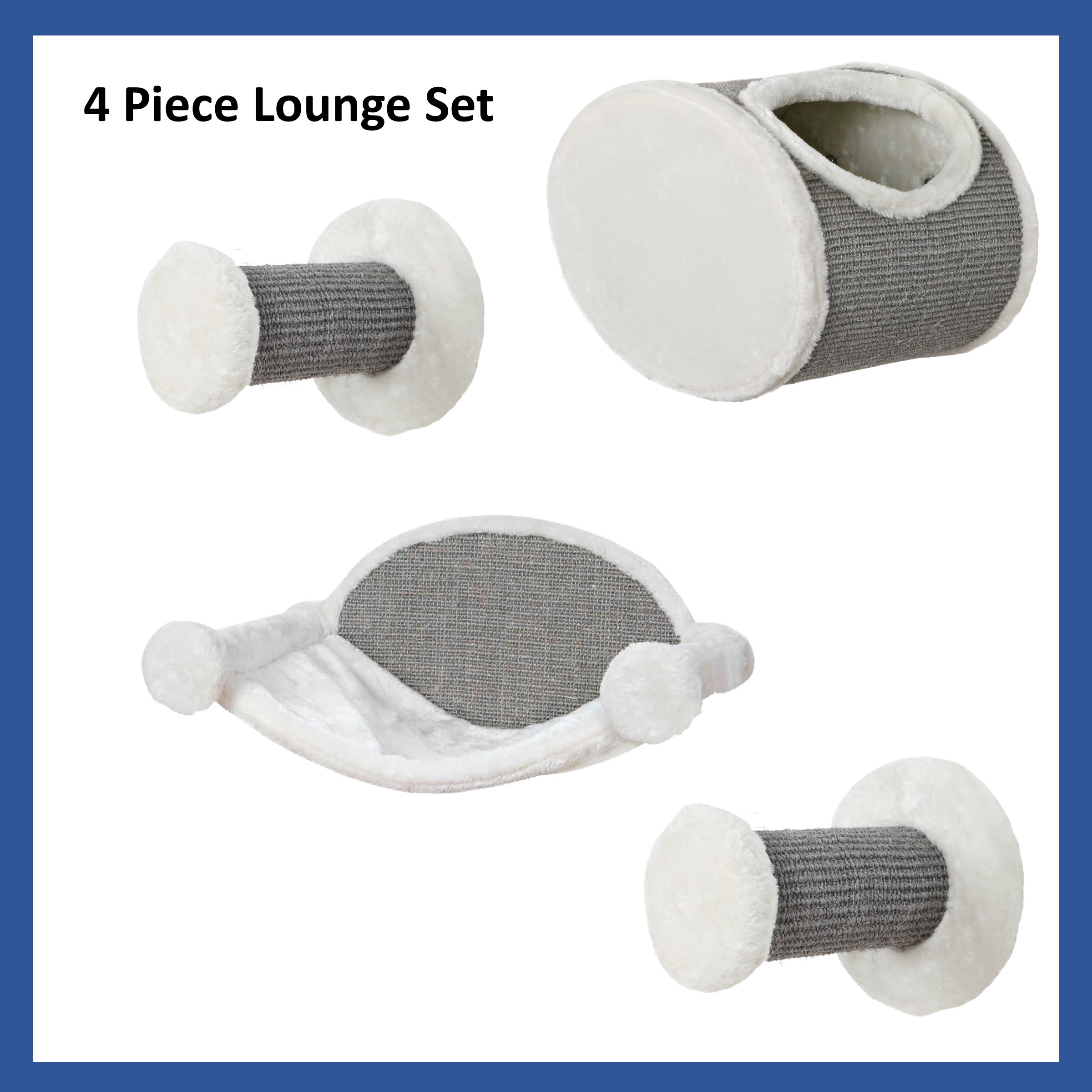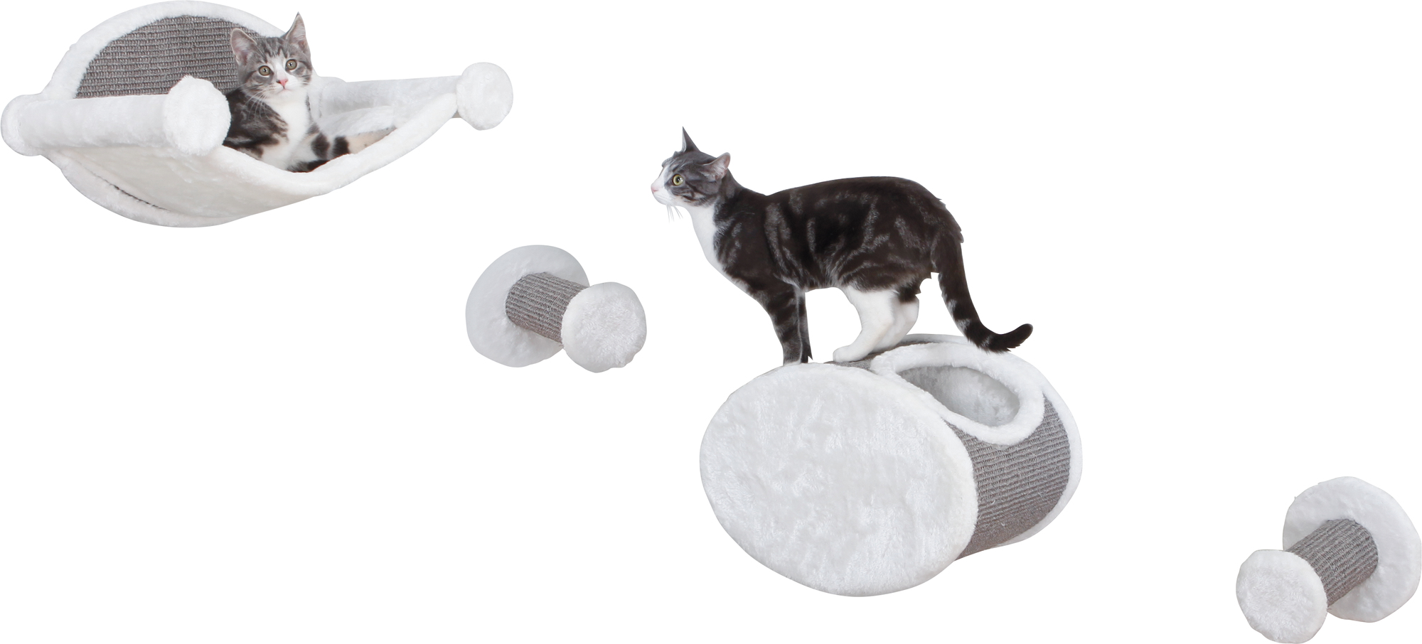 TRIXIE's Wall Mount Systems are the latest in cat tree design. This great space-saving lounging set is ideal for small or modern spaces. More importantly, cats will love the ability to explore new heights with two perches, a plush lined Condo and ultra-plush hammock. Each item is also wrapped with natural, durable sisal to engage your frisky feline. Mix and match to create the perfect solution. Plush lined Condo with removable cushion that can be machine wash, gentle cycle.