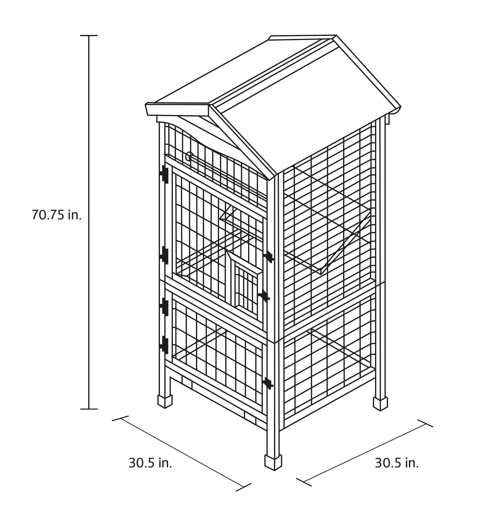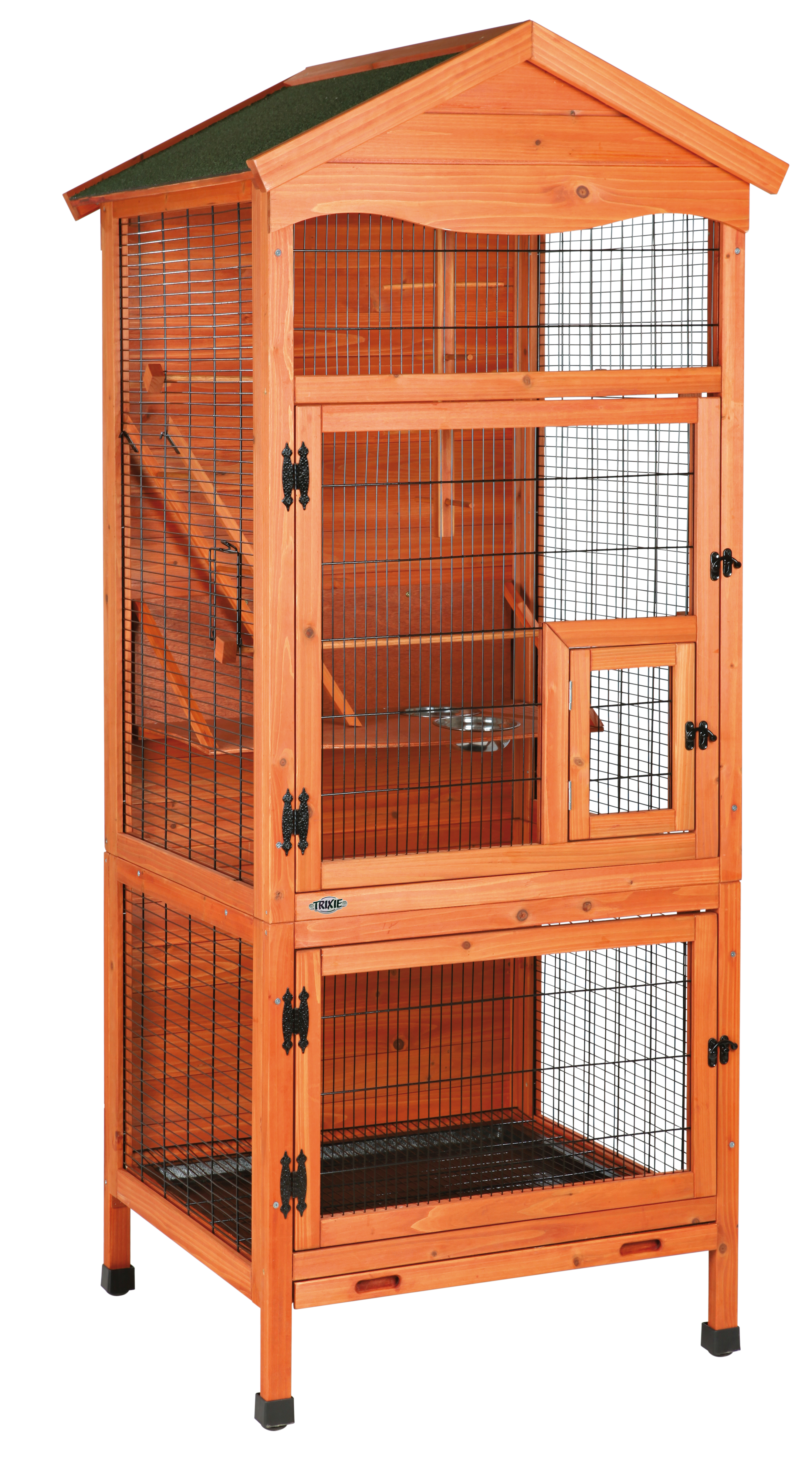 TRIXIE natura Aviary Bird Habitat is ideal for parakeets, finch and other small birds. With a weatherproof finish, it can be used both indoors and out. Because birds require regular exercise, our design includes horizontal bars perfect for climbing and displaying toys to keep your feathered friends actively engaged. There is even a flap on the side for fastening accessories such as a birdbath. Two perches, climbing frame, ladder and feeding tray with two stainless steel bowls make this spacious home the ultimate solution. Three different sized doors with metal latches provide owners with a variety of ways to interact with their birds. The back wood panel shields them from the wind as they happily flutter the day away. For fast and easy maintenance, there is a pull-out plastic tub at the base of the cage with an extra floor grid to prevent birds from flying out when the plastic tub is removed.
