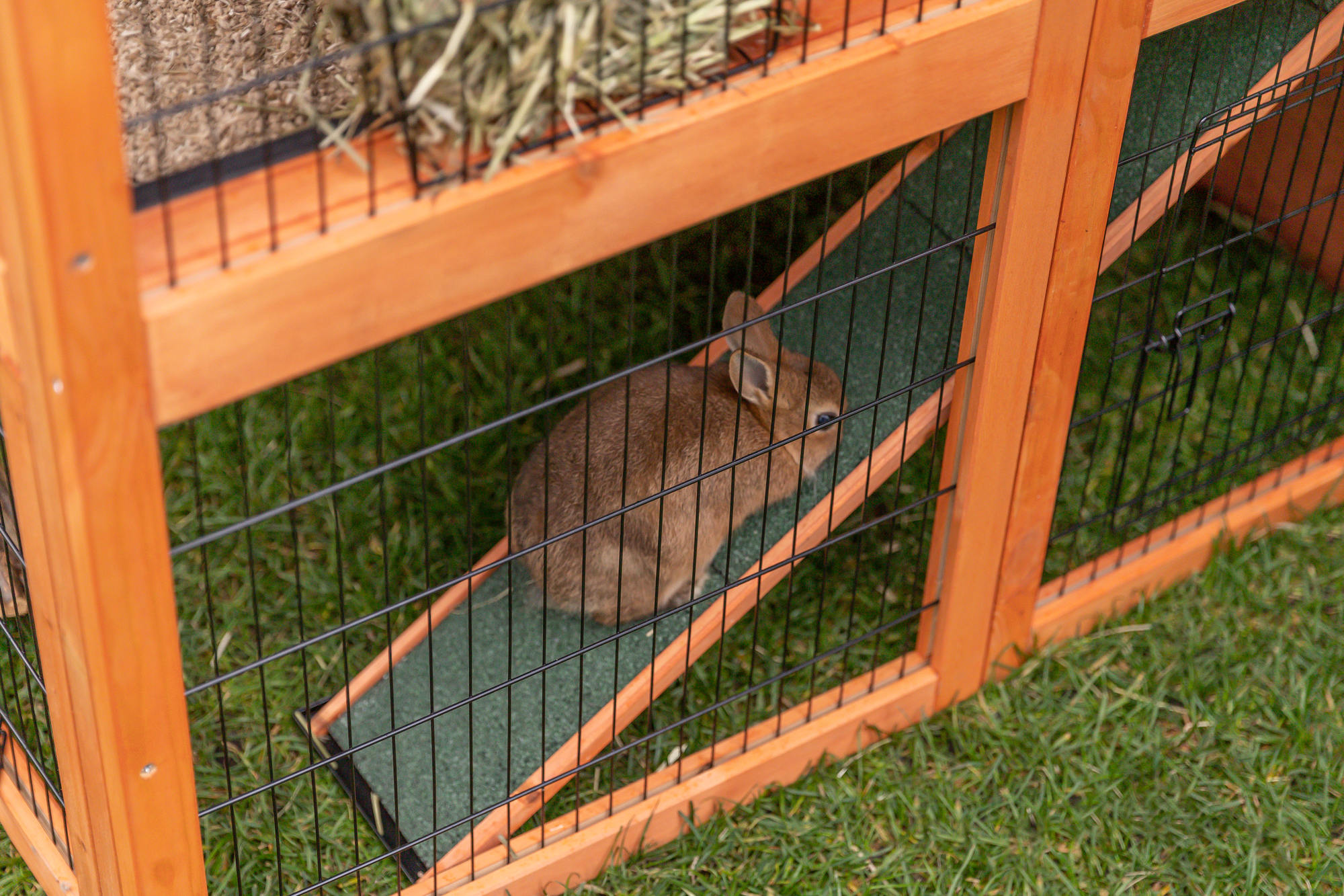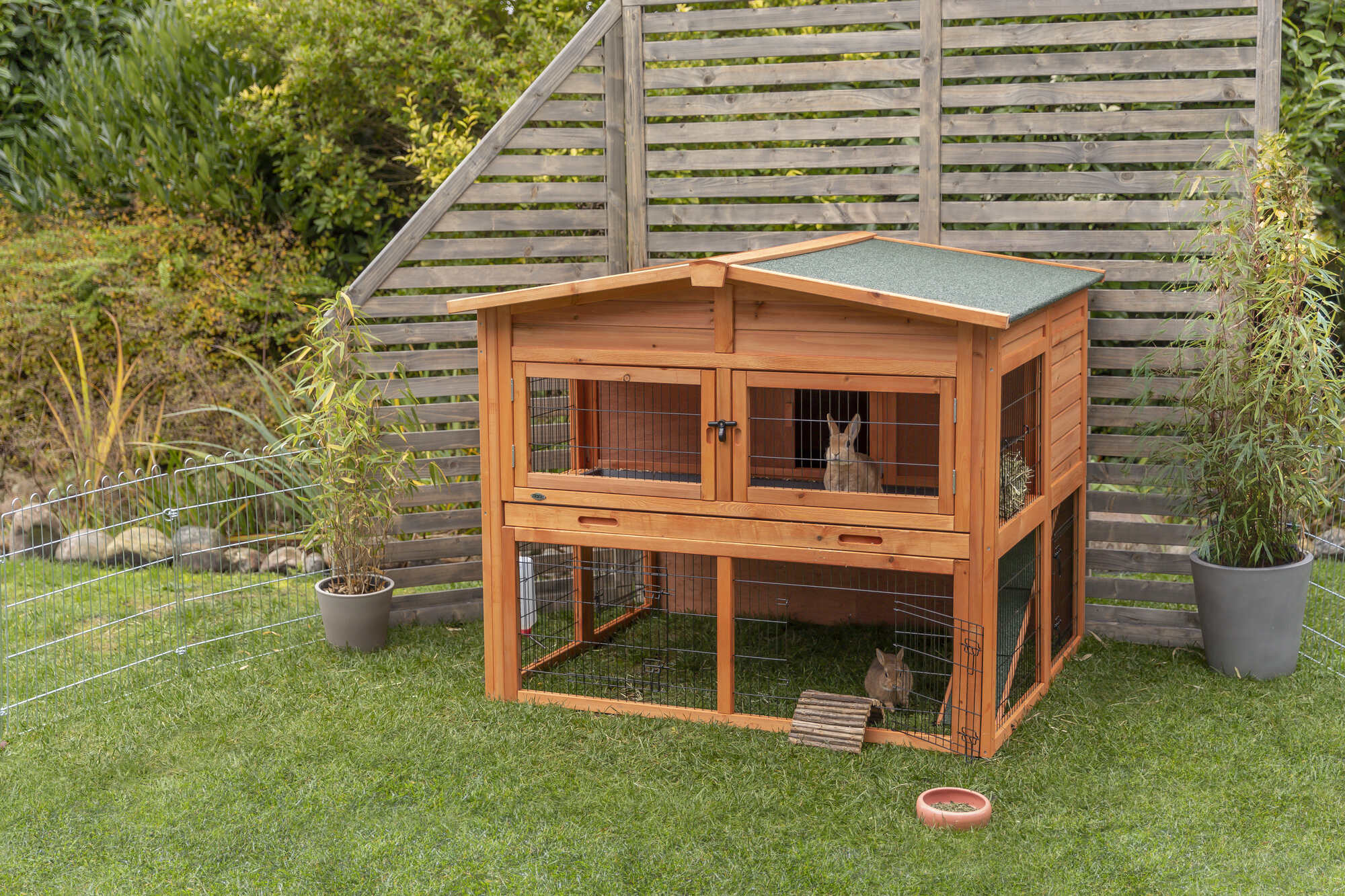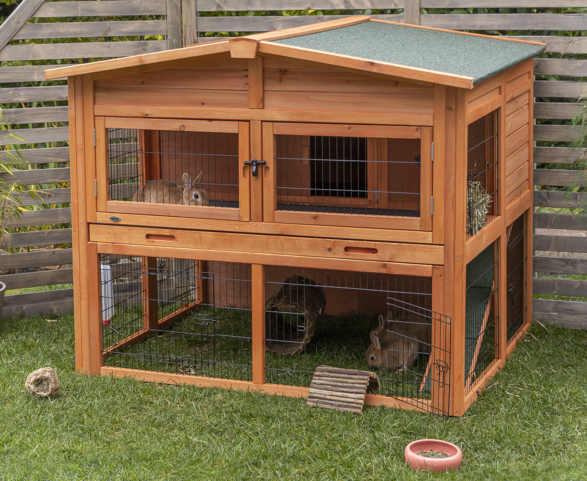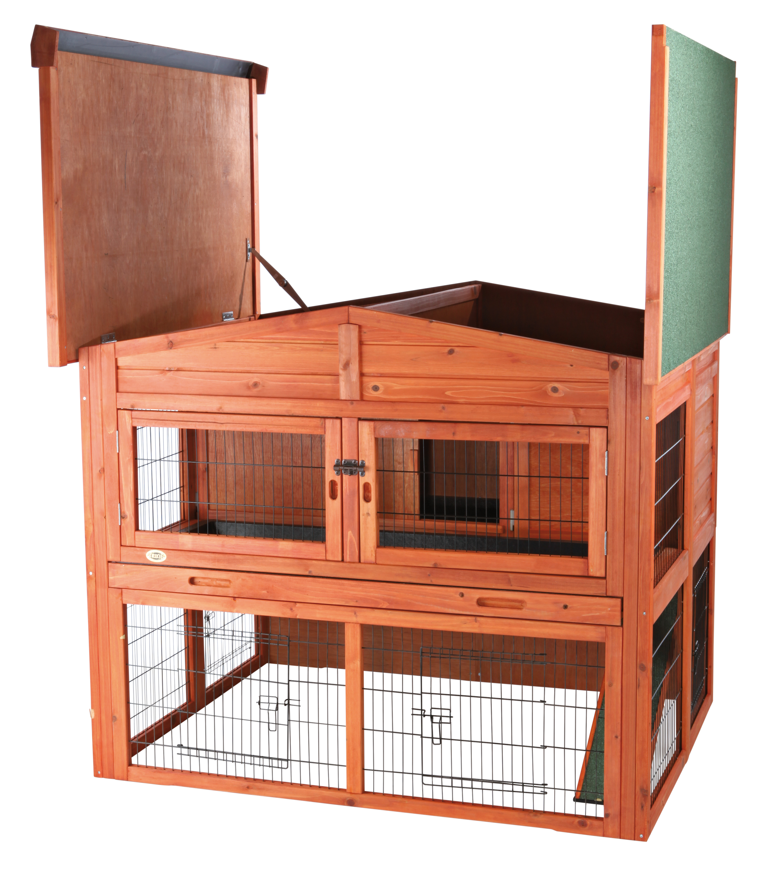 TRIXIE natura Rabbit Lodge with Attic (XL) is ideal for groups of small animals. The 2-Story design allows your pet to roam inside and outside, upstairs and downstairs, in the sun or shade, for ideal comfort. However, the non-slip ramp and interior lockable hatch doors give the owner options to restrict access as needed. The pitched roof has a special weatherproof coating and the hinged panels allow access from above. For easy maintenance, we have included seven doors and two plastic pull-out trays. The durable, powder-coated metal lattice will help keep your pet safe while keeping out unwanted visitors, and the close mesh design makes it suitable for breeding. Suitable for a group of small animals such as Rabbits or Guinea Pigs. Dimension: 53 x 45 x 44 inches. Weight: 111 lbs. Please note: water bottle and bowl not included.
