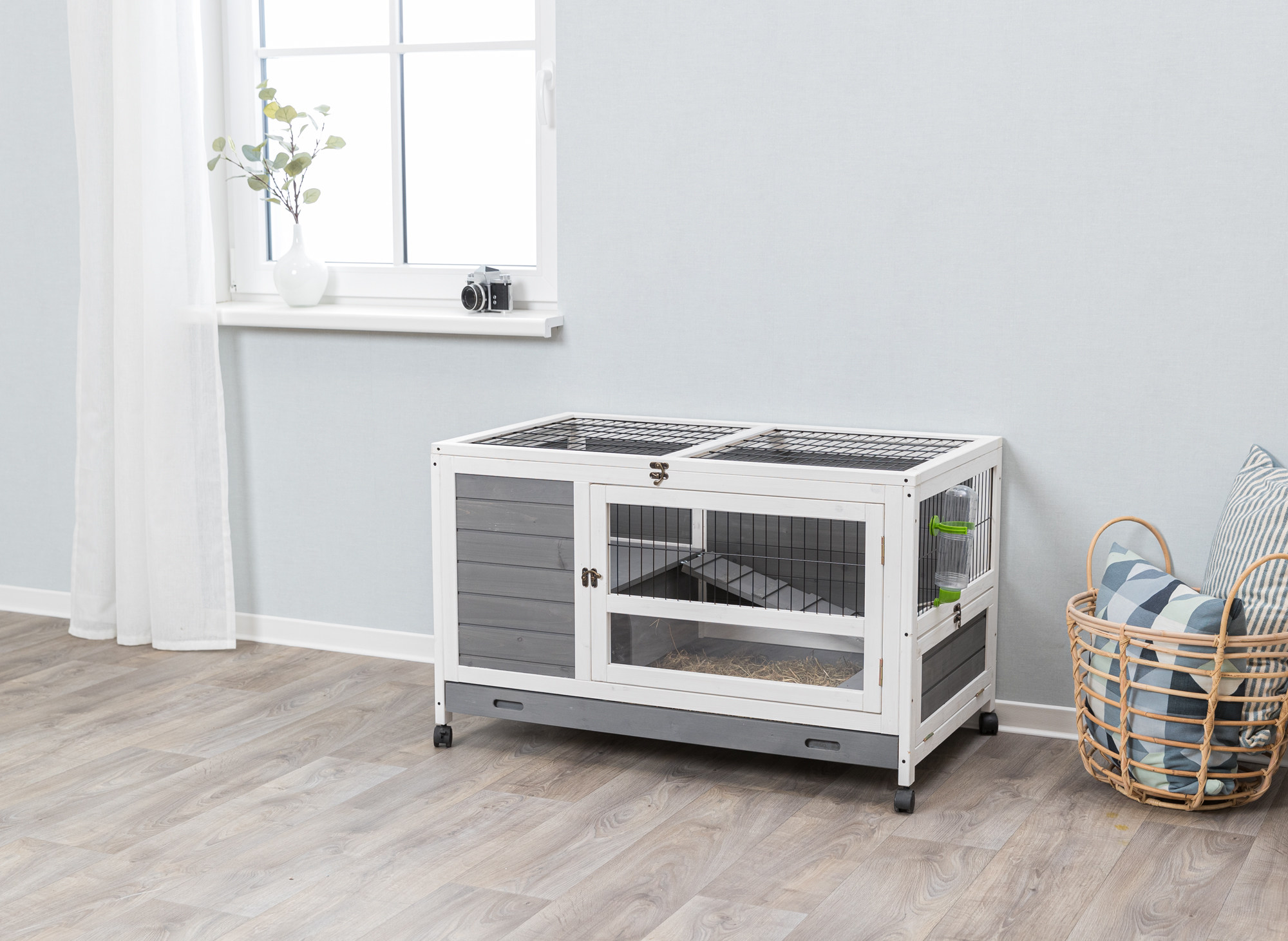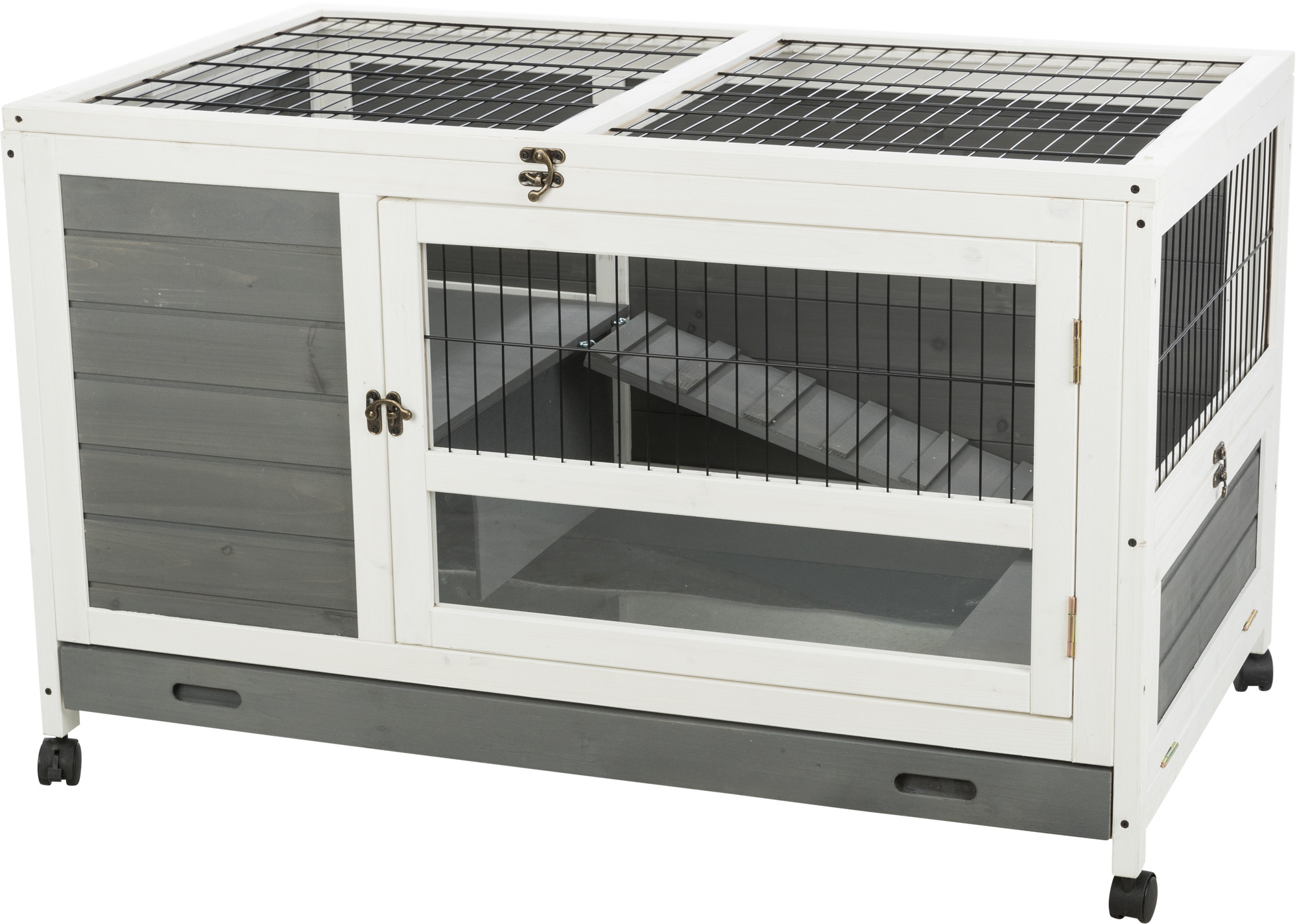 TRIXIE's Indoor Rabbit Hutch is ideal for single and smaller breed rabbits, as well as guinea pigs. The 2-Story design has a retreat area on the upper level, accessible by a non-slip ramp. On the bottom level a small side door can be lowered as a ramp for free ranging rabbits. Features lockable wheels for convenient handling and moving. Three doors allow easy access the hutch from different positions. The top door has a locking arm. For convenient cleanup, includes a deep pull-out metal tub. Solid wood construction, painted finish and the finest materials mean this hutch will endure years of use with very little maintenance. Quick and easy assembly.