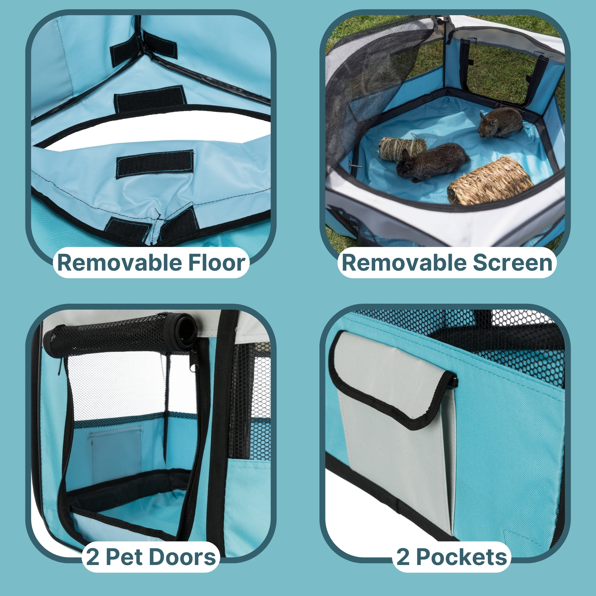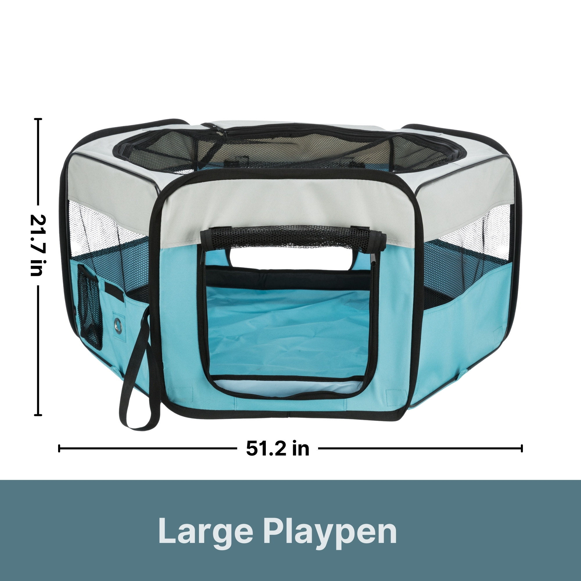 The TRIXIE Soft-Sided Mobile Playpen can provide your little pal a cozy and safe place! The fully collapsible design quickly folds flat to store it in the included zippered bag, making traveling with your furry friend incredibly easy. Crafted from extra-durable nylon and a rubber coating bottom, this playpen can be used for indoor or outdoor purposes—protecting your floors when used inside and a water-resistant bottom that can withstand damp lawns. If your best bud prefers to explore the grass, you can remove the bottom so he can play directly on the lawn! The pen includes straps and anchors to secure it to the ground and a removable net cover so your pal can’t jump out. Additional features include a removable net cover to prevent pets from jumping out, two side pockets, and an opening for a drinking bottle. Easy to clean by wiping away any messes with a damp cloth. The removable net and nylon bottom are hand washable. Quick and easy to pop up!