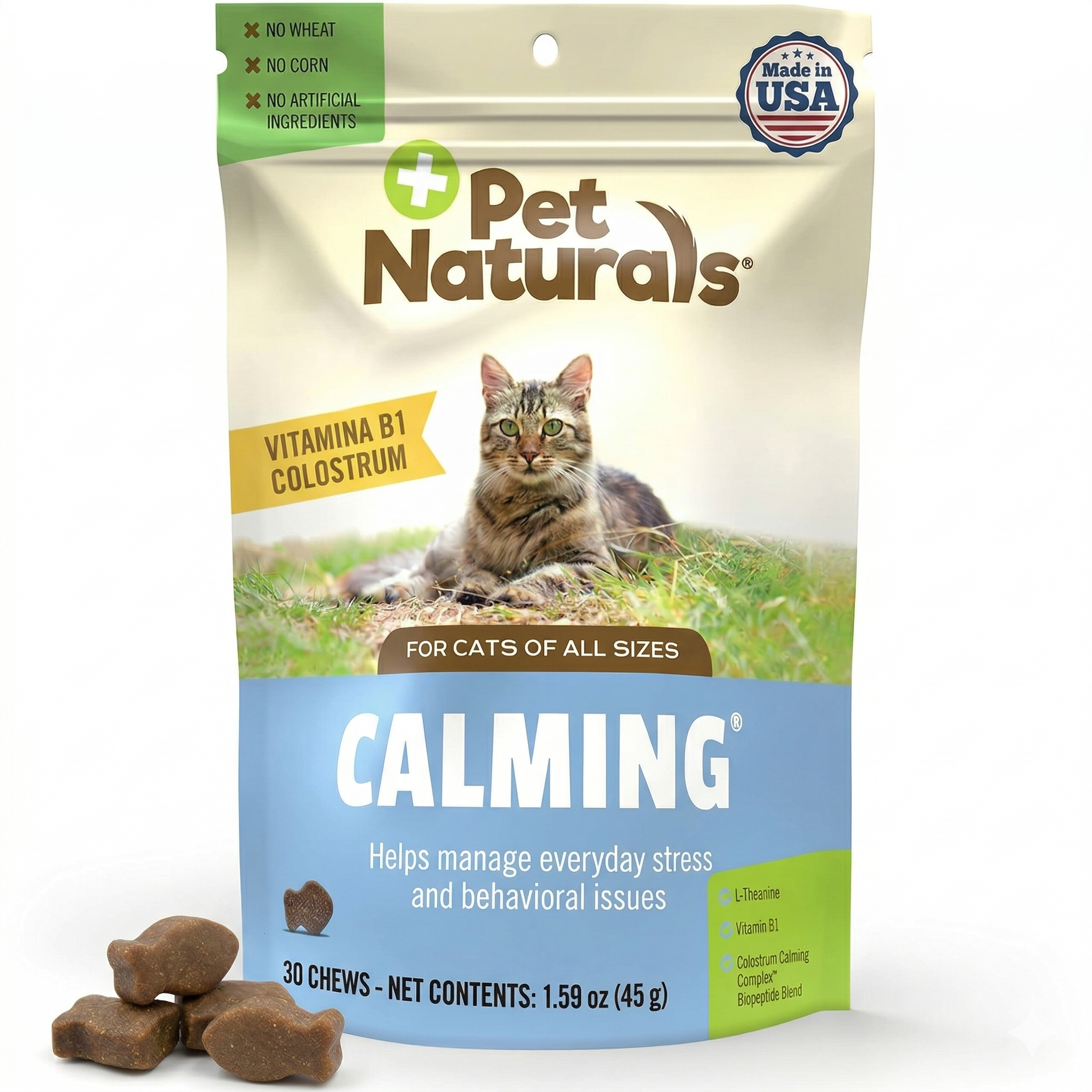 | Retail Product Description | Keep 'em Happy with vet-formulated, chicken-flavored calming chews! Three effective calming ingredients support calm behavior and reduce stress in cats fast, with no corn, no wheat, and no artificial flavors. Tasty, bite-sized soft chews feature three effective active ingredients. Colostrum supports calming and relaxation, plus brain health and function in pets of any age! Thiamine, also known as Vitamin B1, supports a balanced mood and sharp memory. Thiamine offers calming benefits by helping the body manage stress and anxiety. L-theanine has unique calming and mood-balancing abilities - it supports relaxation without drowsiness. If your furry friend is feeling extra stressed and displaying behaviors like nervousness, hyperactivity, abnormal urine marking, excessive scratching, or aggression, it's OK to give them another chew (or two!) to help keep them calm. Calming chews can be given to your cat daily or simply as needed. |