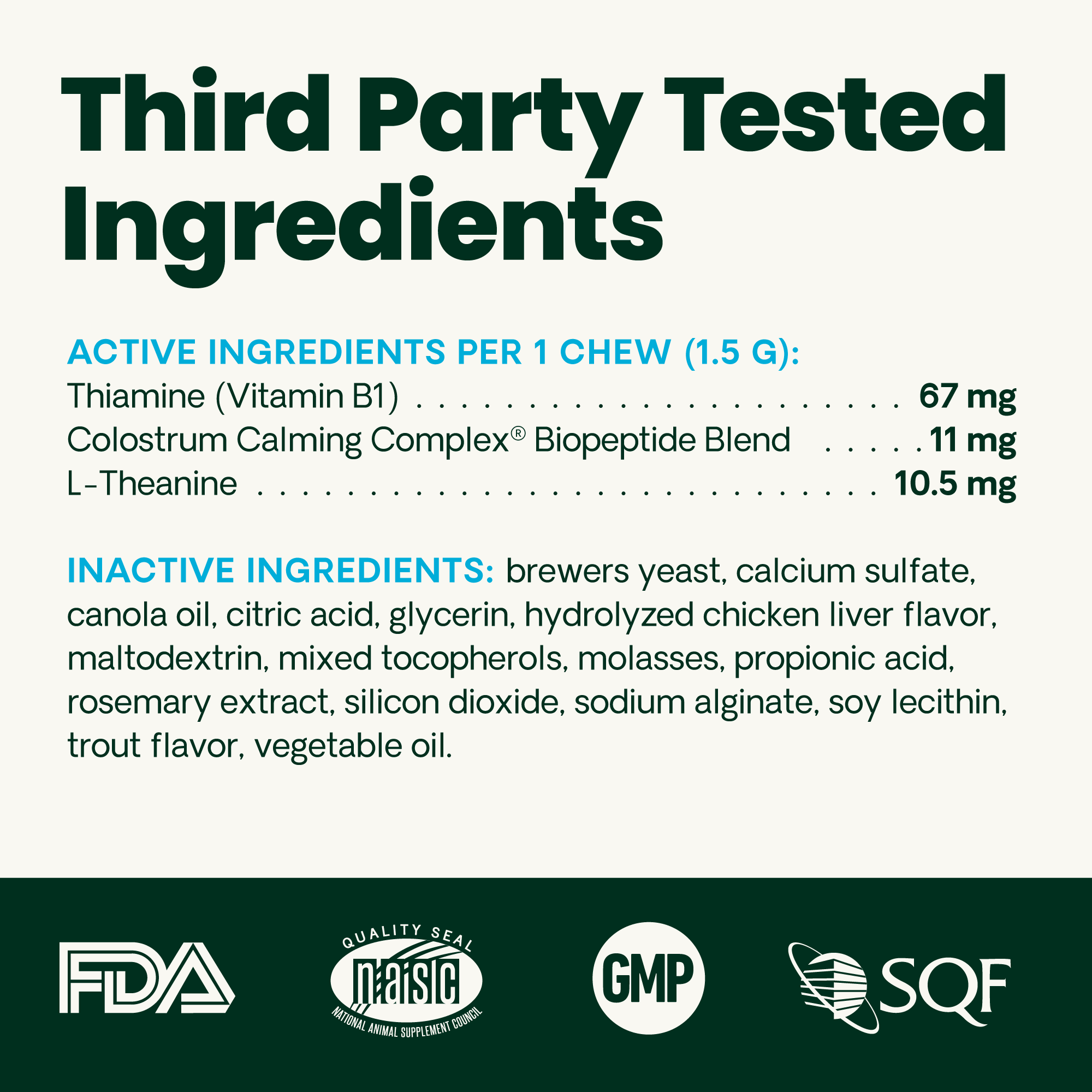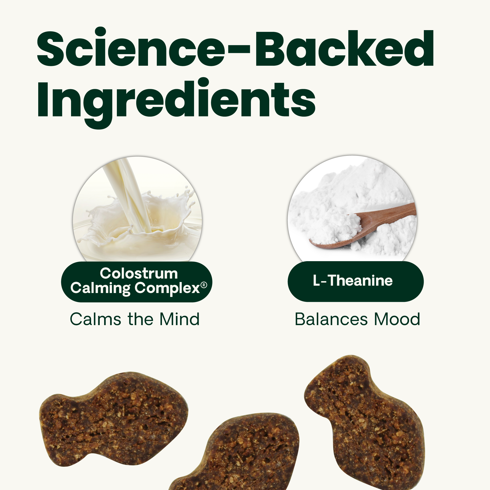 | Retail Bullet 1 | Colostrum and L-theanine support behavior and help reduce stress and anxiety |