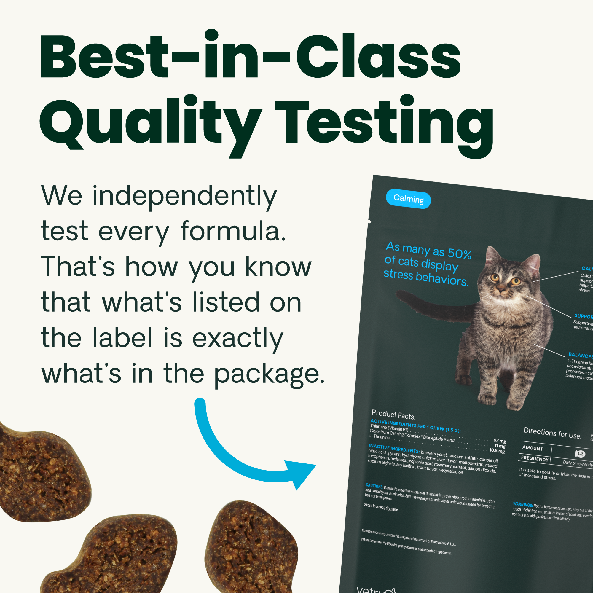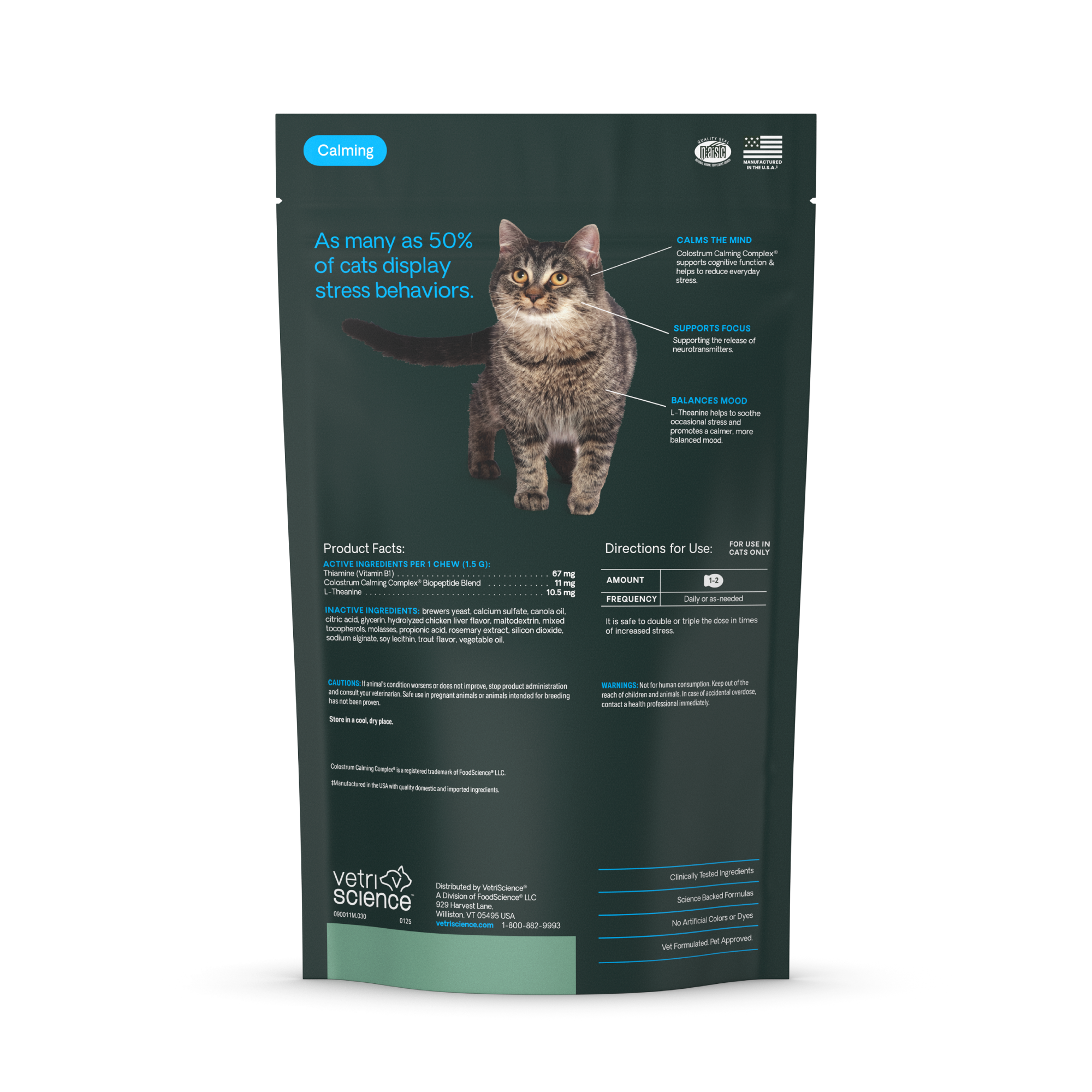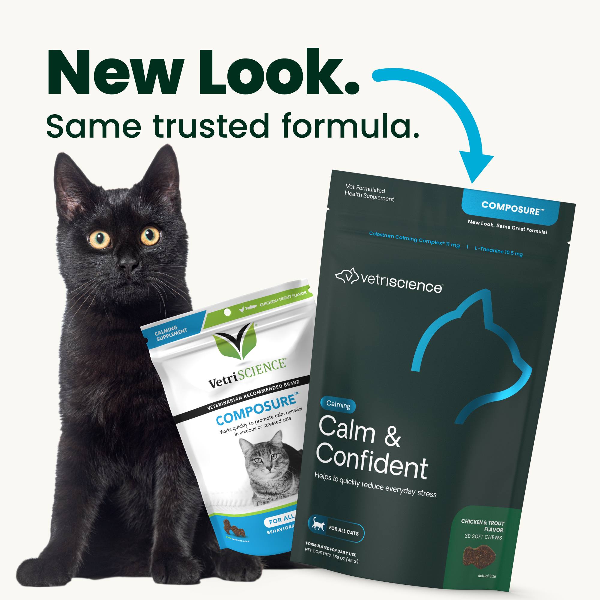 | Retail Product Description | Help remove the stress from your cat's life with VetriScience Calm & Confident (new name, same great original Composure formula). These bite-sized chews are made in the USA and designed to help calm and soothe anxiety and stress with naturally sourced ingredients like colostrum. See results in as little as 30 minutes. Use for vet visits, thunderstorms, routine changes, travel, grooming, or any stressful situation - you can even double the dose if needed. |