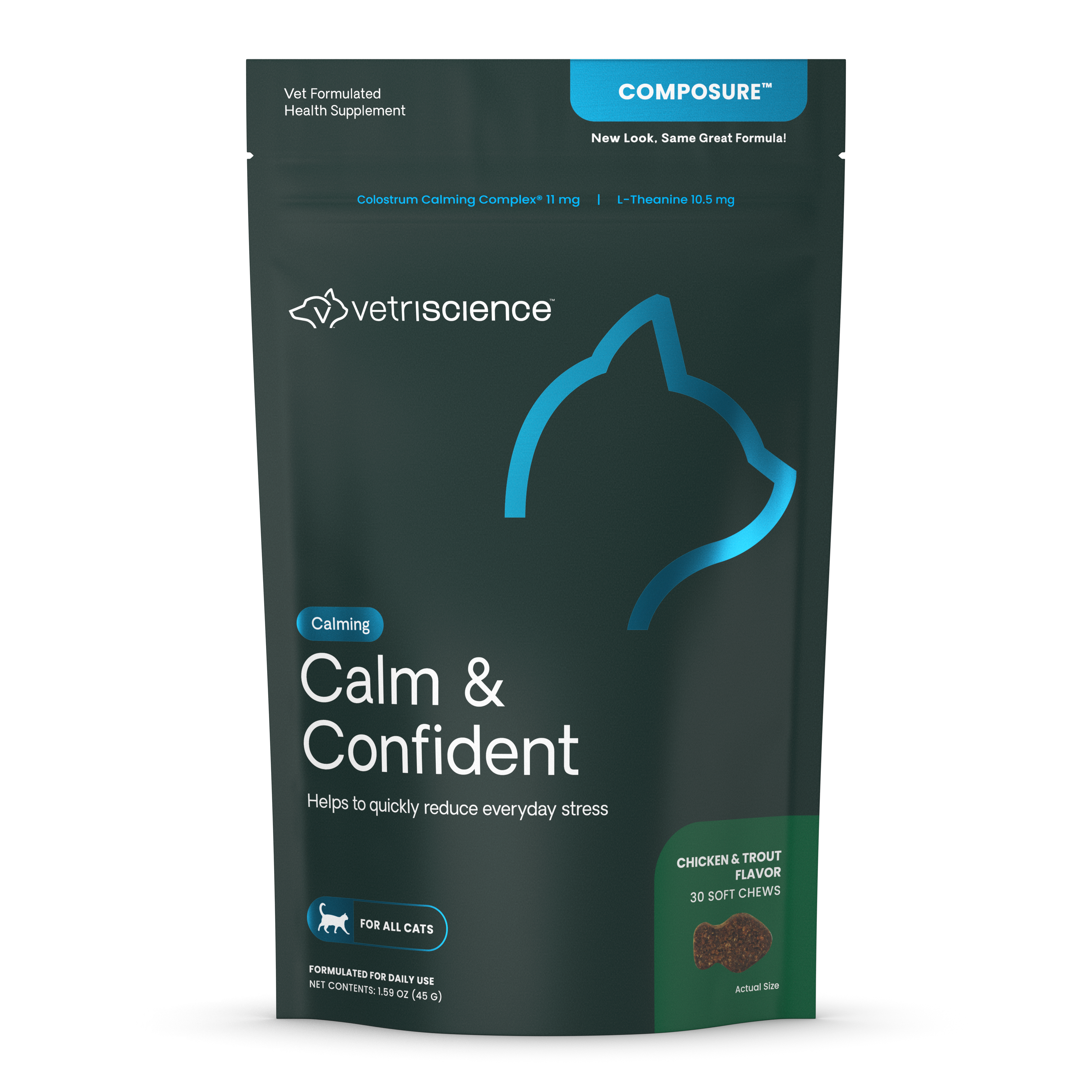 | Retail Title | VetriScience Composure Calm & Confident Chicken & Trout Flavored Chews, Calming & Anxiety Supplement for Cats, 30 count |