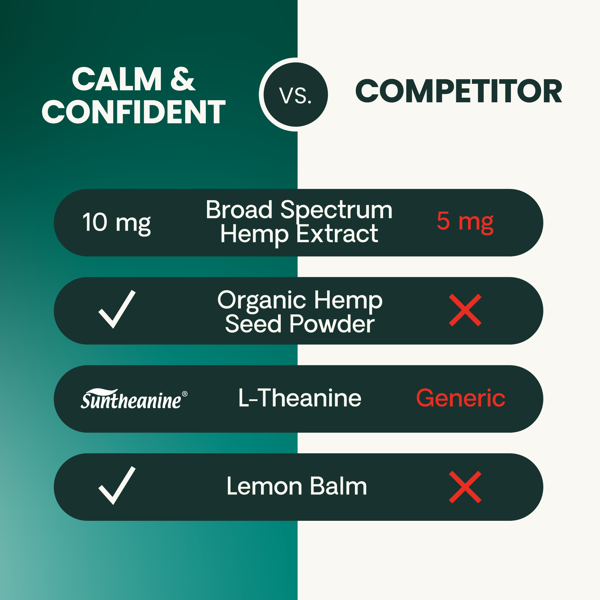 | All Ingredients | L-Theanine (Suntheanine® brand), Hemp Seed Flour, Hemp Oil, Lemon Balm Herb Powder |
