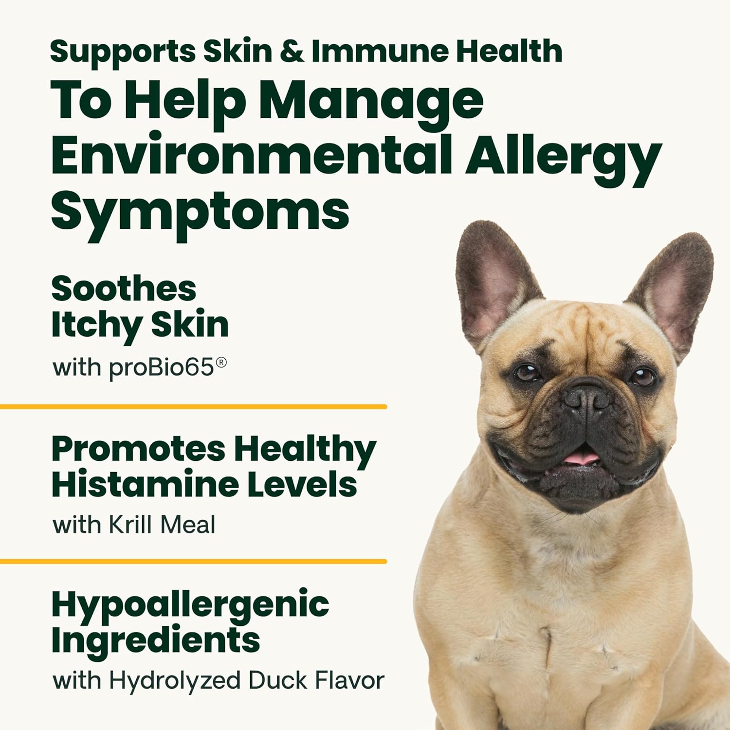 | Retail Product Description | Allergy & Itch Support (formerly Allergy Plus) is a vet-designed supplement for dogs of all ages to ease seasonal and environmental allergy symptoms while boosting immunity. Ideal for itchy skin, paw licking, or redness caused by allergens, it combines krill meal for Omega-3s and astaxanthin, Anivestin for inflammation relief, and Probio 65 probiotics to support the gut-skin connection. With a hydrolyzed duck flavor for sensitive dogs, these easy-to-give chews provide year-round or seasonal relief. |