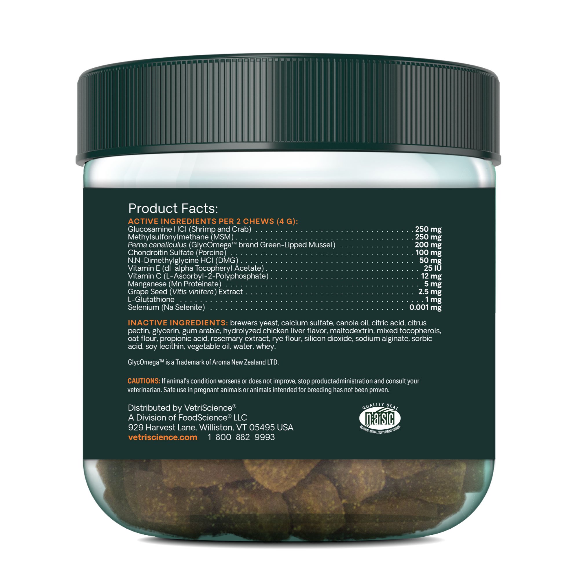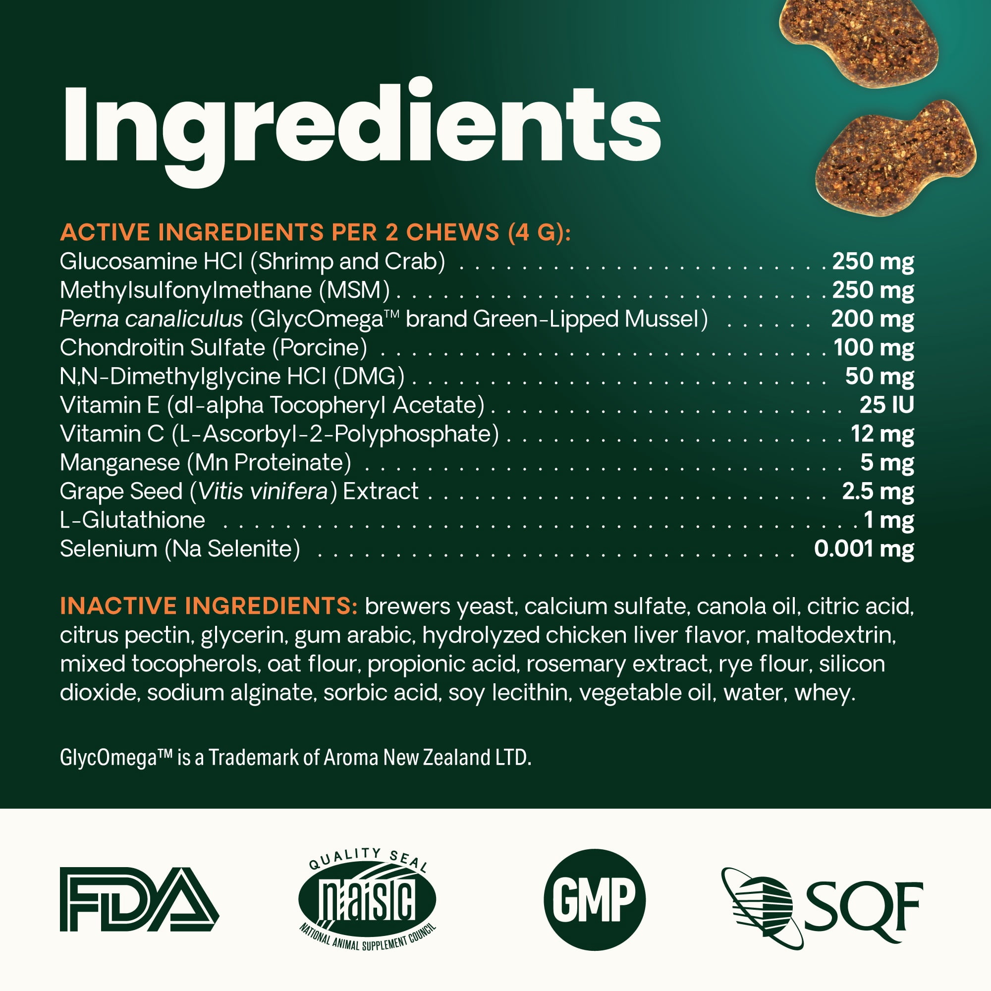 | All Ingredients | N,N-Dimethylglycine Hydrochloride, Manganese Proteinate, L-Glutathione, L-Ascorbyl 2 Polyphosphate (Vitamin C), Methylsulfonylmethane (MSM), Grape Seed (Vitis vinifera) Extract, dl-alpha Tocopheryl Acetate (Vitamin E), Perna Canaliculus, Sodium Selenite, Glucosamine Hydrochloride, Chondroitin Sulfate |