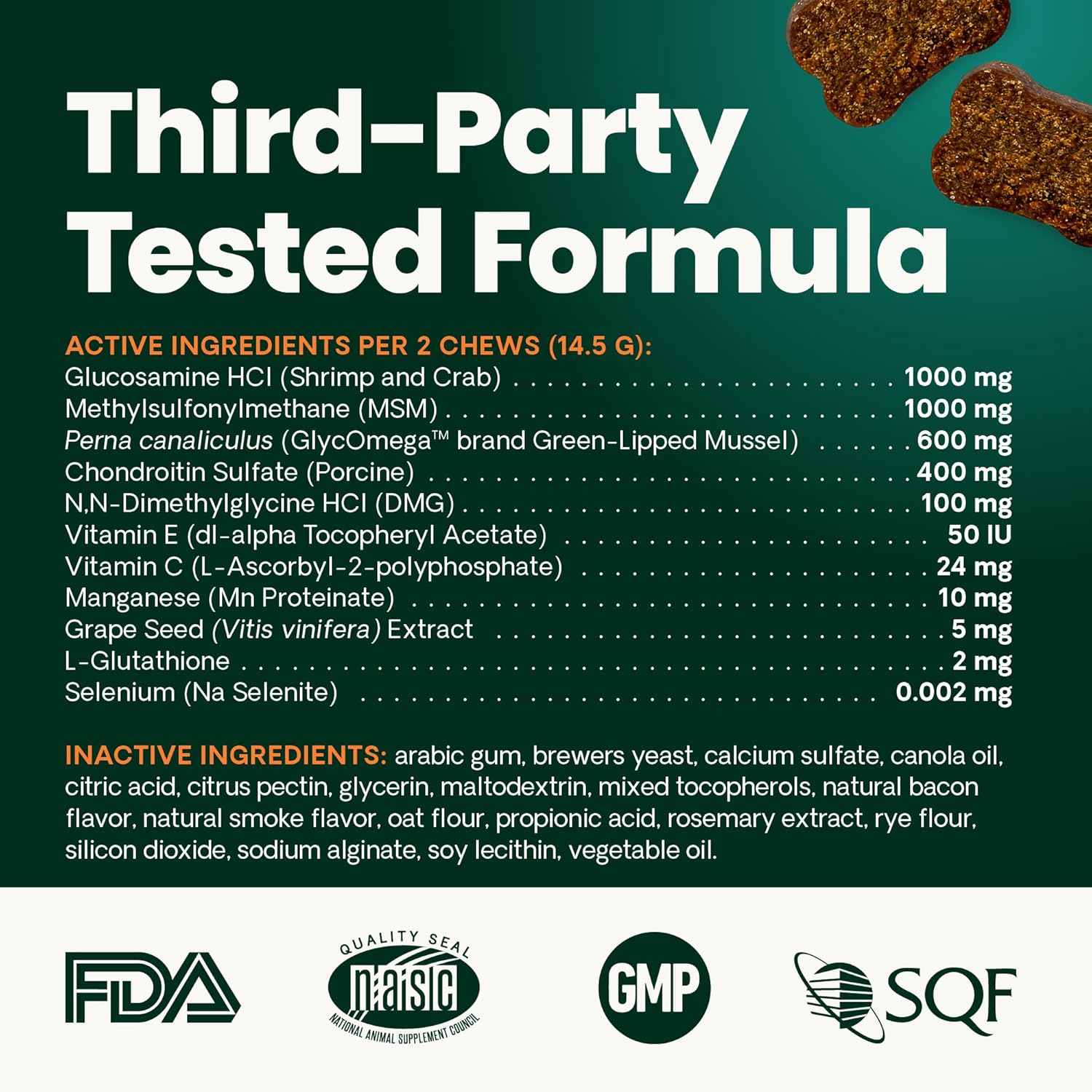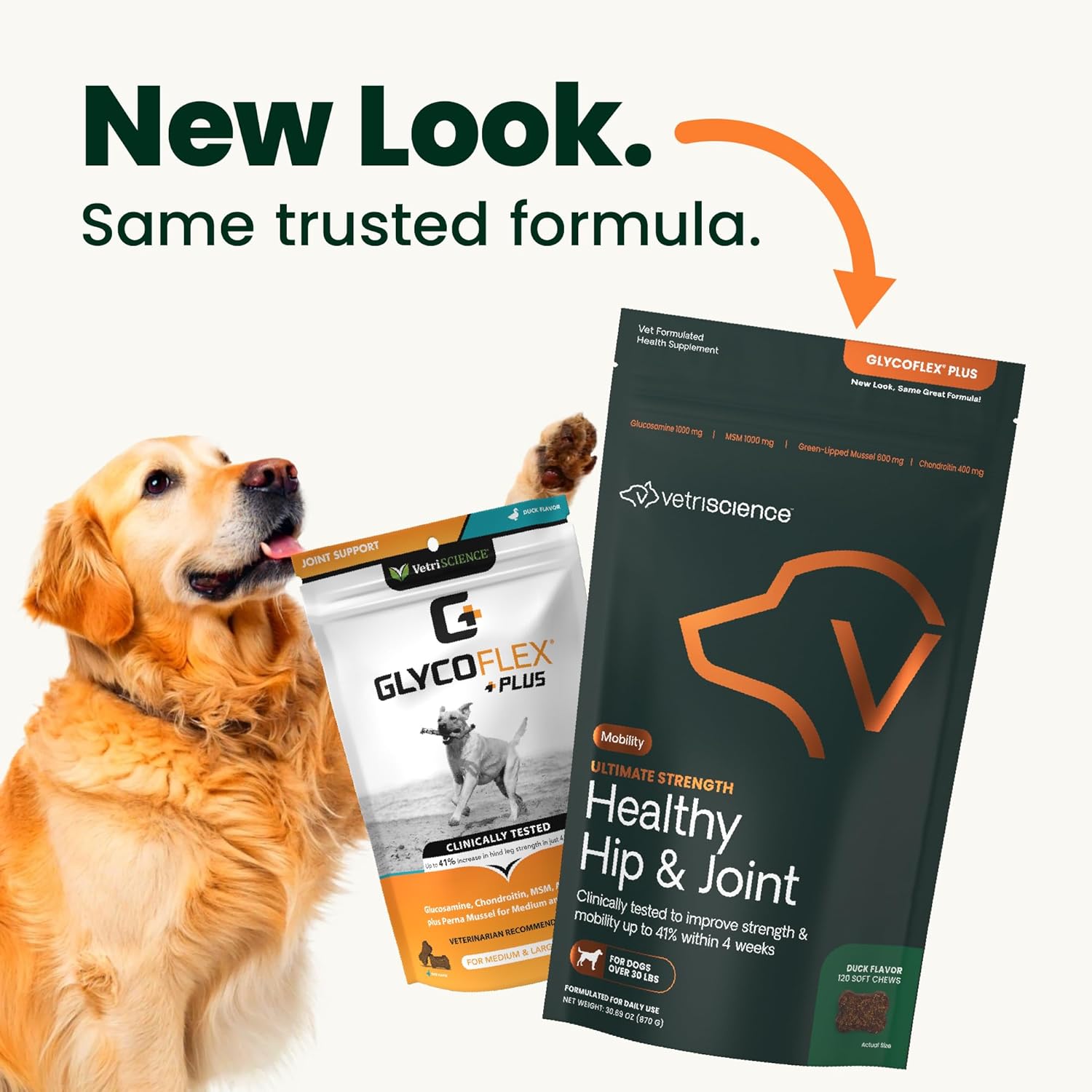 | Retail Product Description | Ultimate Strength Healthy Hip & Joint (new name, same great GlycoFlex Plus formula!) is the perfect daily joint supplement for working and sporting dogs, and all adult & senior dogs needing advanced joint support and protection. This vet-formulated joint chew for medium and large dogs is made with healthy, science-backed ingredients like glucosamine, green-lipped mussel, and chondroitin to help keep joints comfortable during everyday activities that may put stress on the body. Use daily for best results. |