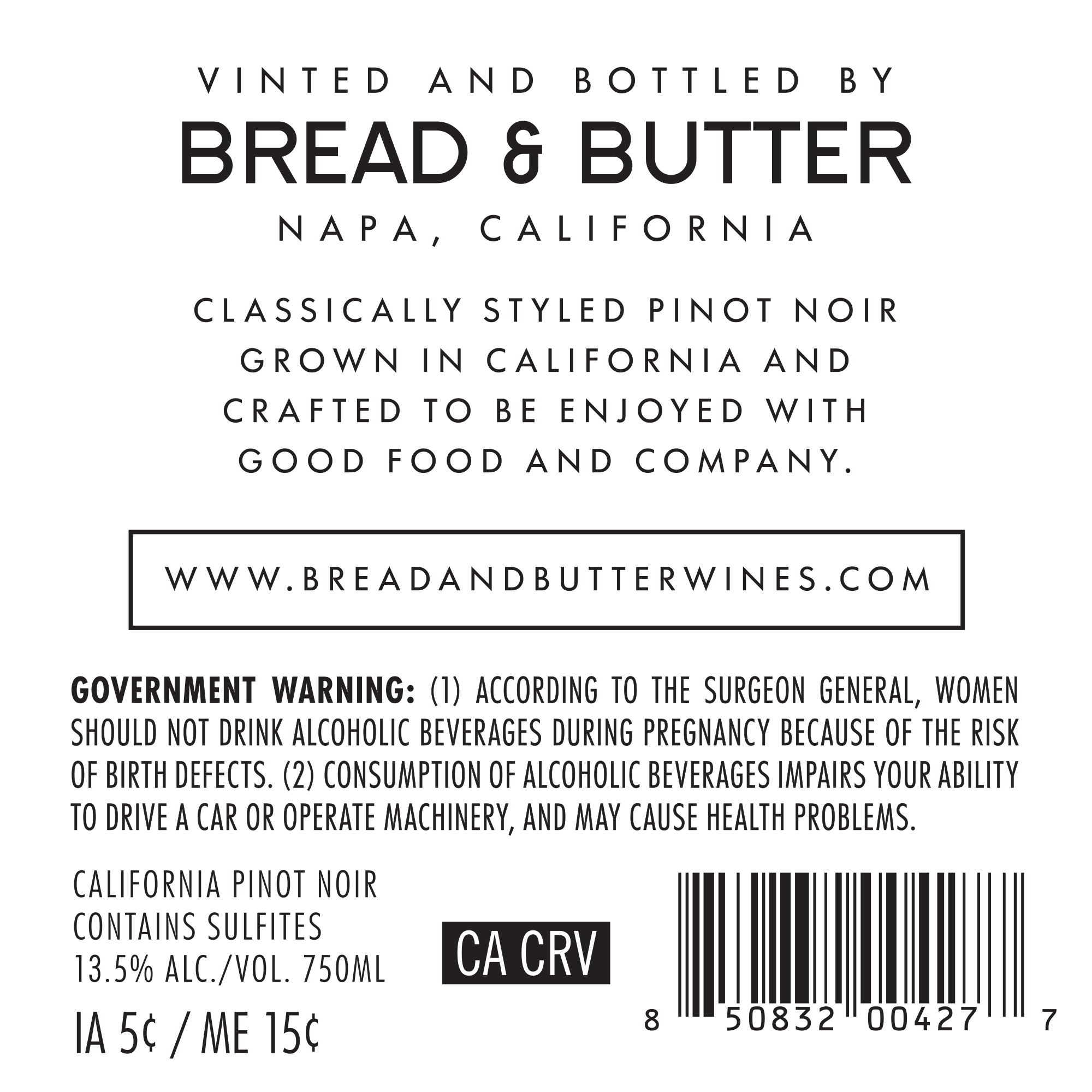 - At Bread & Butter, we believe good things shouldn’t be complicated. That’s why our wines are expertly made to be simply enjoyed. All you need to do is pour a glass, sit down, and don’t overthink it. A California Pinot Noir that is fruit-forward, delicious, and smooth. An undeniably juicy Pinot Noir bursts with cherries, raspberries, and a touch of cassis, while rich flavors of fresh fruit seamlessly join forces with sweet spice to craft a beautifully long, smooth finish filled with sweet vanilla.
