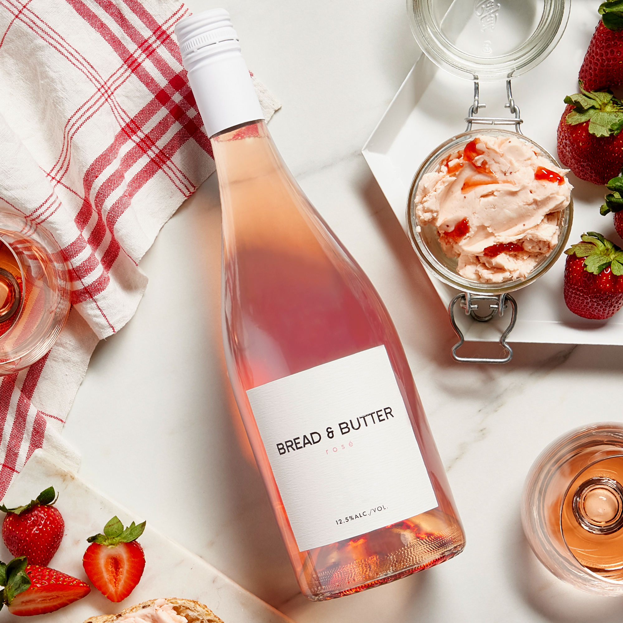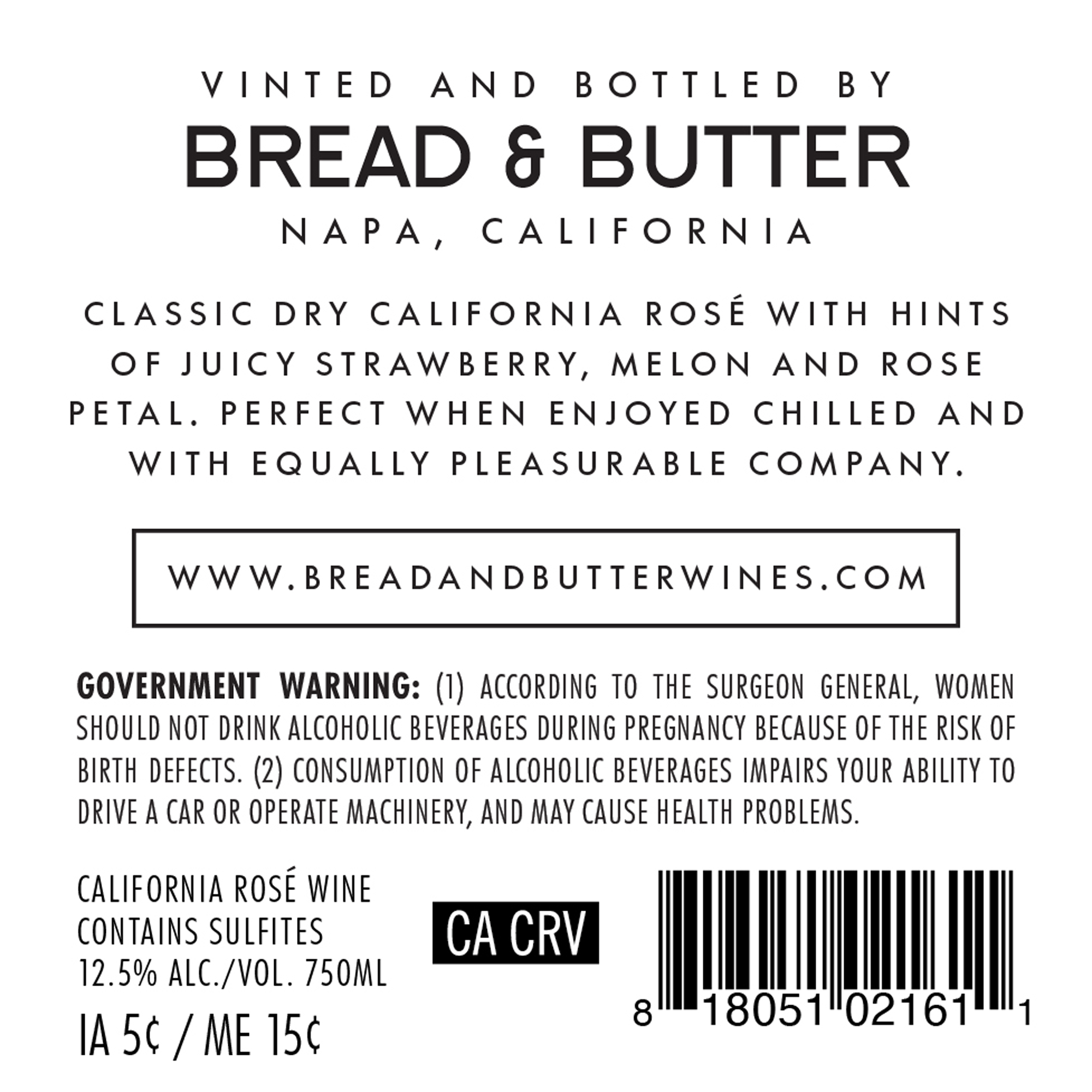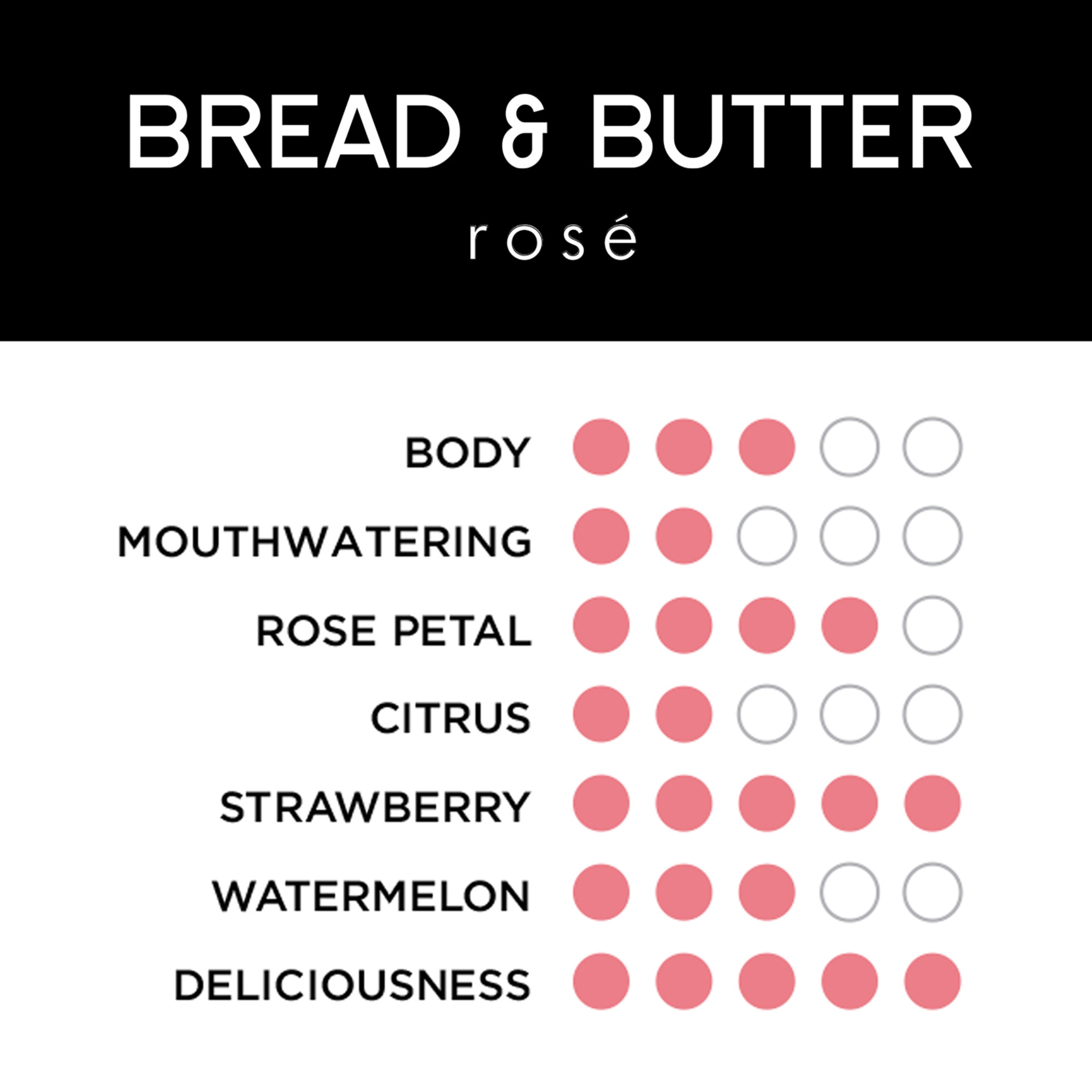 - At Bread & Butter, we believe good things shouldn’t be complicated. That’s why our wines are expertly made to be simply enjoyed. All you need to do is pour a glass, sit down, and don’t overthink it. This California Rosé is bright, fresh, and juicy. Refreshing with generous notes of fresh strawberry, melon and rose petals, juicy red fruit flavors are complemented by bright acidity and a rich, lively finish.