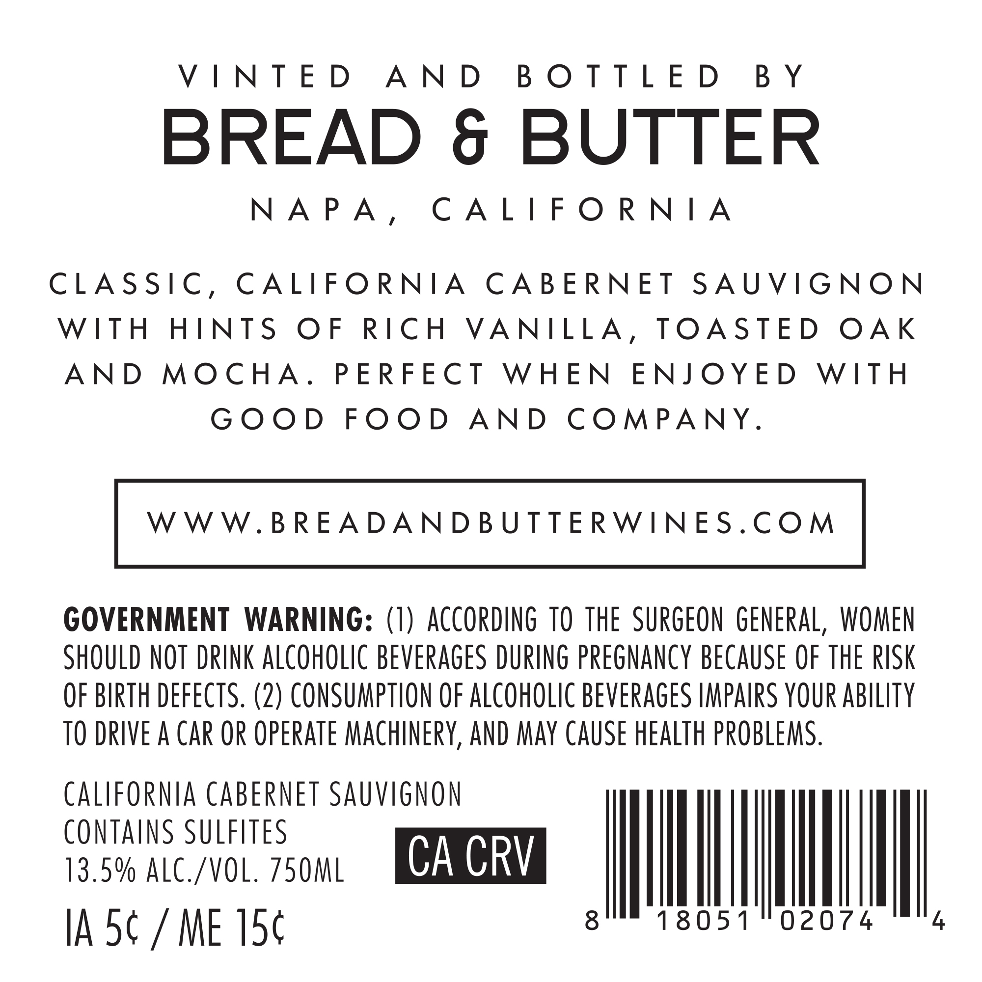 - At Bread & Butter, we believe good things shouldn’t be complicated. That’s why our wines are expertly made to be simply enjoyed. All you need to do is pour a glass, sit down, and don’t overthink it. A California Cabernet Sauvignon that is ripe, luscious and bold. This robust wine charms with layers of mocha, fresh berries, blackcurrant and subtle black pepper, toasted oak and rich vanilla.