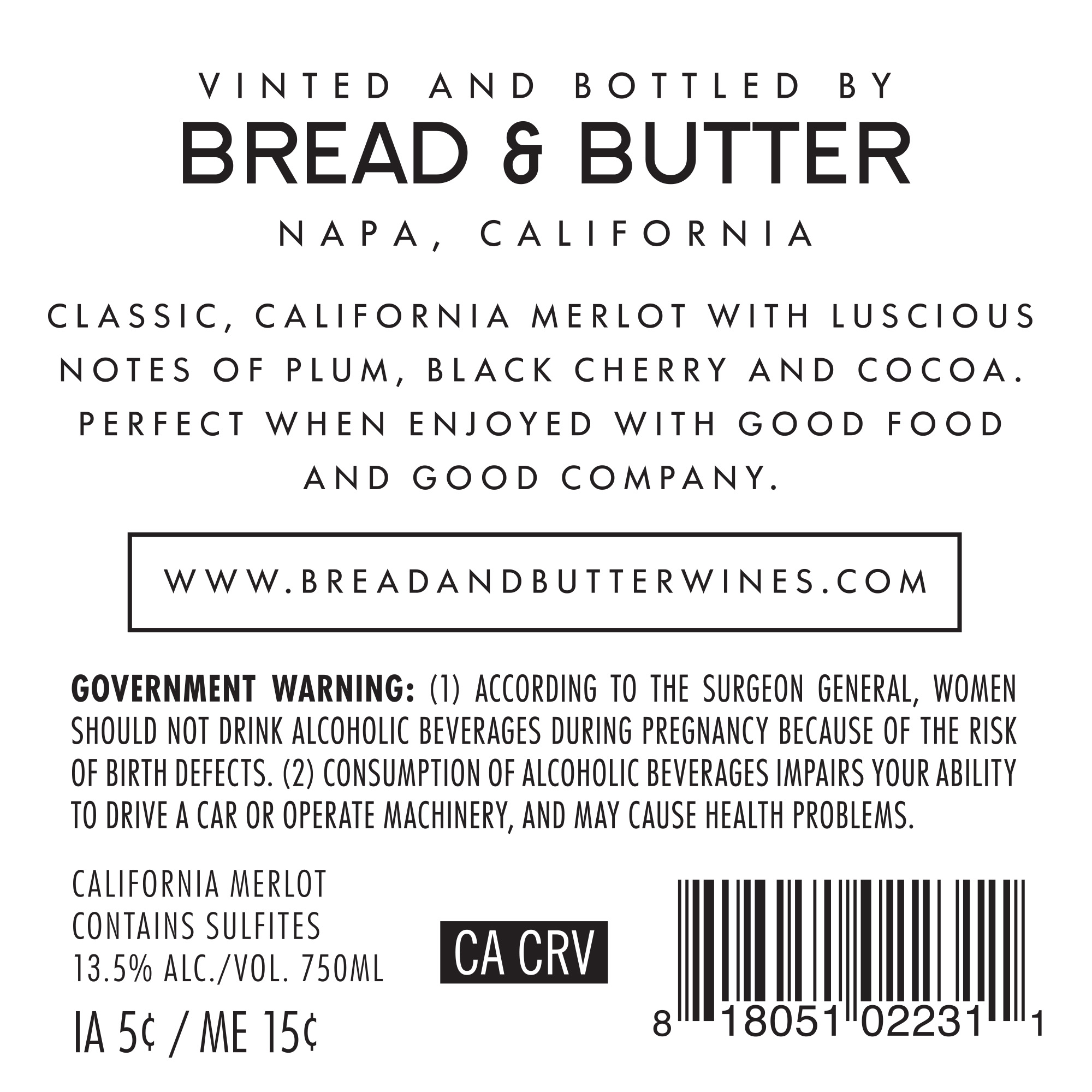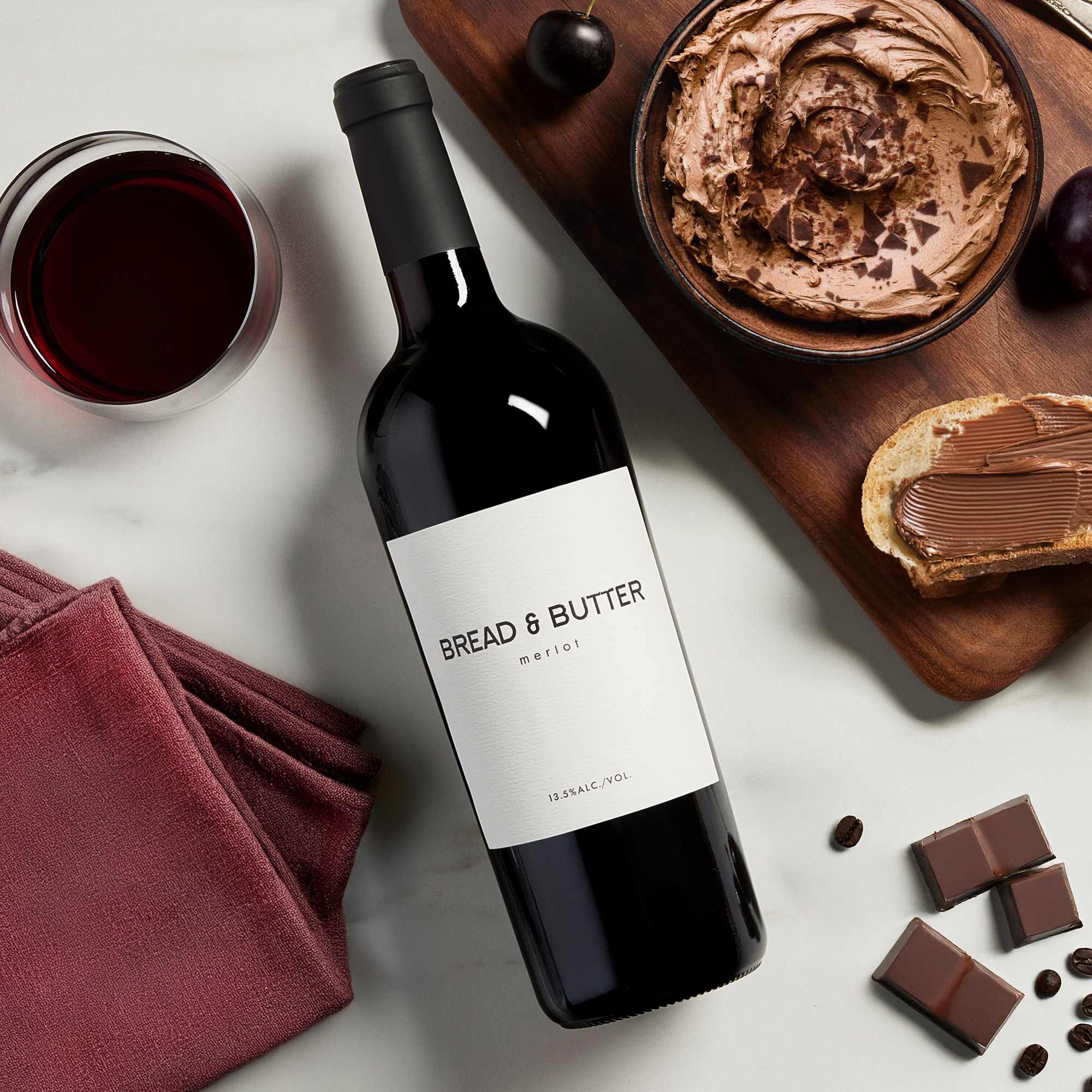 - At Bread & Butter, we believe good things shouldn’t be complicated. That’s why our wines are expertly made to be simply enjoyed. All you need to do is pour a glass, sit down, and don’t overthink it. A California Merlot that is rich, soft and decadent. Savor the elegance of a beautifully balanced and approachable Merlot, revealing expressive notes of rich plum, dark cherry, and sweet baking spice. Soft and easy-drinking, chocolate and sweet vanilla notes unfold and delight on the finish.