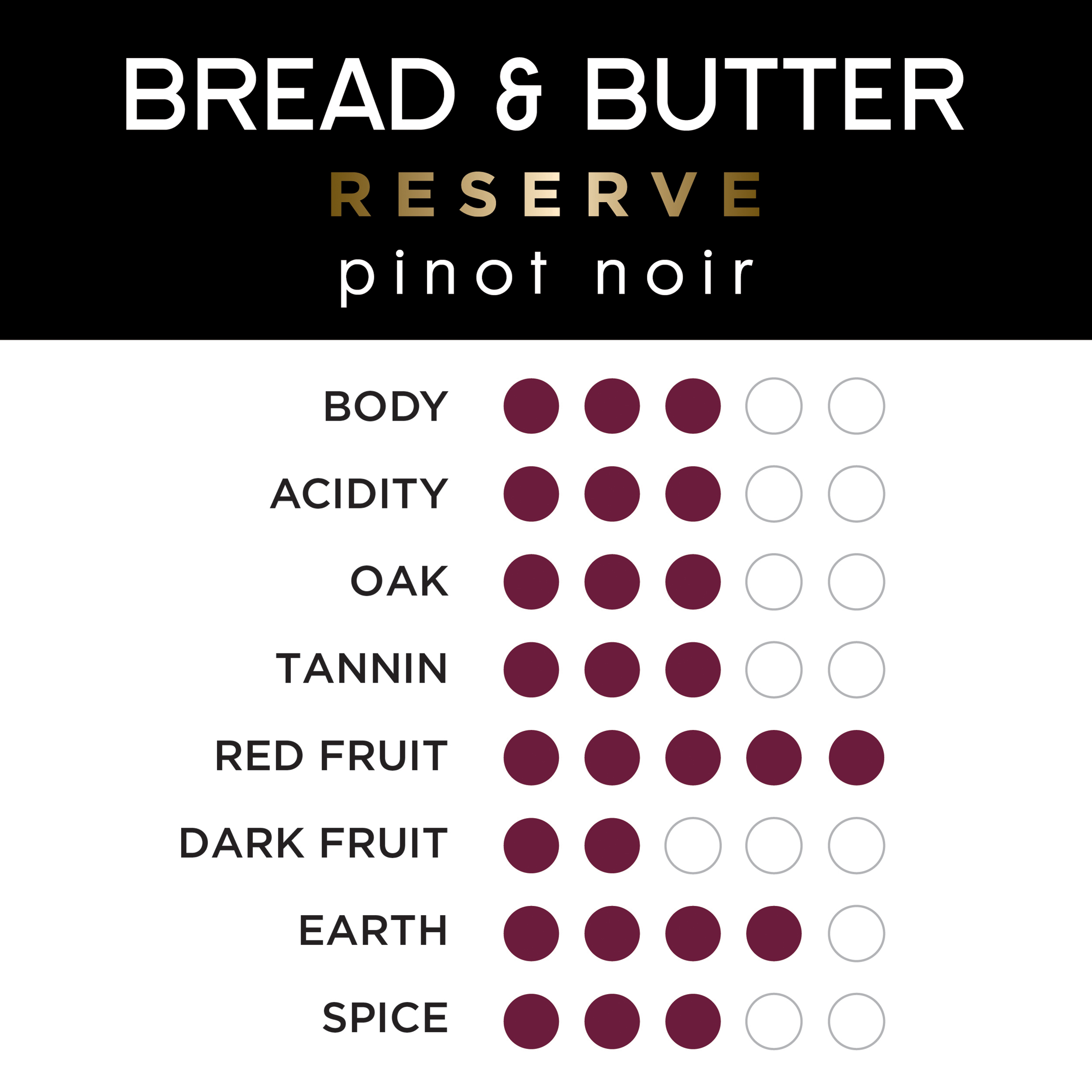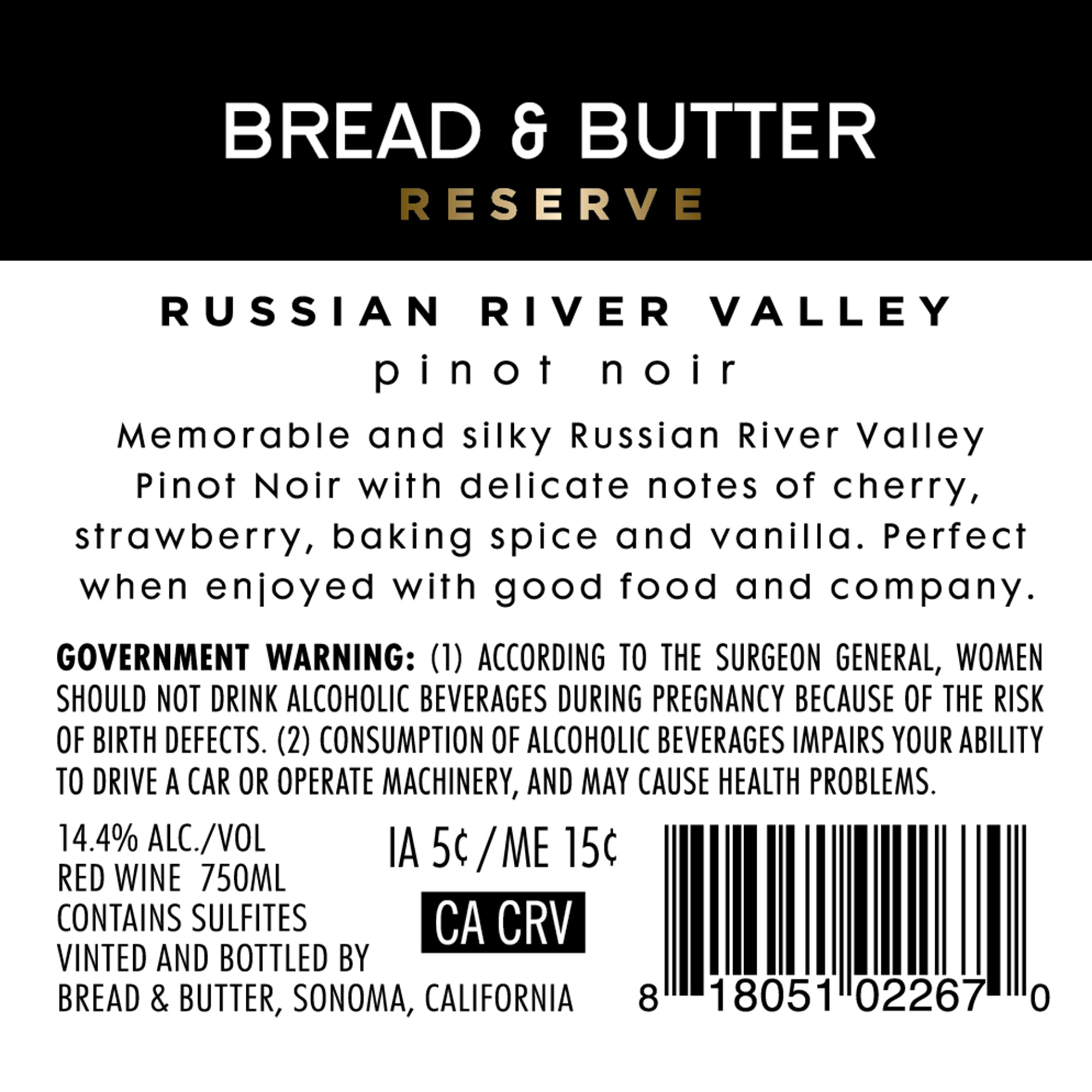 - At Bread & Butter, we believe good things in life shouldn’t be complicated. Good things should just be, well, good. Good, honest, and delicious. And uncomplicated.This Reserve Russian River Valley Pinot Noir is densely-delicious, silky, and memorable.Indulge in the delicate and silky fusion of bing cherry, sweet rhubarb, and strawberry notes, intertwined with aromas of earthy forest floor and baking spices, all culminating in a finish highlighted by bright acidity that makes every sip linger.