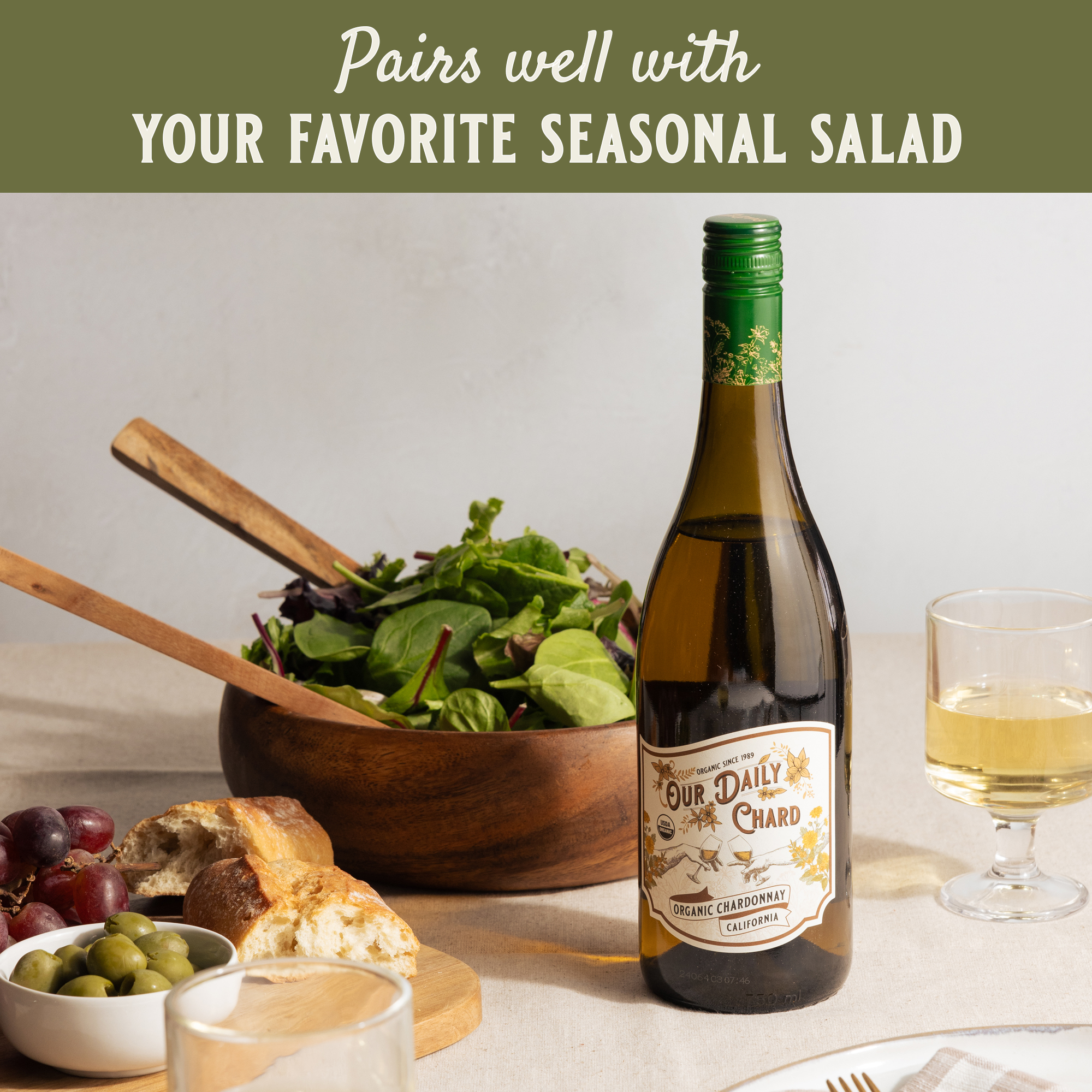 Product Short Description Our Daily Chardonnay is a layered and rich white wine that pairs wonderfully with roasts and summer salads. Product Long Description Our Daily Wines are USDA Organic, meeting the highest standards in producing organic wine. Crafted without added preservatives, our wines allow the grapes to shine through in a delicious expression of the vineyards in which they’re grown. Food Pairings (short) Enjoy with a thyme roasted chicken, grilled vegetables, or as a vegan option, a summer salad with peaches, spinach and avocado. Tasting Notes Aromatics of juicy pear and coconut are layered with hints of toasty vanilla oak and baking spice. Occasions Organic sips, Grilled chicken dinner, Easy sipping, Warm weather white, Clean label white wine, Simple weeknight pairing, Wellness-inspired wine, Crisp afternoon glass, Chill dinner companion Keywords Broad Wine Terms: organic Chardonnay, USDA Organic wine, daily organic white wine, preservative-free Chardonnay, sustainable Chardonnay, California organic wine, 12.5% alcohol Chardonnay, eco-friendly wine, FSC certified wine, natural white wine, no added sulfates, gluten free, vegan Tasting: coconut notes, pear notes wine, sweet oak aroma, vanilla scent wine, baking spice notes, layered Chardonnay flavors, creamy white wine, balanced organic Chardonnay, fresh white wine, smooth Chardonnay Trendy/Food: wine with roasted chicken, organic wine for meals, everyday white wine, healthy lifestyle wine, sustainable wine pairing, versatile white wine, light white wine, wine for casual dining, easy drinking Chardonnay, organic wine for food pairing Varietal CHARDONNAY Appellation CALIFORNIA Alcohol % 12.5 Size 750 UOM ml Net Content 750 ml Unit Type Bottle Vintage 2023 Vintage Specific No Bottle Height (in) 11.63 Bottle Diameter (in) 3.2 Case Length (in) 13.40 Case Width (in) 10.05 Case Height (in) 11.9 Case Weight (lbs) 33.00 Units per Case 12 Cases Per Layer 4 Layers Per Pallet 14 RNDC Supplier Product Number 330121 ABC Fine Wine & Spirits SKU 627255 ABC Fine Wine & Spirits PDP Link https://abcfws.com/our-daily-chardonnay/627255 DoorDash ID 00839728009305 DoorDash PDP Link https://www.doordash.com/products/our-daily-chard-organic-chardonnay-bottle-california-750-ml/urpc_38bb38c7-a2e6-492a-a30a-db83d41b4ea1 Instacart ID 16264820 Instacart PDP Link https://www.instacart.com/products/16264820 Kroger UPC 0083972800930 Kroger PDP Link https://www.kroger.com/p/our-daily-chard-chardonnay/0083972800930 Publix ID RIO-PCI-617228 Publix PDP Link https://www.publix.com/pd/RIO-PCI-617228 Uber Eats ID 839728009305 Uber Eats PDP Link https://www.ubereats.com/product/b/0f48ddec-1e3c-586e-a4fc-87fc05551acb Whole Foods Market ID b0713qb285 Whole Foods Market PDP Link https://www.wholefoodsmarket.com/product/b0713qb285