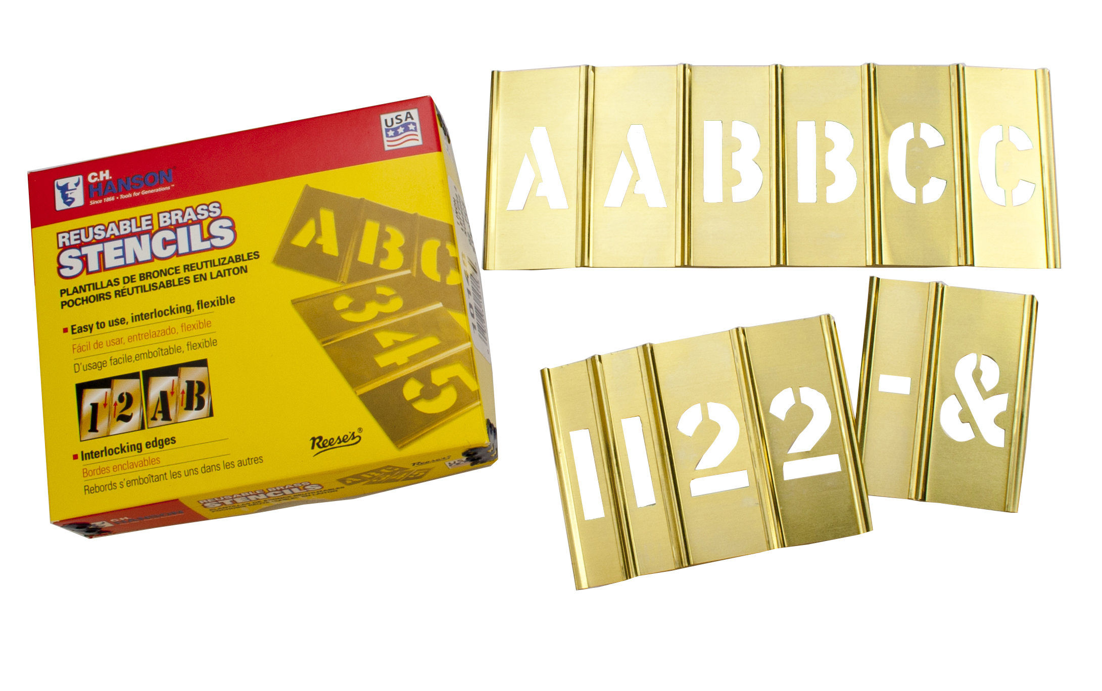 Product ID 10106 Product Name Stencil Set-Letter/Number 1/2" Brass 77 Pieces Product Copy If time is truly a test of one’s quality, effectiveness, and end-all character, then C.H. Hanson brass stencils have earned their place at the top of the hand tool list. Since 1866, our company has been manufacturing the highest quality and most accurate stencils for the professional and novice alike. Our traditional Reese® interlocking brass stencils are perfect for marking crates, pallets, boxes, aisles, floors and much more. The durable 28-gauge material will stand up to demanding applications and quickly clean up with paint thinner or ink solvent since brass naturally resists chemical deterioration and corrosion.Choose from a wide variety of sets or individual letters and numbers. Stock items include character sizes from 1/2 inch all the way up to 12 inches. And if one of our many stock items doesn’t fit your needs, we can easily develop a custom solution just for you. What’s in the box: 77 pieces as follows: AA BB CC DD EE FF GG HH II JJ K LL MM NN OO PP Q RR SS TT UU VV WW X Y Z, 11 22 33 44 55 66 77 88 99 00 1-Beginner, 1-Plain Ender, 2-Spacers, 1-Comma, 1-Dash, 2-Period, 1-Period Ender,1-Ampersand, 1-Apostrophe. Product Features Rugged 28-gauge brass construction for durability and long life. Stencils resist chemical deterioration and clean up with ink or paint solvents. Available in sets or individual characters. Traditional Reeses® alignment edges make connecting individual characters easy. With proper care, can last a lifetime. All CH Hanson stencils are proudly made in the USA with USA sourced brass. Application To mark in a consistant format Warranty Limited lifetime warranty UPC 081834101064 Catalog Marking Sub Category Interlocking Brass Stencils Country of Origin United States of America Brand C.H. Hanson Stock UOM Each