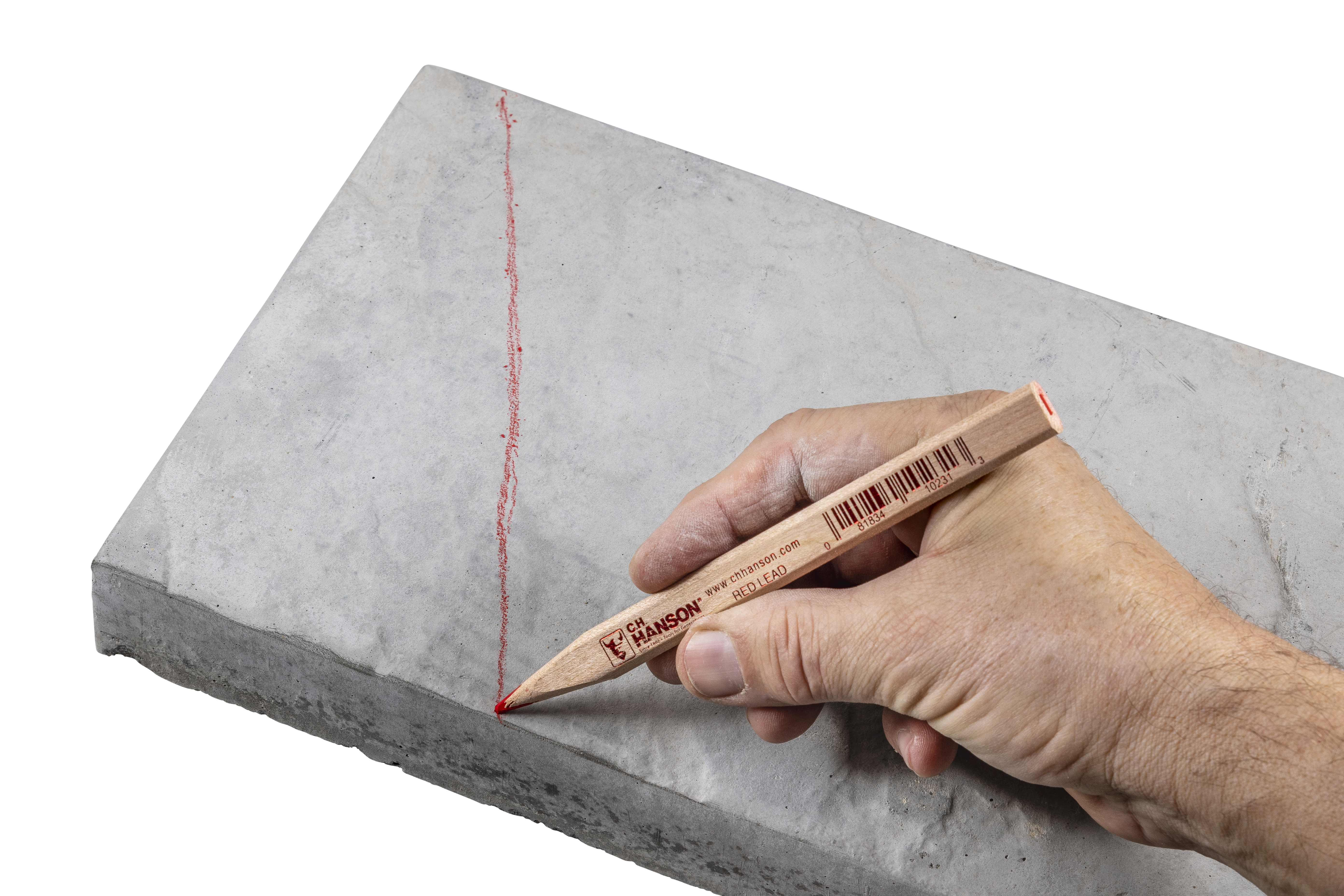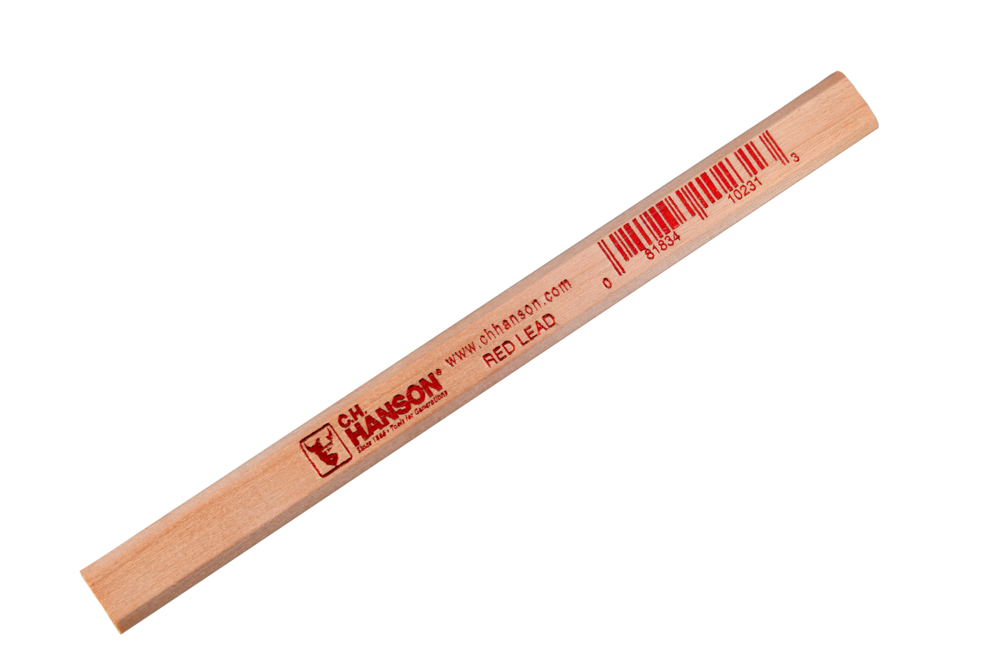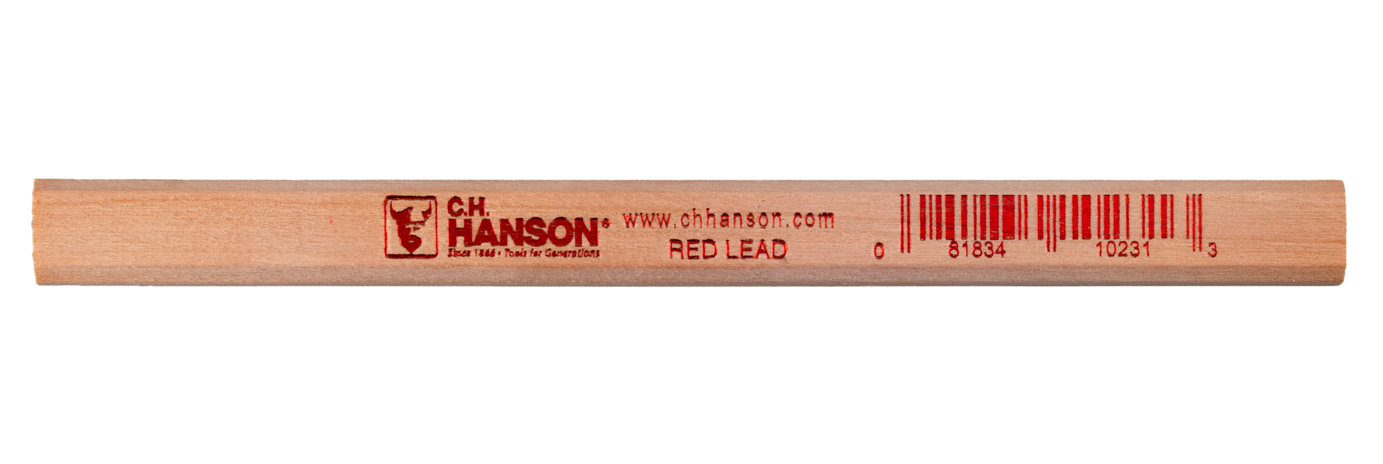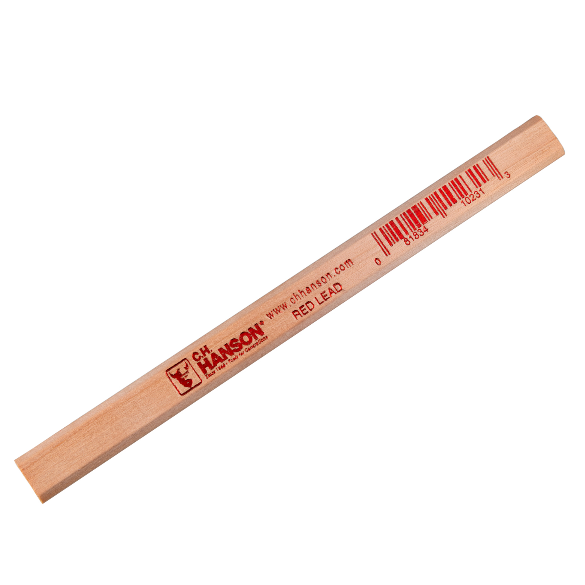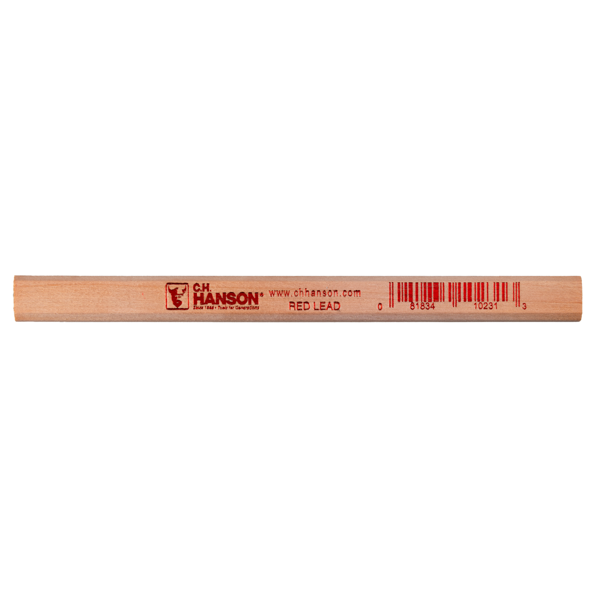 Product ID 10231 Product Name Carpenter Pencil-Red Lead Product Copy C.H. Hanson's Red Lead Carpenter Pencil fits your need for a strong and durable pencil. This oversized pencil has flat surfaces, easily fitting into your hand and never rolls away. It easily marks fine lines, molding, saw lines, drill points, and the like. Product Features Perfect for marking saw lines, molding, drill points, and more.Flat side to prevent from rolling.Creates a sturdy point.Fits in your pocket.Medium lead.Proudly made in the USA. Application Pencil for fine line marking Warranty Limited lifetime warranty UPC 081834102313 GTIN 30081834102314 Catalog Marking Sub Category Pencils Crayons Markers Country of Origin United States of America Brand C.H. Hanson Stock UOM Each