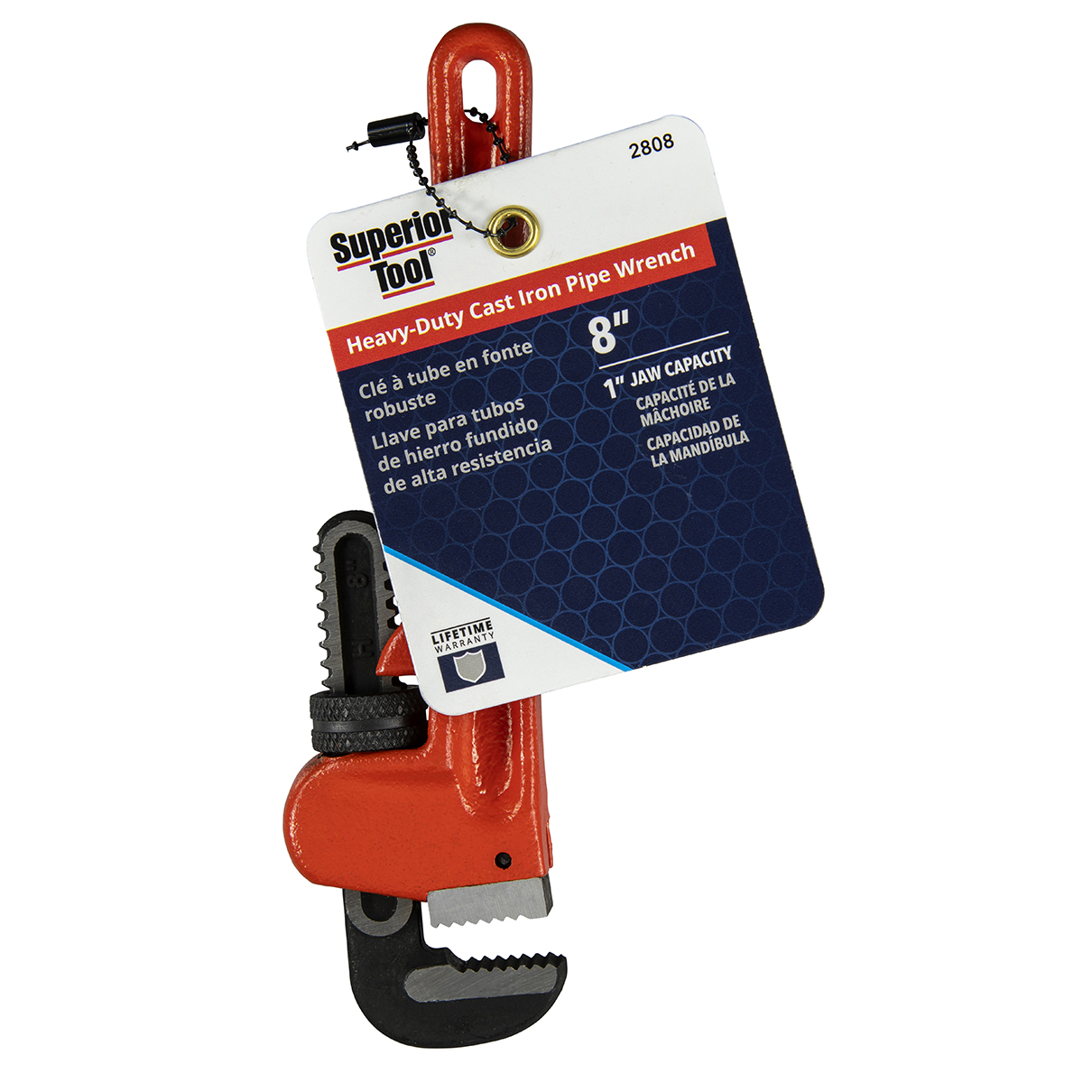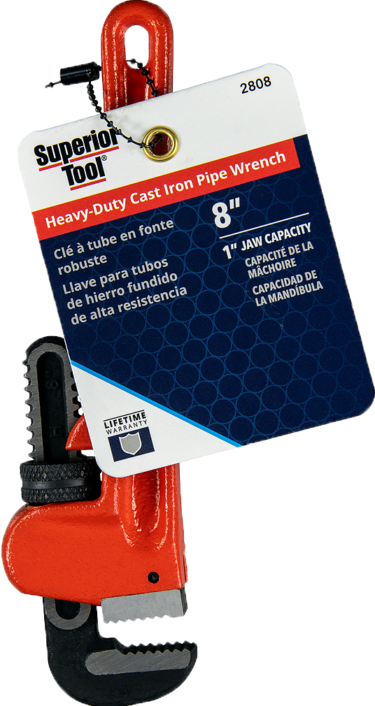 Brand Superior Tool Product ID 2808 Product Name 8“ Heavy-Duty Straight Cast-Iron Pipe Wrench Product Copy Superior Tool's® Heavy-Duty Straight Cast-Iron Pipe Wrench is durable, easy-to-adjust and performs flawlessly in the toughest plumbing situations. Its smooth adjustable nut allows for effortless adapting to pipe sizes up to 1". Constructed with sharp teeth for a superior grip on the pipe. Heavy-duty, well-balanced handle provides excellent leverage for even the most stubborn of pipes. Product Features Constructed with heavy-duty, ductile cast-iron. Drop-forged Chromium-molybdenum hook jaw for maximum pipe grip. Rugged teeth. Knurled adjustable nut smoothly adjusts wrench to pipe size. Pipe capacity: 1/8" to 1"; hook jaw marked with pipe sizes. UPC 017197028083 GTIN 10017197028080 Catalog Wrenches & Pliers Category Plumbing-Tools & Wrenches Sub Category Cast Iron Wrenches Country of Origin China Warranty Limited lifetime warranty Stock UOM Each Video link https://youtu.be/Xa1fGAu3uRQ?si=s0zbZY3yQVSTf-4g Product Height (inches) 7.28 Product Length (inches) 0.9 Product Width (inches) 1.94 Product Weight (lbs) 0.792 Inner Pack Qty. 1 Master Pack Height (inches) 7.88 Master Pack Length (inches) 2.2 Master Pack Width (inches) 3.94 Master Pack Weight (lbs) 4.75 Jaw Capacity 1 inch Pipe Capacity 1 inch Wrench Length 8 inch Wrenches & Pliers Type Cast Iron Pipe Wrenches