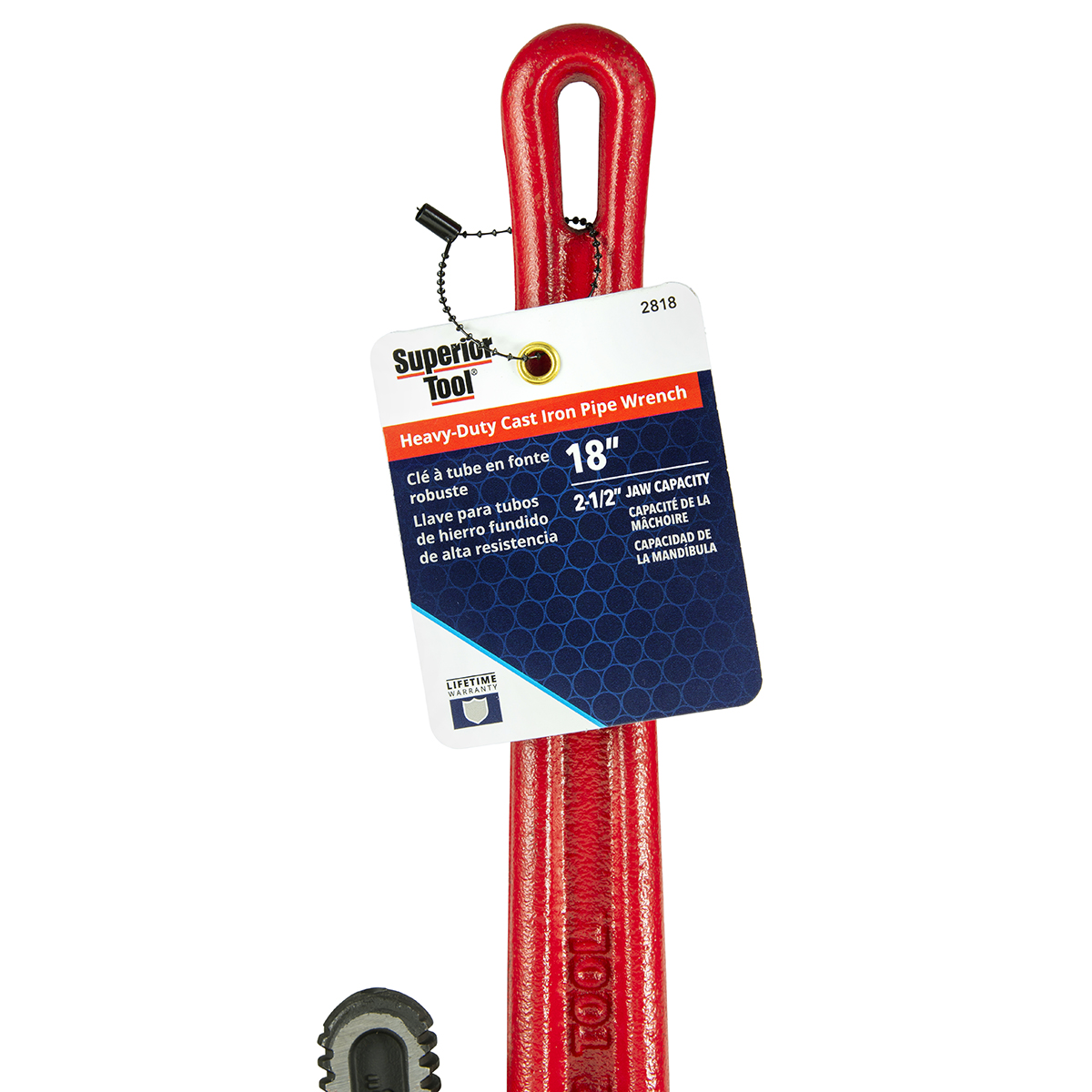 Brand Superior Tool Product ID 2818 Product Name 18“ Heavy-Duty Straight Cast-Iron Pipe Wrench Product Copy Superior Tool's® Heavy-Duty Straight Cast-Iron Pipe Wrench is durable, easy-to-adjust and performs flawlessly in the toughest plumbing situations. Its smooth adjustable nut allows for effortless adapting to pipe sizes up to 2-1/2". Constructed with sharp teeth for a superior grip on the pipe. Heavy-duty, well-balanced handle provides excellent leverage for even the most stubborn of pipes. Product Features Constructed with heavy-duty, ductile cast-iron. Drop-forged Chromium-molybdenum hook jaw for maximum pipe grip. Rugged teeth. Knurled adjustable nut smoothly adjusts wrench to pipe size.Pipe capacity: 1/2" to 2-1/2"; hook jaw marked with pipe sizes. UPC 017197028182 GTIN 30017197028183 Catalog Wrenches & Pliers Category Plumbing-Tools & Wrenches Sub Category Cast Iron Wrenches Country of Origin South Korea Warranty Limited lifetime warranty Stock UOM Each Video link https://youtu.be/Xa1fGAu3uRQ?si=s0zbZY3yQVSTf-4g Product Height (inches) 1.25 Product Length (inches) 16 Product Width (inches) 4 Product Weight (lbs) 5.7 Inner Pack Qty. 1 Inner Pack Height (inches) 2 Inner Pack Length (inches) 16.25 Inner Pack Width (inches) 4.25 Inner Pack Weight (lbs) 5.8 Master Pack GTIN 40017197028180 Master Pack Qty. 8 Master Pack Height (inches) 5 Master Pack Length (inches) 17 Master Pack Width (inches) 4 Master Pack Weight (lbs) 48 Jaw Capacity 2-1/2 inch Pipe Capacity 2-1/2 inch Wrench Length 18 inch Wrenches & Pliers Type Cast Iron Pipe Wrenches