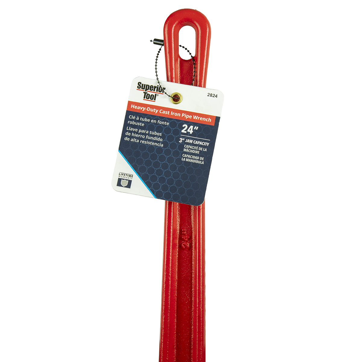 Brand Superior Tool Product ID 2824 Product Name 24“ Heavy-Duty Straight Cast-Iron Pipe Wrench Product Copy Superior Tool's® Heavy-Duty Straight Cast-Iron Pipe Wrench is durable, easy-to-adjust and performs flawlessly in the toughest plumbing situations. Its smooth adjustable nut allows for effortless adapting to pipe sizes up to 3". Constructed with sharp teeth for a superior grip on the pipe. Heavy-duty, well-balanced handle provides excellent leverage for even the most stubborn of pipes. Product Features Constructed with heavy-duty, ductile cast-iron. Drop-forged Chromium-molybdenum hook jaw for maximum pipe grip. Rugged teeth. Knurled adjustable nut smoothly adjusts wrench to pipe size. Pipe capacity: 3/4" to 3"; hook jaw marked with pipe sizes. UPC 017197028243 GTIN 10017197028240 Category Plumbing-Tools & Wrenches Sub Category Cast Iron Wrenches Country of Origin China Warranty Limited lifetime warranty Stock UOM Each Video link https://youtu.be/Xa1fGAu3uRQ?si=s0zbZY3yQVSTf-4g Product Height (inches) 21.75 Product Length (inches) 1.65 Product Width (inches) 4.3 Product Weight (lbs) 8 Inner Pack Qty. 1 Master Pack Height (inches) 1.65 Master Pack Length (inches) 4.3 Master Pack Width (inches) 22 Master Pack Weight (lbs) 8.19 Jaw Capacity 3 inch Pipe Capacity 3 inch Wrench Length 24 inch Wrenches & Pliers Type Cast Iron Pipe Wrenches