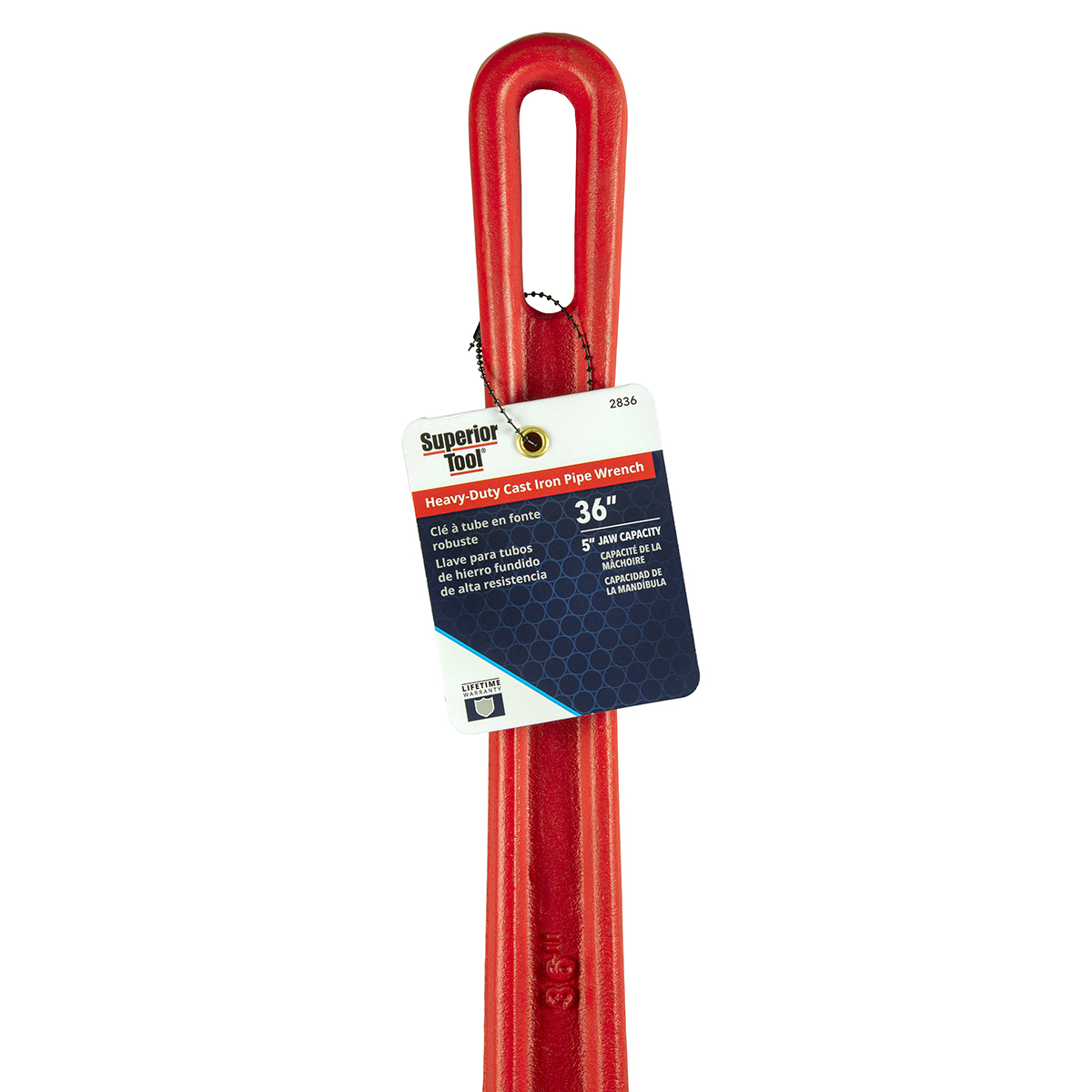 Brand Superior Tool Product ID 2836 Product Name 36“ Heavy-Duty Straight Cast-Iron Pipe Wrench Product Copy Superior Tool's® Heavy-Duty Straight Cast-Iron Pipe Wrench is durable, easy-to-adjust and performs flawlessly in the toughest plumbing situations. Its smooth adjustable nut allows for effortless adapting to pipe sizes up to 5". Constructed with sharp teeth for a superior grip on the pipe. Heavy-duty, well-balanced handle provides excellent leverage for even the most stubborn of pipes. Product Features Constructed with heavy-duty, ductile cast-iron. Drop-forged Chromium-molybdenum hook jaw for maximum pipe grip. Rugged teeth. Knurled adjustable nut smoothly adjusts wrench to pipe size. Pipe capacity: 5"; hook jaw marked with pipe sizes. UPC 017197028366 GTIN 10017197028363 Catalog Wrenches & Pliers Category Plumbing-Specialty Tools Sub Category Cast Iron Wrenches Country of Origin China Warranty Limited lifetime warranty Stock UOM Each Video link https://youtu.be/Xa1fGAu3uRQ?si=s0zbZY3yQVSTf-4g Product Height (inches) 31.5 Product Length (inches) 1.81 Product Width (inches) 5.5 Product Weight (lbs) 17.9 Inner Pack Qty. 1 Master Pack Height (inches) 2.14 Master Pack Length (inches) 5.5 Master Pack Width (inches) 29.5 Master Pack Weight (lbs) 18.16 Jaw Capacity 5 inch Pipe Capacity 5 inch Specialty Tools Type Sink Wrenches Wrench Length 36 inch
