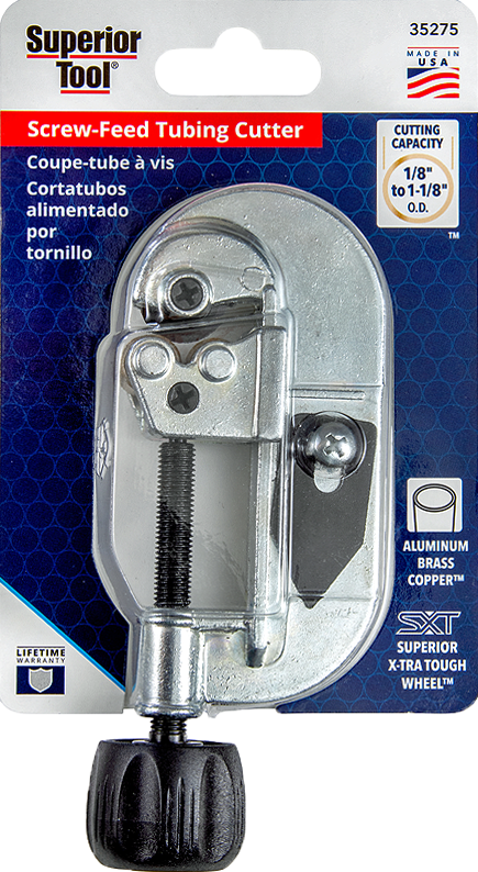 Brand Superior Tool Product ID 35275 Product Name 1-1/8“ O.D. Screw-Feed Tubing Cutter Product Copy Superior Tool's® 1-1/8“ O.D. Screw-Feed Tubing Cutter cuts and deburrs a variety of tubes and materials up to 1-1/8". Its fine-pitch threads provide extra torque when tightening. The heat-treated proprietary SXT™ alloy steel cutter wheel cuts smoothly and is easily replaced. Replacement wheel available. Product Features Creates clean cuts on copper and aluminum . Pipe capacity: 1/8" to 1-1/8". Blade reamer attached to the tool. Corrosion-resistant, zinc-plated body. Heat-treated SXT™ alloy steel cutting wheel. Replacement SXT cutter wheel (Part 42835) available, sold separately. Proudly made in the USA. Application Copper, Aluminum, Brass UPC 017197352751 GTIN 10017197352758 Catalog Tubing Tools Category Plumbing-Tube Cutters Sub Category - Screw Feed