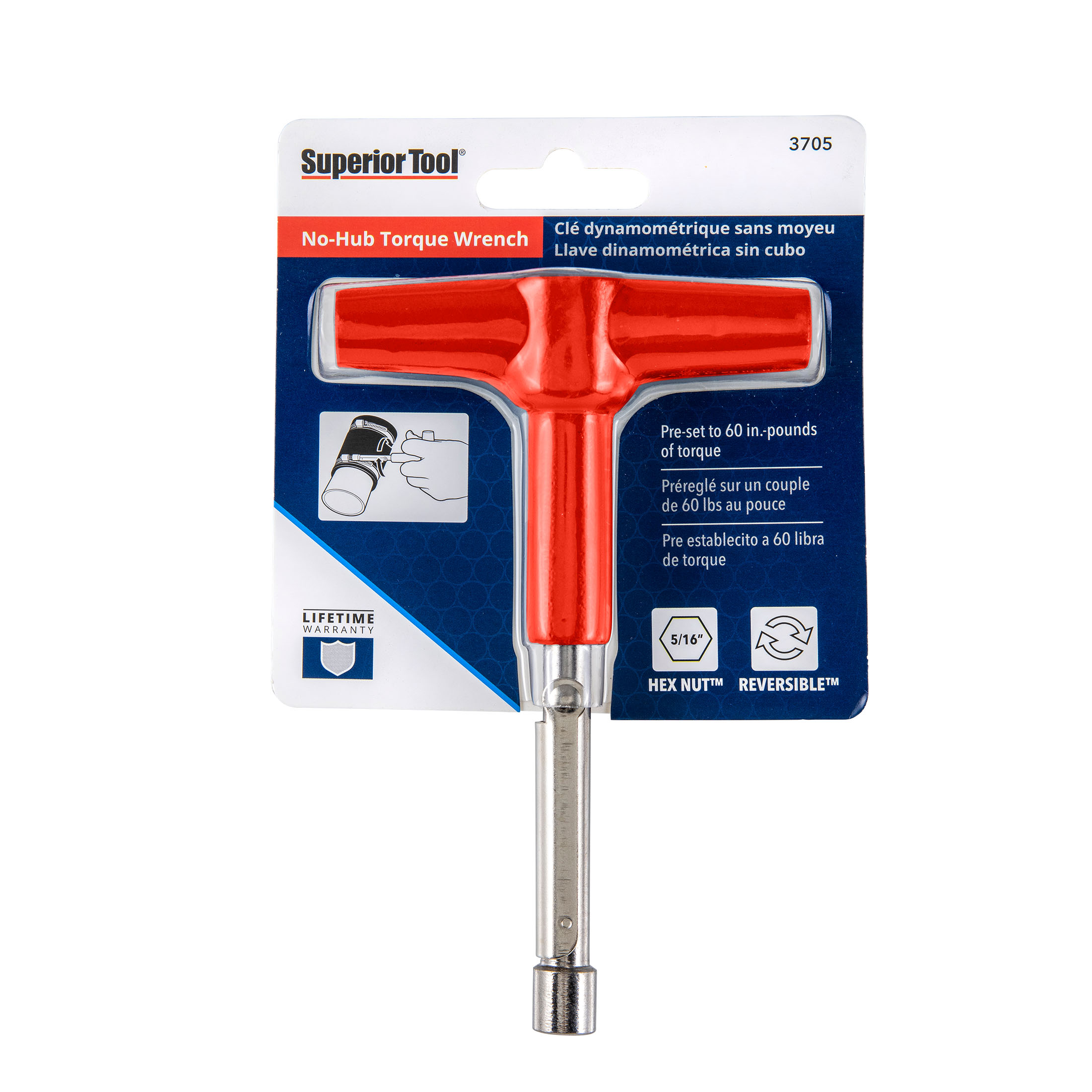 Brand Superior Tool Product ID 3705 Product Name "No Hub" Torque Wrench Product Copy Superior Tool's® "No Hub" Torque Wrench is designed to eliminate any guesswork in obtaining a proper, leak-free seal on couplings and hose clamps with its preset torque. When tightening, the wrench will click when 60 in.-lbs. of torque is reached. The "No Hub" Torque Wrench's unique design is perfect for one-handed tightening and will also loosen screws and remove couplings. Product Features Preset 60“-lbs. torque eliminates guesswork in obtaining proper, leak-free seals on couplings. Ratchet action stops when required torque is reached. One-handed tightening. Built-in reverse lever to quickly remove screws and loosen couplings. T-shaped handle supplies needed leverage for tightening of couplings. All mechanisms are sealed in the die-cast handle and permanently lubricated for the life of the tool. Convenient 5/16" hex drive. UPC 017197037054 Catalog Specialty Tools Category Plumbing-Specialty Tools Sub Category Specialty Tools Country of Origin China Warranty Limited lifetime warranty Stock UOM Each Product Height (inches) 7.313 Product Length (inches) 1.125 Product Width (inches) 4.563 Product Weight (lbs) 0.449 Inner Pack Qty. 3 Master Pack GTIN 10017197037051 Master Pack Height (inches) 3.5 Master Pack Length (inches) 8.75 Master Pack Width (inches) 5.25 Master Pack Weight (lbs) 1.51 Capacity 60 in.-lbs. torque/5/16 inch hex drive Specialty Tools Type Tub Drain Wrenches