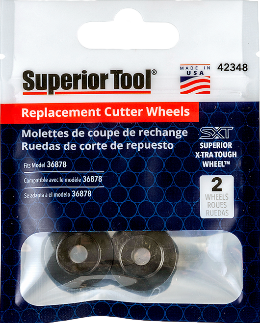 Brand Superior Tool Product ID 42348 Product Name Replacement Cutter Wheels for ST-2000 Tubing/Cutter (fits Model 36878) Product Copy Vast plumbing knowledge and expertise goes into every Superior Tool® tube cutting wheel we make. Superior Tool’s proprietary SXT™ cutting wheels use a special annealed steel that provides a higher carbon content to provide deeper, uniform hardening capabilities. We painstakingly burnish the wheel's cutting edge to ensure smooth, quick tubing cuts. Wheel edges are laser inspected for accuracy and quality. Each wheel is strengthened from hub-to-edge by cryogenically treatment and careful, slow tempering. Each wheel is treated with a special black oxide treatment to reduce friction and fight corrosion. Package contains two replacement cutter wheels. Product Features Replacement cutter wheels for Superior Tool’s ST-2000 Tubing/Cutter (Model 36878). Engineered to cut aluminum and copper. SXT™ (Superior Xtra Tough) technology – Proprietary design and processing provide long life and exceptionally clean cuts. Black oxide treatment to reduce friction and resist rust. Each package contains two replacement cutter wheels. Proudly made in the USA. Application Iron Pipe, Steel Pipe, Copper UPC 017197423482 GTIN 10017197423489 Category Plumbing-Tube Cutters Sub Category Replacement Parts Country of Origin United States of America Stock UOM Each Product Height (inches) 4.438 Product Length (inches) 0.375 Product Width (inches) 3.5 Product Weight (lbs) 0.051 Inner Pack Qty. 6 Master Pack Height (inches) 5 Master Pack Length (inches) 4.25 Master Pack Width (inches) 5.3 Master Pack Weight (lbs) 0.46 Tubing Tool Type Tubing Accessories
