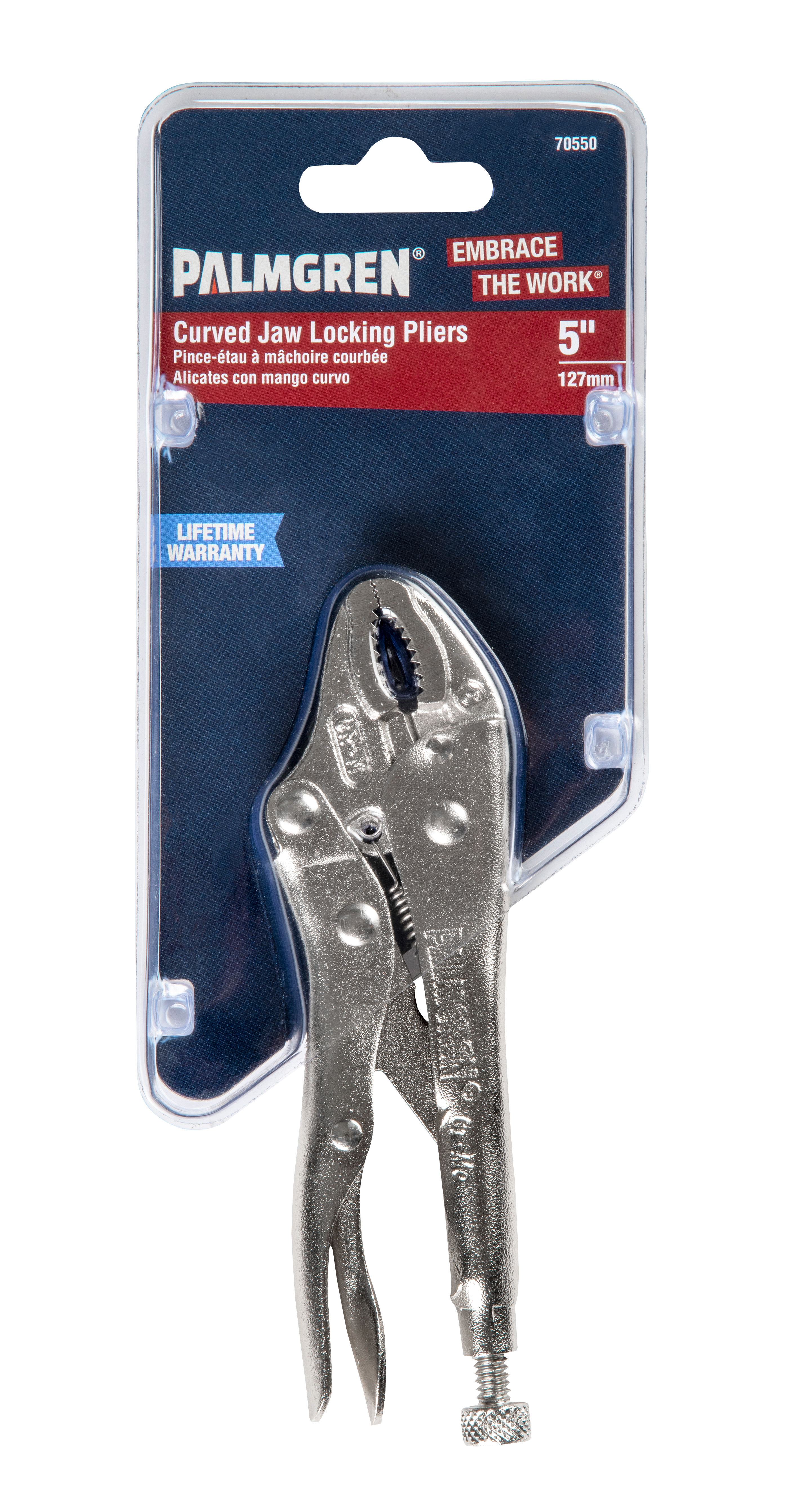 Product ID 70550 Product Name Locking Pliers-5" Curved Jaw UPC 726896705507 GTIN 10726896705504 Product Copy Palmgren’s locking pliers are designed for faster tool setup and more locking force. They help leave hands free when clamping, helping to eliminate repetitive squeezing action and general hand fatigue when manipulating. The convenient geometry of the handles allows for easier use and more hand force for increased clamping power. Product Features Drop forged and hardened jaws. Rugged teeth profile for durability and toughness. Spring loaded release lever – releases easily even when tools are firmly locked. Large diameter rivets provide secure joints delivering durability & robust pliers. Durable nickel plate finish. Locking nut holds adjustment during repetitive jobs. Adjustable lead screws comes with 1/4" hex key drive - This allows for easy pressure adjustment, draws materials together and provides a more controlled release. Lifetime warranty Category Workhold-Clamps & Vises Sub Category Manual Locking Pliers and Clamps Country of Origin Taiwan Stock UOM Each Product Height (inches) 8.8 Product Length (inches) 0.8 Product Width (inches) 3.3 Product Weight (lbs) 0.430 Master Pack Height (inches) 6.375 Master Pack Length (inches) 10.5 Master Pack Width (inches) 21 Master Pack Weight (lbs) 15.32 Inner Pack Height (inches) 3.875 Inner Pack Length (inches) 9.375 Inner Pack Width (inches) 5.375 Inner Pack Weight (lbs) 2.790 Inner Pack Qty. 10 Application Pliers with curved jaw to grasp round or oblong things Jaw Opening 1-1/4" Jaw Width 3/8" Clamps Type Locking Pliers Max Open Capacity (in.) 5" Warranty Limited lifetime warranty
