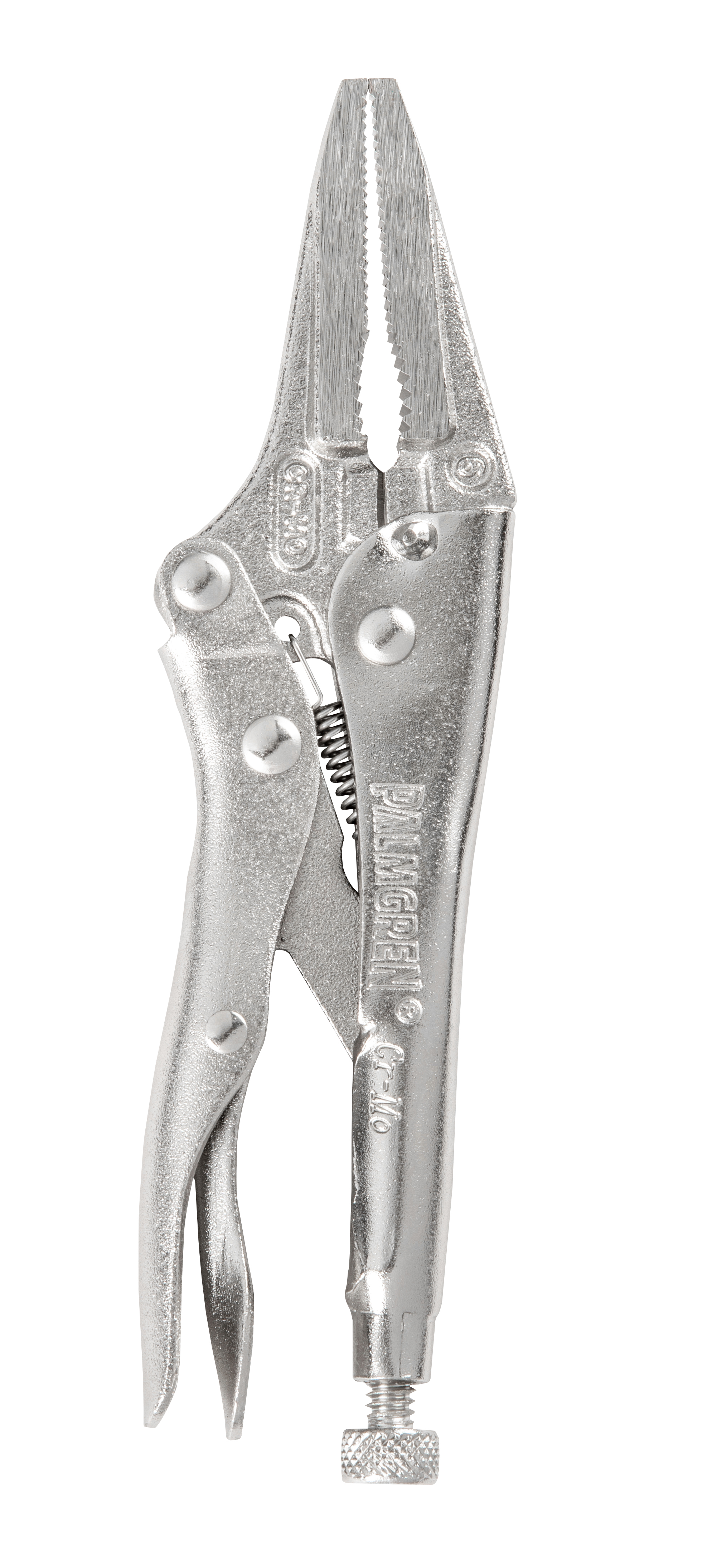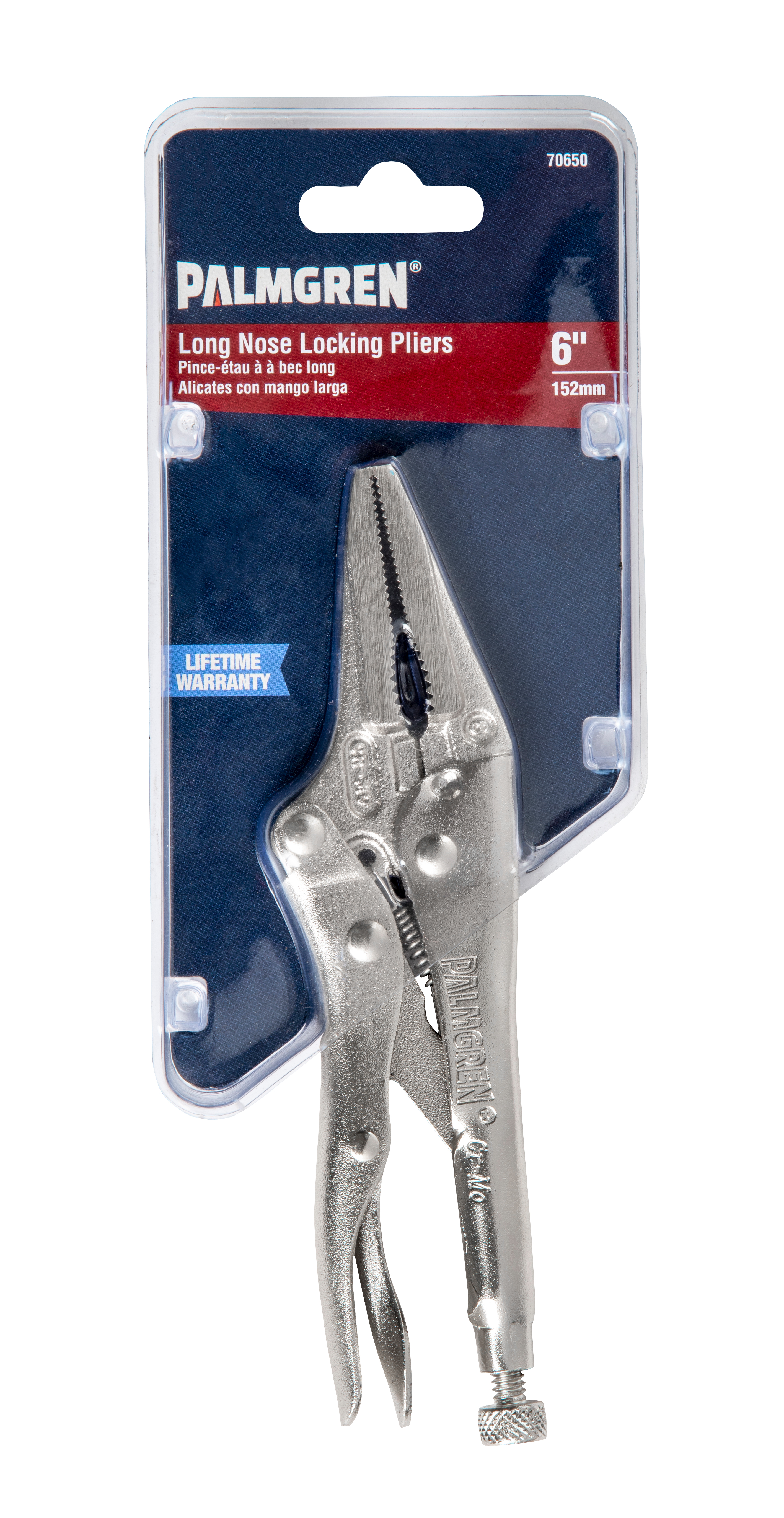 Product ID 70650 Product Name Locking Pliers-6" Long Nose UPC 726896706504 GTIN 10726896706501 Product Copy Palmgren’s locking pliers are designed for faster tool setup and more locking force. They help leave hands free when clamping, helping to eliminate repetitive squeezing action and general hand fatigue when manipulating. The convenient geometry of the handles allows for easier use and more hand force for increased clamping power. Product Features Drop forged and hardened jaws. Rugged teeth profile for durability and toughness. Spring loaded release lever – releases easily even when tools are firmly locked. Large diameter rivets provide secure joints delivering durability & robust pliers. Durable nickel plate finish. Locking nut holds adjustment during repetitive jobs. Adjustable lead screws comes with 1/4" hex key drive - This allows for easy pressure adjustment, draws materials together and provides a more controlled release. Lifetime warranty Category Workhold-Clamps & Vises Sub Category Manual Locking Pliers and Clamps Country of Origin Taiwan Stock UOM Each Product Height (inches) 9 Product Length (inches) 0.8 Product Width (inches) 3.3 Product Weight (lbs) 0.4 Master Pack Height (inches) 5.75 Master Pack Length (inches) 20.625 Master Pack Width (inches) 10.5 Master Pack Weight (lbs) 16.264 Inner Pack Height (inches) 3.875 Inner Pack Length (inches) 9.875 Inner Pack Width (inches) 4.875 Inner Pack Weight (lbs) 3.022 Inner Pack Qty. 10 Application Pliers for hard to reach places Jaw Opening 2" Jaw Width 3/8" Clamps Type Locking Pliers Max Open Capacity (in.) 6" Warranty Limited lifetime warranty