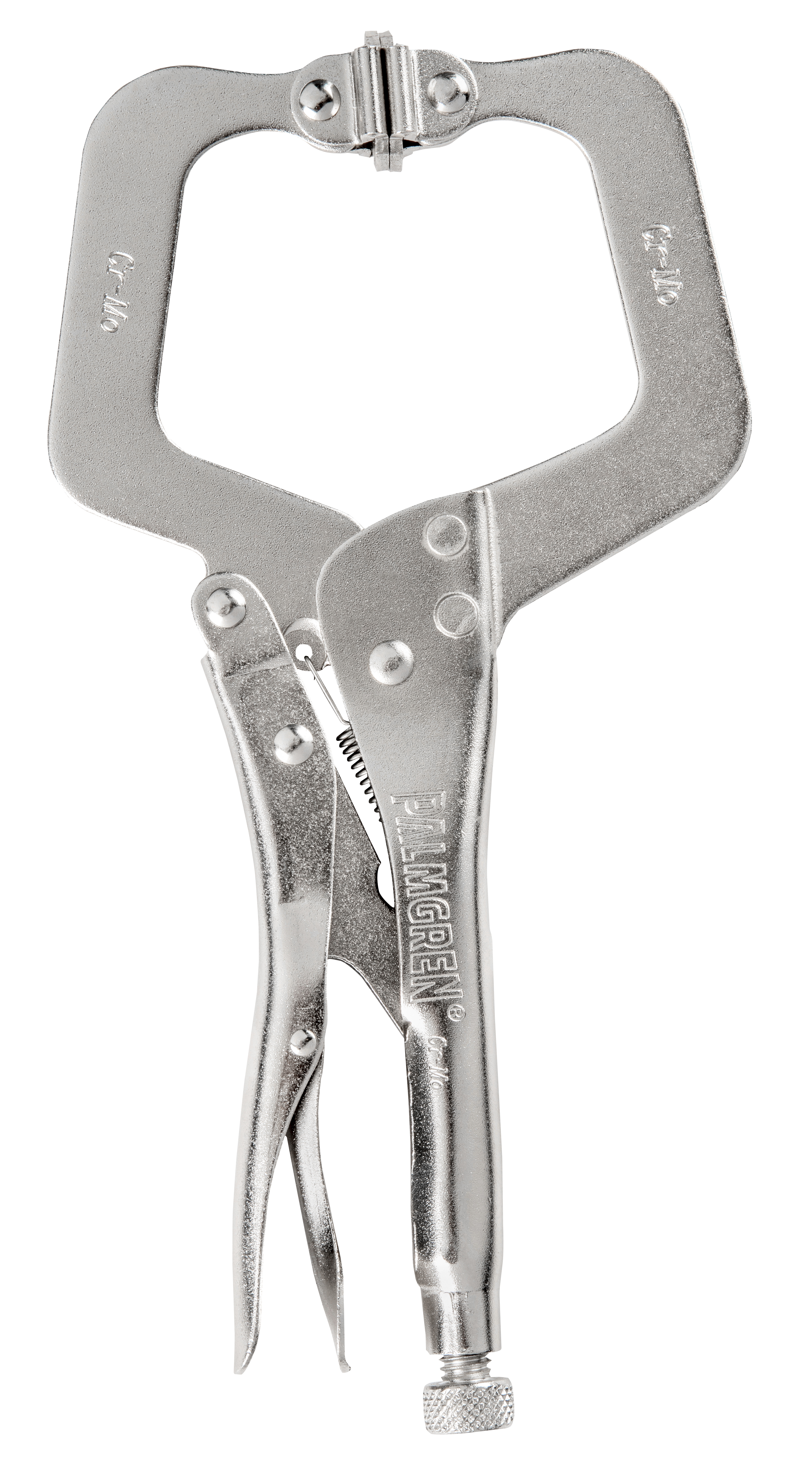Product ID 71120 Product Name Locking C-Clamp-11" With Pads UPC 726896711201 GTIN 10081834711208 Product Copy Palmgren’s locking pliers are designed for faster tool setup and more locking force. They help leave hands free when clamping, helping to eliminate repetitive squeezing action and general hand fatigue when manipulating. The convenient geometry of the handles allows for easier use and more hand force for increased clamping power. Product Features Drop forged and hardened jaws. Rugged teeth profile for durability and toughness. Spring loaded release lever – releases easily even when tools are firmly locked. Large diameter rivets provide secure joints delivering durability & robust pliers. Durable nickel plate finish. Locking nut holds adjustment during repetitive jobs. Adjustable lead screws comes with 1/4" hex key drive - This allows for easy pressure adjustment, draws materials together and provides a more controlled release. Lifetime warranty Category Workhold-Clamps & Vises Sub Category Manual Locking Pliers and Clamps Country of Origin Taiwan Stock UOM Each Product Height (inches) 13.5 Product Length (inches) 0.8 Product Width (inches) 6.4 Product Weight (lbs) 1.9 Master Pack Height (inches) 14.5 Master Pack Length (inches) 14.75 Master Pack Width (inches) 13.375 Master Pack Weight (lbs) 49.554 Inner Pack Height (inches) 6.125 Inner Pack Length (inches) 14.250 Inner Pack Width (inches) 6.750 Inner Pack Weight (lbs) 11.845 Inner Pack Qty. 5 Application Clamp to hold two things together, such as wood during carpentry work Max Open Capacity (in.) 11" Warranty Limited lifetime warranty