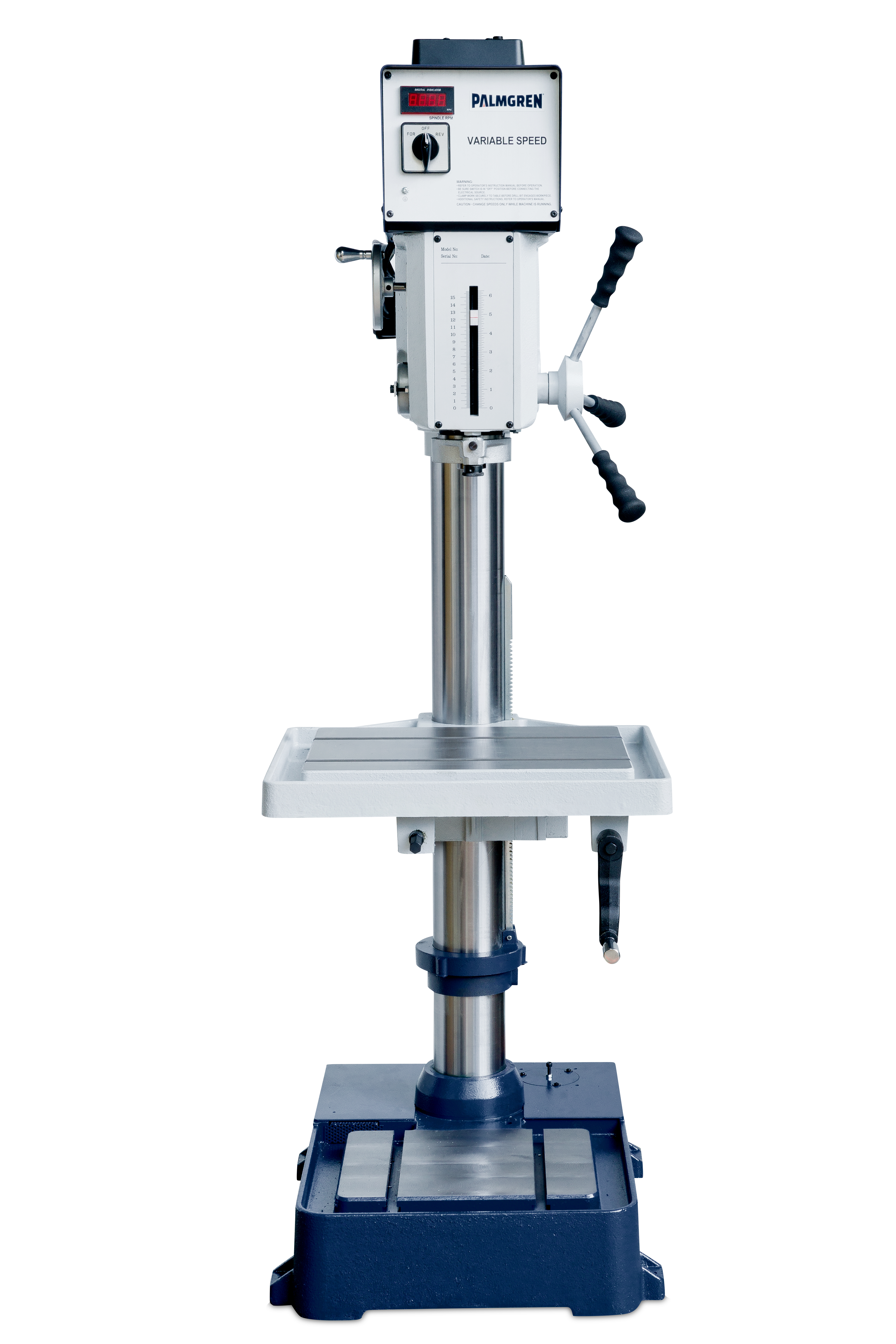 Product ID 9680227 Product Name 20" Variable Speed Belt Drive Drill Press (230/460V 3 Phase) UPC 726896802275 Product Copy Palmgren’s 20” Variable Speed Drill Presses allow the user to dial into the optimal spindle RPM for any material or tooling combination. While the machine is running, the simple hand wheel adjustments and digital RPM readout makes speed changes a breeze. The heavy-duty cast-iron construction increases the machines’ accuracy and rigidity in any drilling application. Product Features Front mounted positive control depth stop, Oversized head construction provides for an extended quill travel of 4-1/2”. Large, ergonomic down feed hand grips designed for end user comfort during operation. Oversized 3” quill diameter. Front face LED spindle speed readout. Worktable can rotate 360° around the machine column. Precision ground base work surface with t-slots for large workpieces. Side mounted hand wheel for instant speed changes Category Machine-Drill Presses Country of Origin Taiwan Stock UOM Each Product Height (inches) 75 Product Length (inches) 37.5 Product Width (inches) 25.5 Product Weight (lbs) 750 Application Metal and Wood Drilling Base Dimension 27.4 x 19.5 x 6.1 in Machine Weight 649 Max. Distance Spindle To Table 27" Max. Spindle To Base 47" Motor HP 2 Number of Spindle Speeds Variable 300~2000 rpm Number of Table Slots: 2 Overall Dimensions (LxWxH) 36" x 27" x 78" Phase Three Quill Diameter 3 in Speed Range 300 - 2,000 RPM Spindle Taper MT3 Spindle Travel 6 in Stand work surface length x width 22" x 18.5" Swing 20 in Table T-slots 3 Tilting Angle Non-Tilting Tool Weight (Max) 500 Voltage 230/460V Warranty 3 years Working surface base L x W 27" x 19"