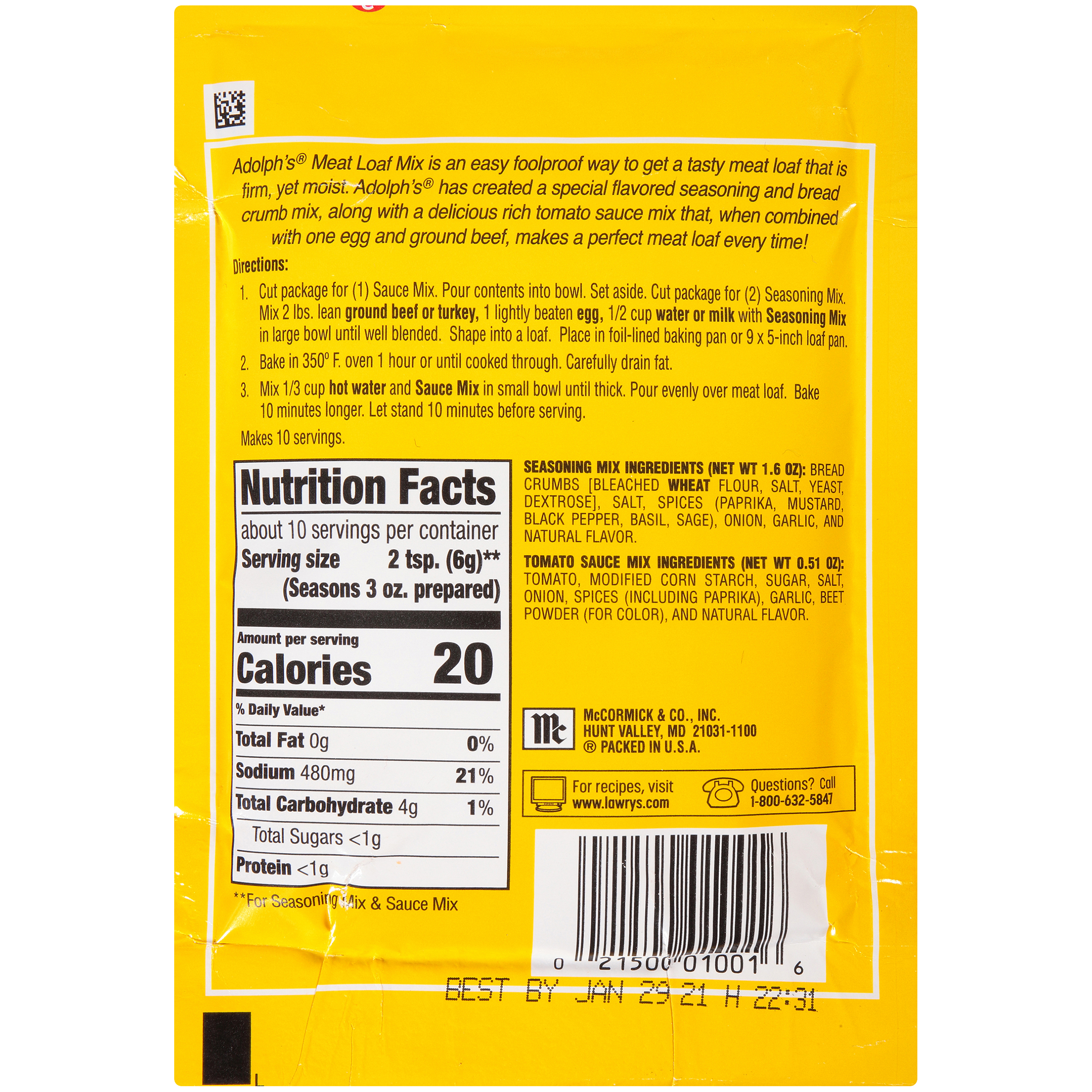 Main ImageAdolph's®EXTRA SALTY Meat Loaf Seasoning Mix WITH SALTDiscontinued Date2021-01-01Uniform Product Code021500010016