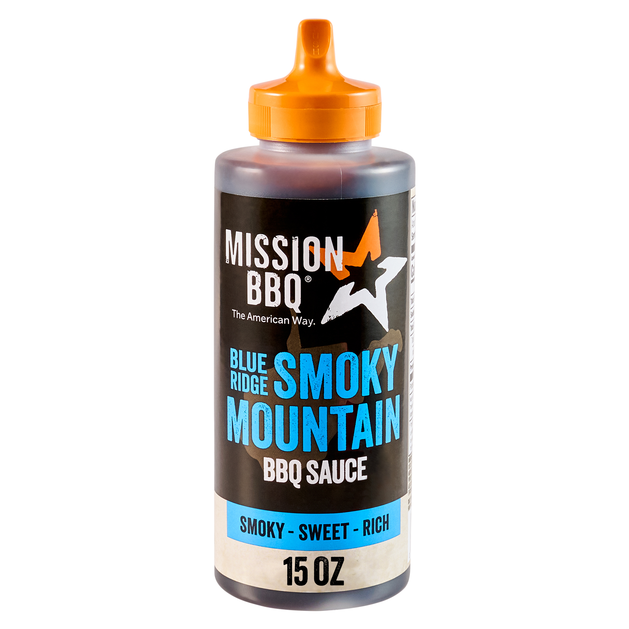 Extra Long Description Take a trip down south and slow down with the bold, smoky flavors of Mission BBQ® Blue Ridge Smoky Mountain BBQ Sauce. Thick molasses, tangy vinegar, and sweet brown sugar deliver a classic southern richness to pulled pork, chicken, and seafood. As versatile as it is flavorful—use it as a sauce, marinade, or glaze. Add a sweet balance to savory, salty smoked trout, a bold smokiness to grilled chicken, a smoldering southerness to grilled shrimp, and so much more. Pour on, mix in, and soak up the deep, satisfying flavors of Blue Ridge Smoky Mountain BBQ from the comfort of your home. MISSION BBQ®, proudly serves those who serve. Bold flavor. Real tradition. Inspired by those who serve. MISSION BBQ® is more than great bbq — it’s a tribute to the spirit of service and community. Enjoy the entire lineup of regionally inspired BBQ Sauces and recipes at home! Feature 1 BBQ FLAVOR: Add the rich combination of sweet and smoky Blue Ridge BBQ flavor to your favorite proteins. Feature 2 VERSATILE: Pour it on, mix it in, or soak it up as a sauce, marinade, or glaze. Feature 3 PROTEIN PERFECT: A sweet and smoldering addition to chicken, seafood, and pulled pork. Feature 4 REGIONAL FLAVOR: Made with Smoky Mountain BBQ-inspired ingredients like molasses, brown sugar, and vinegar. Feature 5 BBQ AT HOME: Bring home MISSION BBQ’s entire lineup of restaurant-style BBQ sauces. Feature 6 PROUDLY SERVING: A tribute to the spirit of service and community, MISSION BBQ is proud to serve those who serve. Preparation Instructions No preparation needed to enjoy MISSION BBQ Blue Ridge Smoky Mountain BBQ SAUCE with chicken, seafood, and pulled pork. Storage Instructions Shelf life for MISSION BBQ Blue Ridge Smoky Mountain BBQ SAUCE is 540 days. Benefits No High Fructose Product Nutritional Claims NONE 10 digit UPC 1730001077 12 digit UPC 017300010776 GTIN 00017300010776 Serving Size 36 Serving Size Unit of Measure g Servings per Container 12 Height 6.775 Height_Metric 17.208 Height Unit of Measure IN Depth/Length 2.446 Depth Unit of Measure IN Width 2.446 Width Unit of Measure IN