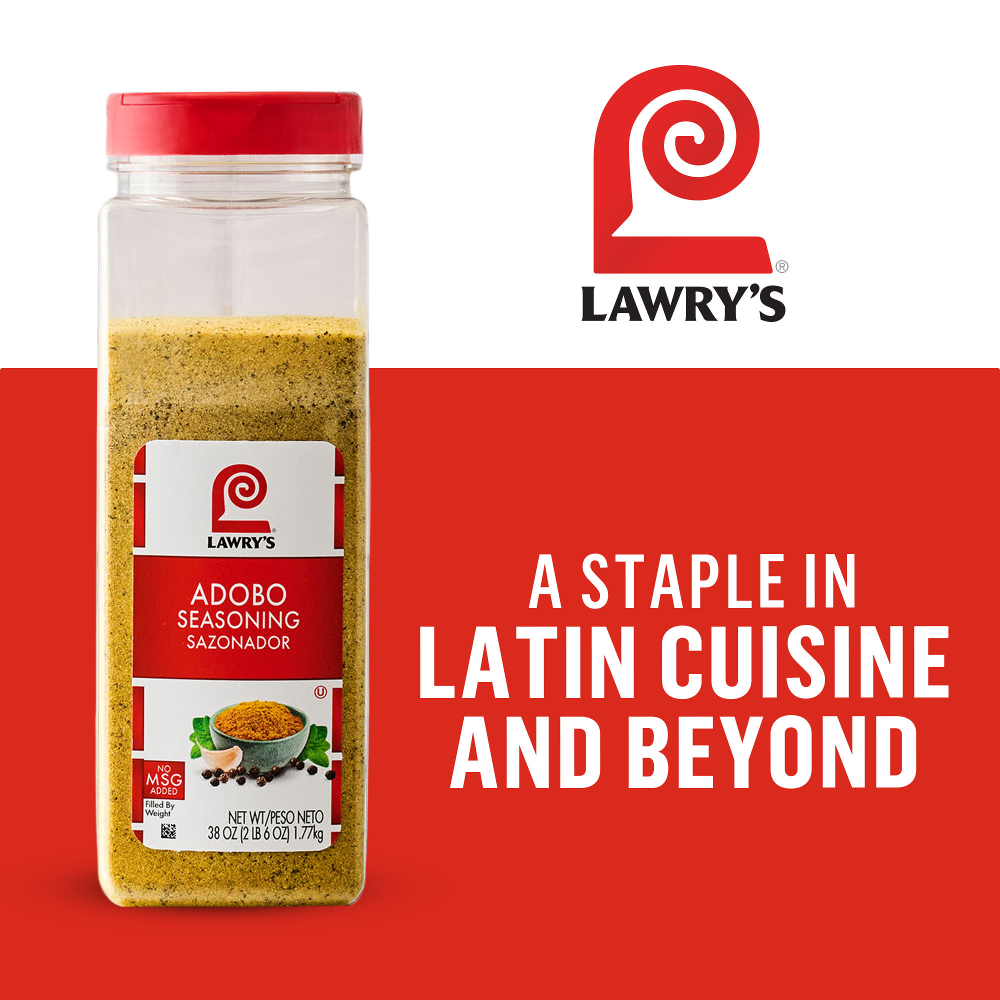 Extra Long Description Shake up your menus with Lawry’® Adobo Seasoning. A staple in Latin cuisine and beyond, adobo is a traditional blend used to marinate and season meats, beans, and vegetables. Crafted with garlic, oregano, turmeric, salt, and black pepper, with no MSG added, Lawry’s is a one-of-a-kind, go-to flavor solution for food that hits every time. From Latin-inspired favorites like tacos, rice and beans, and guac, to classic like meatloaf and chili, there are so many ways to incorporate the savory, all-purpose flavor of Adobo seasoning into your menus. It’s the perfect way to bring the zing to beef, chicken, pork, seafood, soups, and sauces - and keep patrons coming back for more. Create mouthwatering dishes in no time with the convenience of Lawry’s. You’ll save time in the kitchen and keep it flavorful, all while feeding your patrons delicious meals. It’s amazing what a little Lawry’s can do! Feature 1 ALL-PURPOSE SEASONING: A traditional blend crafted with garlic, oregano, turmeric, salt, and black pepper for bringing savory, craveable flavor to menus that keeps patrons coming back for more. Feature 2 GREAT FOR MEAT: Rub onto chicken, beef, or pork before air-frying, grilling, or roasting. Feature 3 LATIN-STYLE DISHES: Essential seasoning for adding zip to tacos, guacamole, rice and beans, seafood adobo, pork adobo, and more. Feature 4 FEEL-GOOD FLAVOR: Flavor to the fullest with Lawry’s. No msg added to this versatile seasoning mix. Feature 5 MADE FOR CHEFS: Larger 38 oz size ensures you always have great flavor on hand in your back of house. Preparation Instructions No preparation necessary to enjoy Lawry’s Adobo Seasoning with tacos, guacamole, rice and beans, and more. _x000D_ Storage Instructions To maintain the freshest flavor and color, Lawry’s Adobo Seasoning can be stored in a cool, dry place away from exposure to heat, humidity, moisture, direct sunlight, and fluorescent light. Shelf life for this product is 720 days._x000D_ Benefits - Kosher