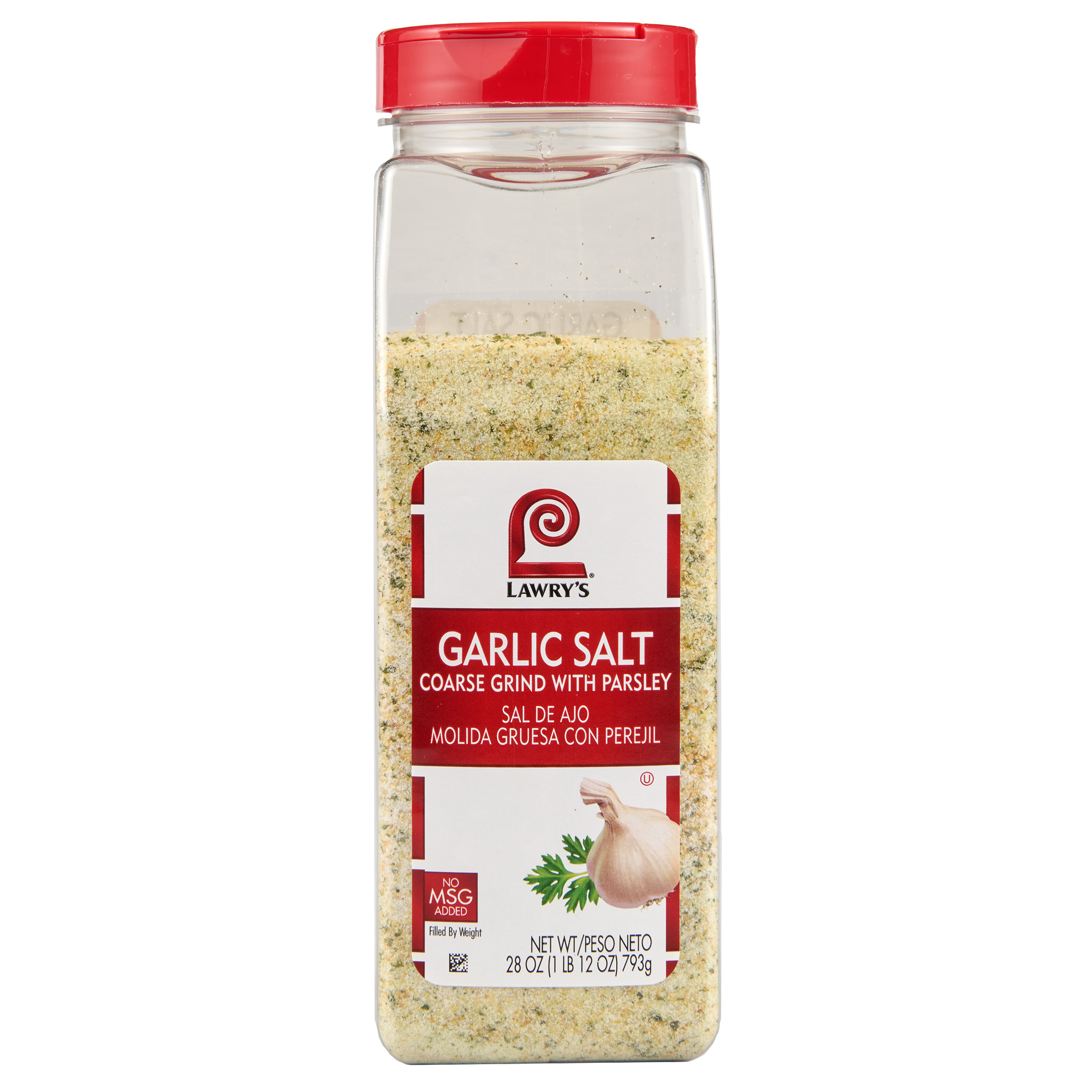Extra Long Description Lawry’s® Coarse Ground with Parsley Garlic Salt brings the zing to your menus, keeping patrons craving more. A blend of coarse-ground garlic, salt, and parsley in one convenient bottle, it adds full-bodied garlic flavor to every dish. Busy cooks keep garlic salt on hand in their restaurant kitchen. From scrambled eggs to salads and fried chicken, garlic salt is a shortcut to rich, savory taste. Use it to season steaks, chops, pasta dishes, soups, dips, and more. It makes ordinary side dishes like rice, potatoes, and veggies shine. It’s the secret to making any dish with ground beef — burgers, meatloaf, or meatballs — so much better. The 28 oz container is perfectly sized for back-of-house use, giving chefs the consistency and convenience they need. Create mouthwatering dishes in no time with the convenience of Lawry’s. You’ll save time in the kitchen and keep it flavorful, all while feeding your patrons delicious meals. It’s amazing what a little Lawry’s can do! Feature 1 COARSE GROUND: Lawry’s Coarse Ground with Parsley Garlic Salt is a mix of coarse-ground garlic, salt, and parsley flakes. Feature 2 BOLD GARLIC FLAVOR: Add the bold flavor of garlic with a pop of herby, green parsley to any savory dish. Feature 3 CONVENIENT: As a pre-blended salt, it conveniently adds flavor to your recipes; there’s no chopping of garlic needed; flavorful swap for table salt. Feature 4 ESSENTIAL INGREDIENT: This garlic salt is a must-have in the kitchen for preparing so many different dishes. Or use it to season food at the table; try it with eggs, veggies, pasta, French fries, and baked potatoes. Feature 5 VERSATILE STAPLE: Shake it on chicken, pork chops, steak, veggies, potatoes, pasta, eggs, dips, and more. Feature 6 FEEL-GOOD FLAVOR: Since it’s kosher certified and made with no MSG added, you can feel good about serving patrons meals made with our garlic salt. Feature/Benefit 7 LARGER BOTTLE: This 28 oz bottle is perfectly sized for professional chefs and home cooks who love their Lawry’s. Preparation Instructions No preparation necessary. Shake Lawry’s Coarse Ground with Parsley Garlic Salt on chicken, pork, steak, and seafood. Mix it into ground meat for burgers and meatloaf. Toss cubed potatoes with oil and garlic salt before baking. Sprinkle it on cooked pasta, rice, and vegetables. Storage Instructions Lawry’s Coarse Ground with Parsley Garlic Salt has a shelf life of 720 days. Keep away from heat, moisture, and direct sunlight. Avoid storing over the stove, dishwasher, sink, or near a window. We do not recommend freezing, as freezing does not extend the shelf life of dried herbs and spices. Benefits - Kosher