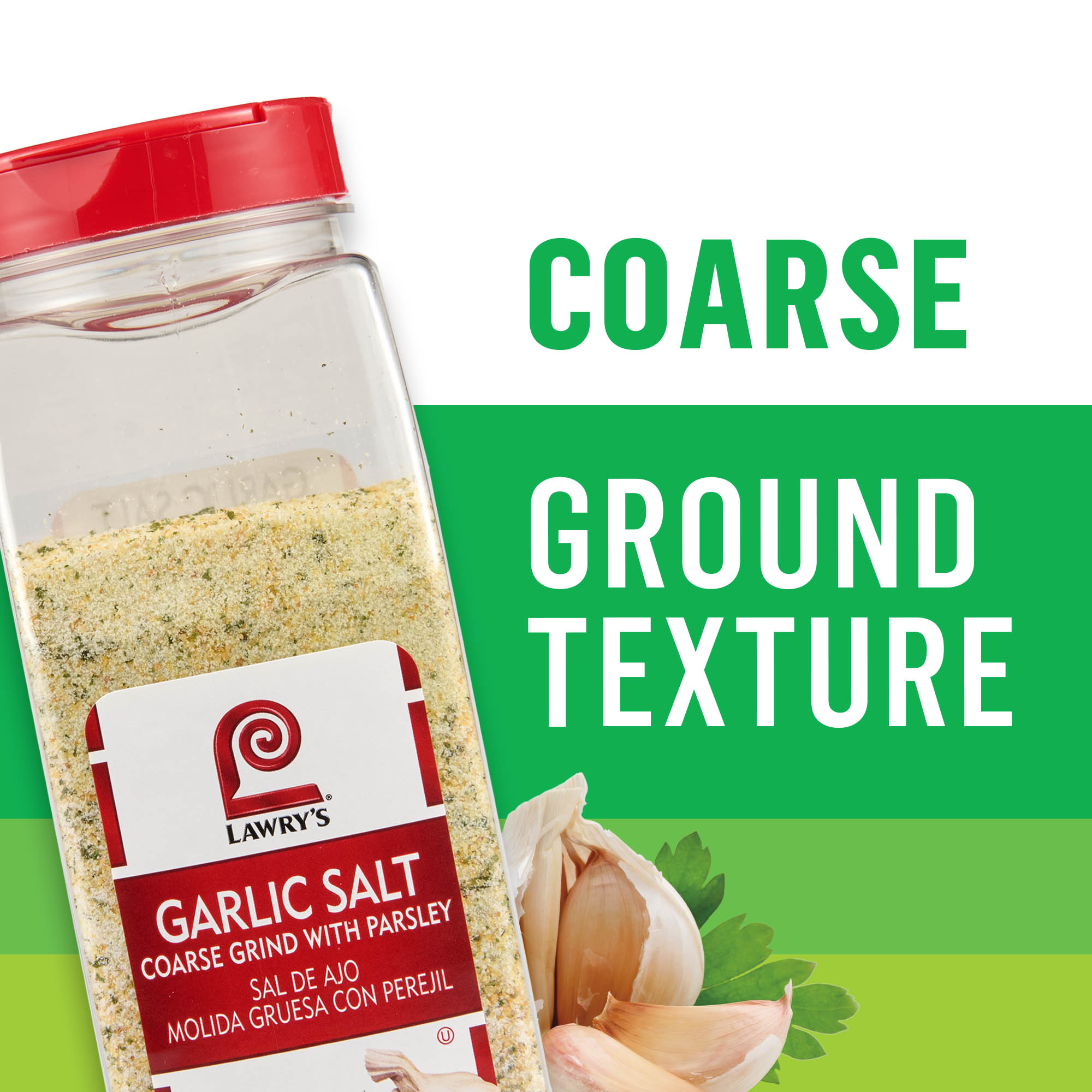 - Lawry’s® Coarse Ground with Parsley Garlic Salt brings the zing to your menus, keeping patrons craving more. A blend of coarse-ground garlic, salt, and parsley in one convenient bottle, it adds full-bodied garlic flavor to every dish.