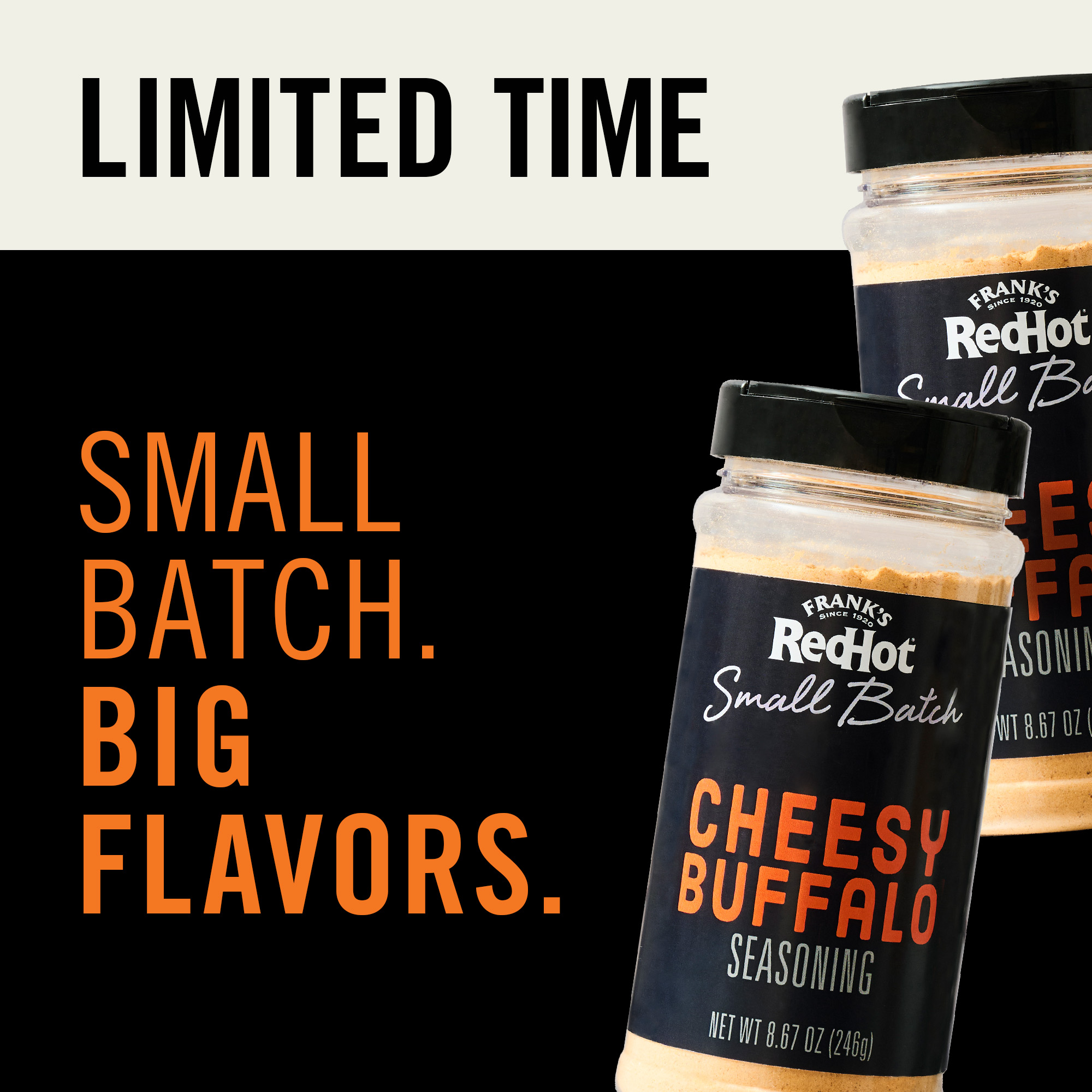 - Frank’s RedHot® Small Batch Cheesy Buffalo Seasoning is the perfect blend of creamy, savory, cheesy Buffalo flavor and iconic Frank’s RedHot heat. Use it to push the boundaries of taste with on-trend flavor that will keep patrons coming back for more.