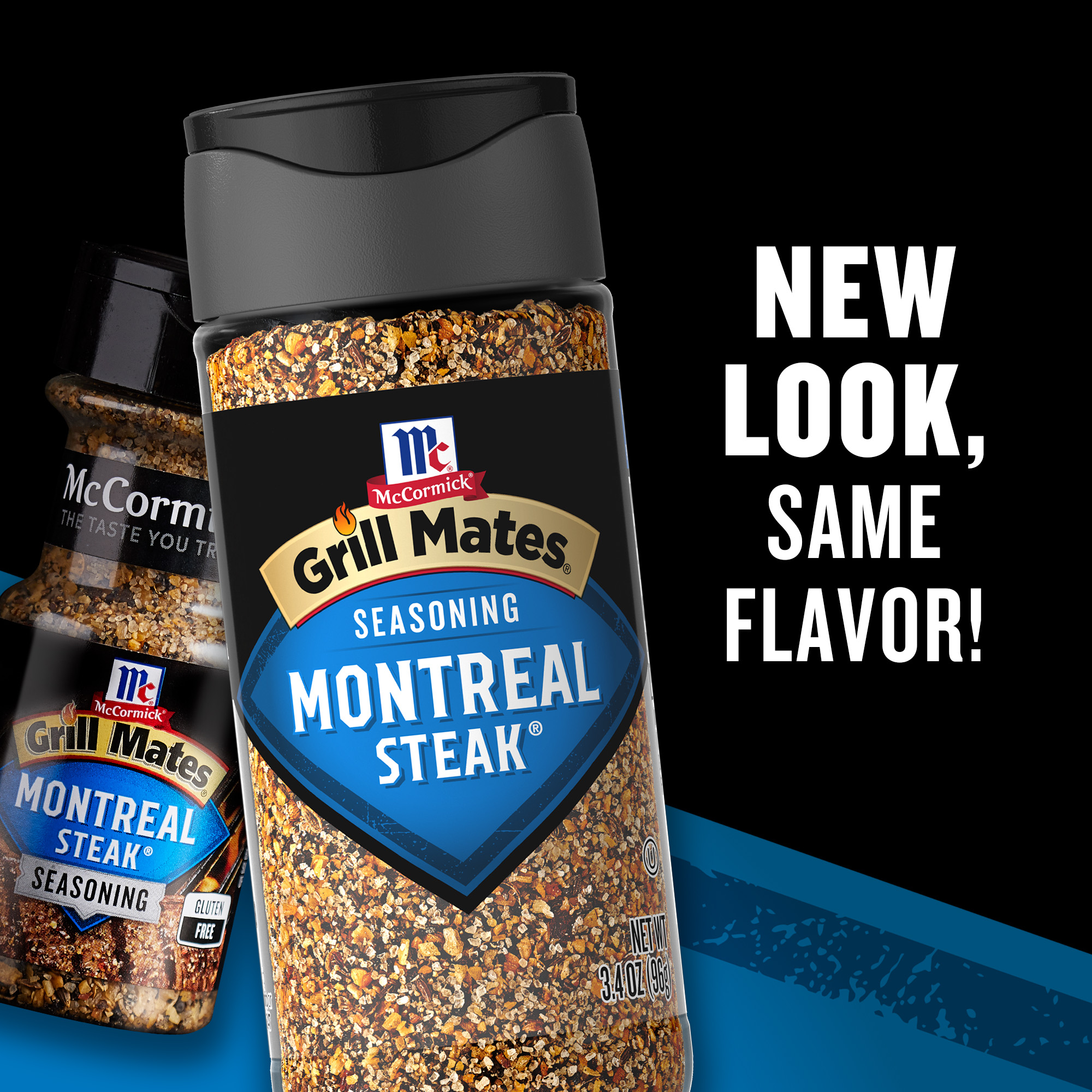 - Knock dinner out of the park with a shake of McCormick Grill Mates Montreal Steak Seasoning. Made with coarsely ground peppers, garlic, and spices, Steak Seasoning adds bold, iconic flavor to steaks, burgers, and pork with every shake of the bottle.