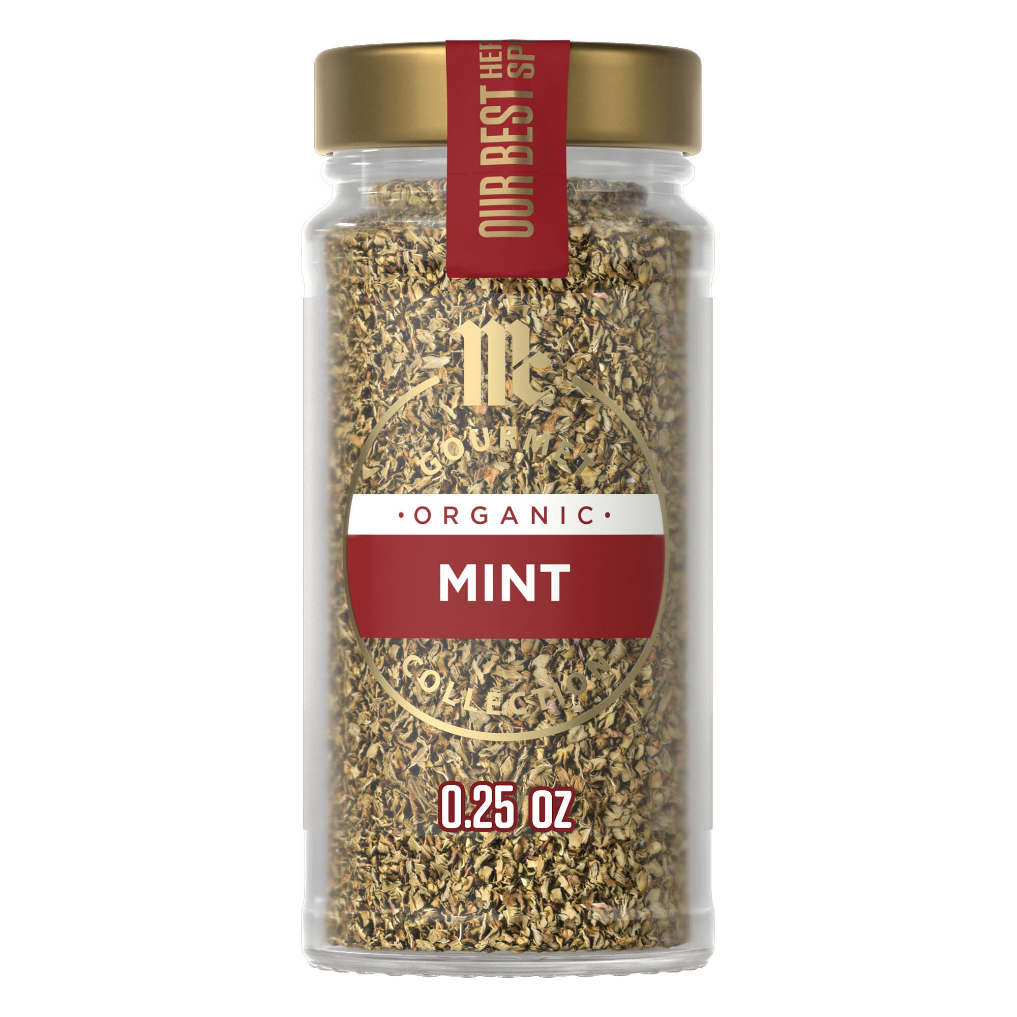 Extra Long Description Discover our finest flavors with the McCormick Gourmet™ Collection of our best herbs and spices — including McCormick Gourmet Collection Organic Mint. Mint brings exceptional taste to your table by adding a pop of fresh flavor to sweet and savory recipes. Refreshing mint adds subtle, sweet taste and cool flavor to beverages, fruit salads, and spring vegetables. Cut the richness of slow-cooked meats with a vibrant chutney or mint jelly to serve alongside lamb chops, tagines, or curries. Season new potatoes and spring peas with butter and a pinch of mint for a simple side. Infuse the mint flavor into iced and hot teas, simple syrups for cocktails, and lemonade. Whether sourcing cinnamon from Saigon or vanilla from Madagascar, we journey to the corners of the globe discovering exceptional ingredients. Only once we’re satisfied, do we share them with you. Open up a world of flavor with the latest collection of more than 70 herbs, spices, seasonings, and extracts from the McCormick Gourmet Collection. This is our very best. Feature 1 OUR BEST HERBS & SPICES: Awaken your senses with a curated collection of more than 70 herbs, spices, seasonings, and extracts. Discover our finest flavors from the McCormick Gourmet Collection. Feature 2 CRAFTED WITH EXCEPTIONAL INGREDIENTS: Our mint is carefully sourced to add a pop of fresh flavor to your dishes. Organic, non GMO, and kosher. Feature 3 DISTINCTIVE FLAVOR: Enliven a variety of recipes with the subtle, sweet taste and cool flavor of our best mint. Add a pinch to iced and hot teas, fruit and grain salads, or use as an ingredient in sauces and seasoning rubs. Feature 4 SEASON SIMPLY: Add bright flavor to simple sides like steamed new potatoes, peas, asparagus, and sugar snap peas. A dash of mint makes a sweet addition to citrus vinaigrettes that are drizzled over melon or berries. Feature 5 FLAVOR INFUSER: Infuse minty-cool flavor into steeped teas and serve hot or iced for a refreshing beverage. Add it to homemade simple syrups and use for cocktails or make a minty lemonade that’s perfect for summer. Feature 6 MEATY COMPANION: Cut the richness of slow-cooked meats like lamb and hearty stews with the fresh flavor of mint. Add it to chutney or mint jelly to serve alongside lamb chops, tagines, or curries. Feature/Benefit 7 EASY SUBSTITUTE: Keep dried mint on hand to add flavor in a pinch. Use 1 teaspoon of dried mint in place of 2 teaspoons of chopped fresh mint. Preparation Instructions No preparation necessary to enjoy the unmatched flavor of McCormick Gourmet Collection Organic Mint in beverages, fruit salad, mint jelly, and more. Storage Instructions Store McCormick Gourmet Collection Organic Mint in a cool, dry place, to protect against flavor loss and moisture. Avoid exposure to heat, humidity, direct sunlight, and fluorescent light to maintain flavor and color. Always use dry measuring spoons and cups to ensure optimal product integrity. Shelf life: 1080 days. Benefits - Organic