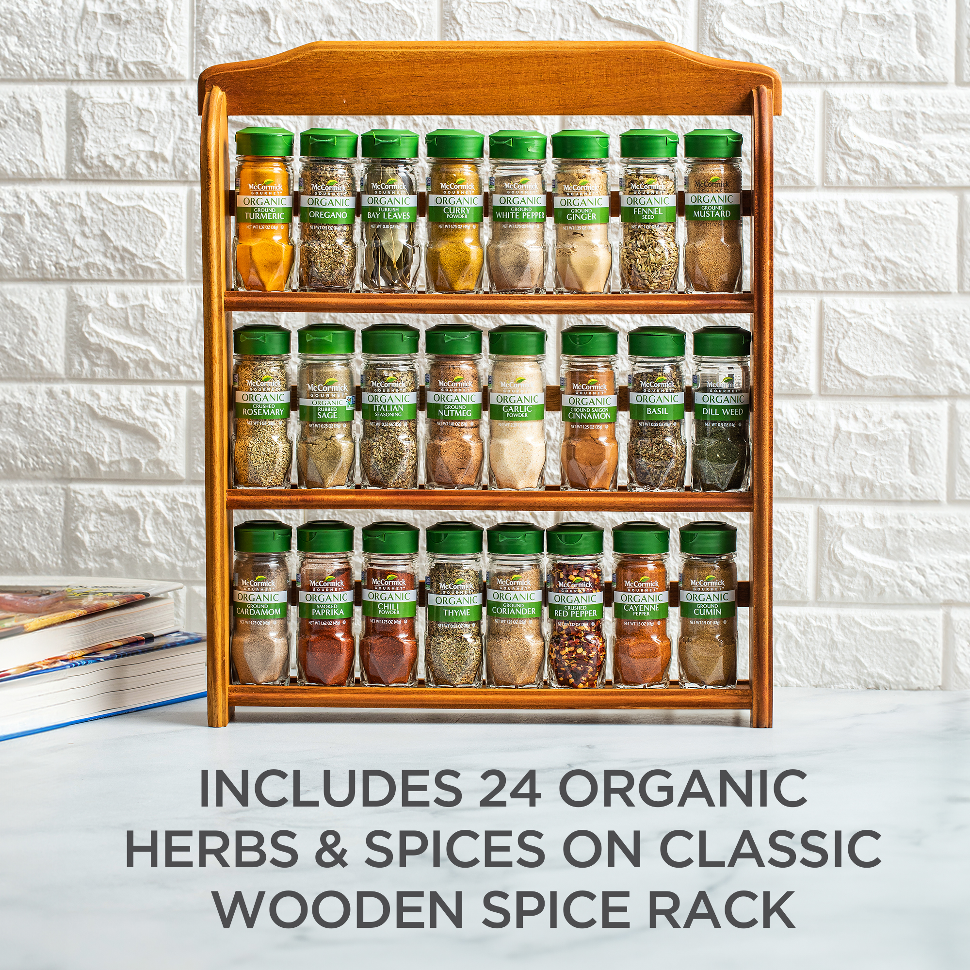 - Treat yourself to the best organization tool for your counters and pantry – The McCormick Gourmet™ Three Tier Wood 24 Piece Spice Rack. Featuring 24 organic herbs, spices, and seasonings, this best-seller is a favorite for housewarming, wedding, bridal shower, and holiday gifts.