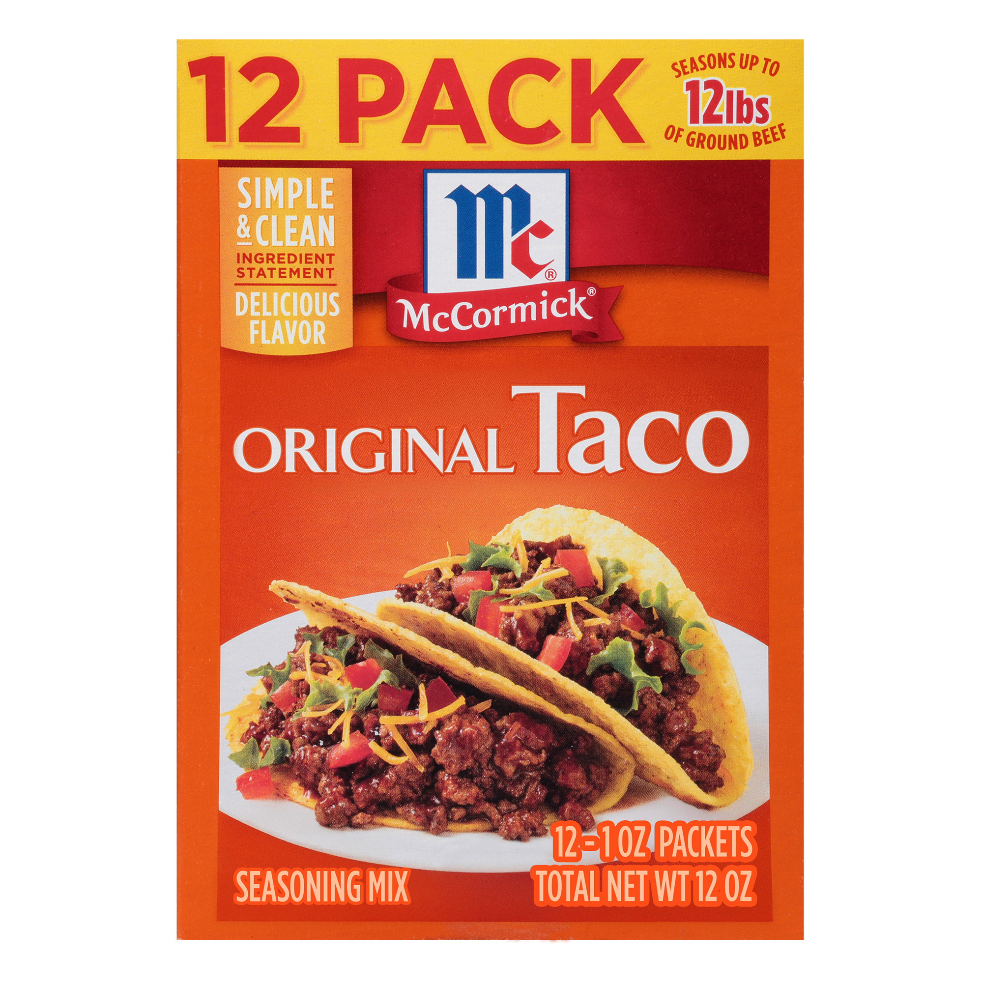 Extra Long Description With McCormick Original Taco Seasoning Mix, the whole family will wish taco night could be every night! Our signature blend adds vibrant flavor to everything from tacos to nachos, taco casserole, chicken wings, and more. Includes 12 individual packets of seasoning mix. Made with McCormick spices including onion, garlic, paprika, and chili pepper, taco seasoning is the perfect addition to your pantry. One packet of Taco Seasoning flavors 1 lb of ground beef or ground turkey for delicious tacos that are ready to serve in just 15 minutes! With this convenient bundle of 12 seasoning mix packets, you can season up to 12 lbs of ground beef. Crafted with a simple and clean ingredient statement, Original Taco Seasoning is made for every kind of taco out there – chicken tacos, beef tacos, vegetarian tacos, shrimp tacos … but it’s also versatile enough for use in casseroles, burgers and adding it’s south-of-the-border zip to fajitas or quesadillas. Wondering how to make homemade tacos for your next taco Tuesday? Brown meat in a large skillet on medium-high heat. Drain the fat and stir in seasoning mix and water. Bring to a boil before reducing heat and simmering for five minutes, stirring occasionally. Spoon into warm taco shells and enjoy with your favorite taco toppings. Feature 1 SIGNATURE TACO TASTE: Made with McCormick spices including onion, garlic, and chili pepper for adding south-of-the-border zip to tacos and your favorite foods. Feature 2 QUICK & EASY: Make tacos in 15 minutes! See the back of package for a simple and delicious recipe for ground beef or ground turkey tacos. Feature 3 TACO NIGHT: Whatever kind of taco you’re into, this is the seasoning mix for it! Make chicken tacos, beef tacos, turkey tacos, shrimp tacos, fish tacos, veggie tacos, and more for taco night or any occasion. Feature 4 VERSATILE SEASONING MIX: Bring bold taco flavor to everything from wings to taco casserole, taco tots, taco burgers, taco chicken wings, nachos, enchiladas, and more. Feature 5 FAMILY-FRIENDLY: Use one packet to season 1 lb of ground beef or ground turkey for delicious homemade tacos. Serve with a variety of toppings to let everyone at your table make their taco just the way they like it! Feature 6 FEEL GOOD FLAVOR: No msg added and made with McCormick spices. Feature/Benefit 7 12-PACK: Includes 12 individual 1 oz packages of seasoning mix to flavor up to 12 lbs of ground beef or turkey. Preparation Instructions To prepare tacos with McCormick Original Taco Seasoning Mix: Prep time: 5 minutes. Cook time: 10 minutes. Makes 6 (2 taco) servings. You Will Need • 1 packet of McCormick Seasoning Mix • 1 lb lean ground beef or turkey • 3/4 cup water • 12 taco shells or flour tortillas (6-inch). Assorted Toppings: shredded lettuce, chopped tomatoes, shredded cheese, salsa, or sour cream. Directions: 1. Brown meat in large skillet on medium-high heat. Drain fat. 2. Stir in Seasoning Mix and water. 3. Bring to boil. Reduce heat and simmer 5 minutes, stirring occasionally. Spoon into warm taco shells. Serve with desired toppings. Storage Instructions To maintain the freshest flavor and color, McCormick Original Taco Seasoning Mix should be stored in a cool, dry place away from exposure to heat, humidity, moisture, direct sunlight, and fluorescent light. Shelf life: 720 days. Benefits - Vegan