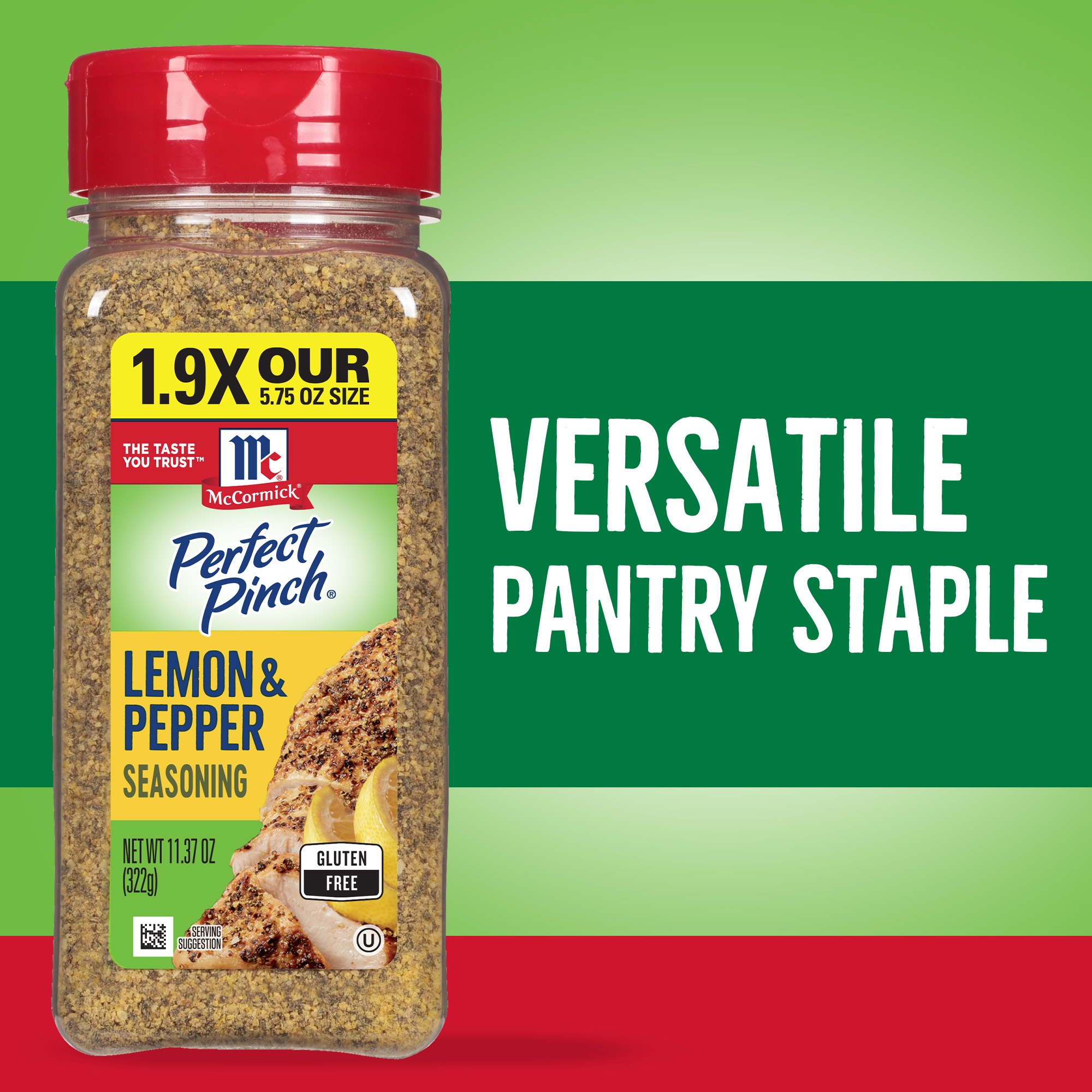 - McCormick Perfect Pinch Lemon and Pepper Seasoning is a kitchen staple- thoroughly blended with salt, black pepper, onion, garlic and lemon oil to deliver zesty flavor to most meals.