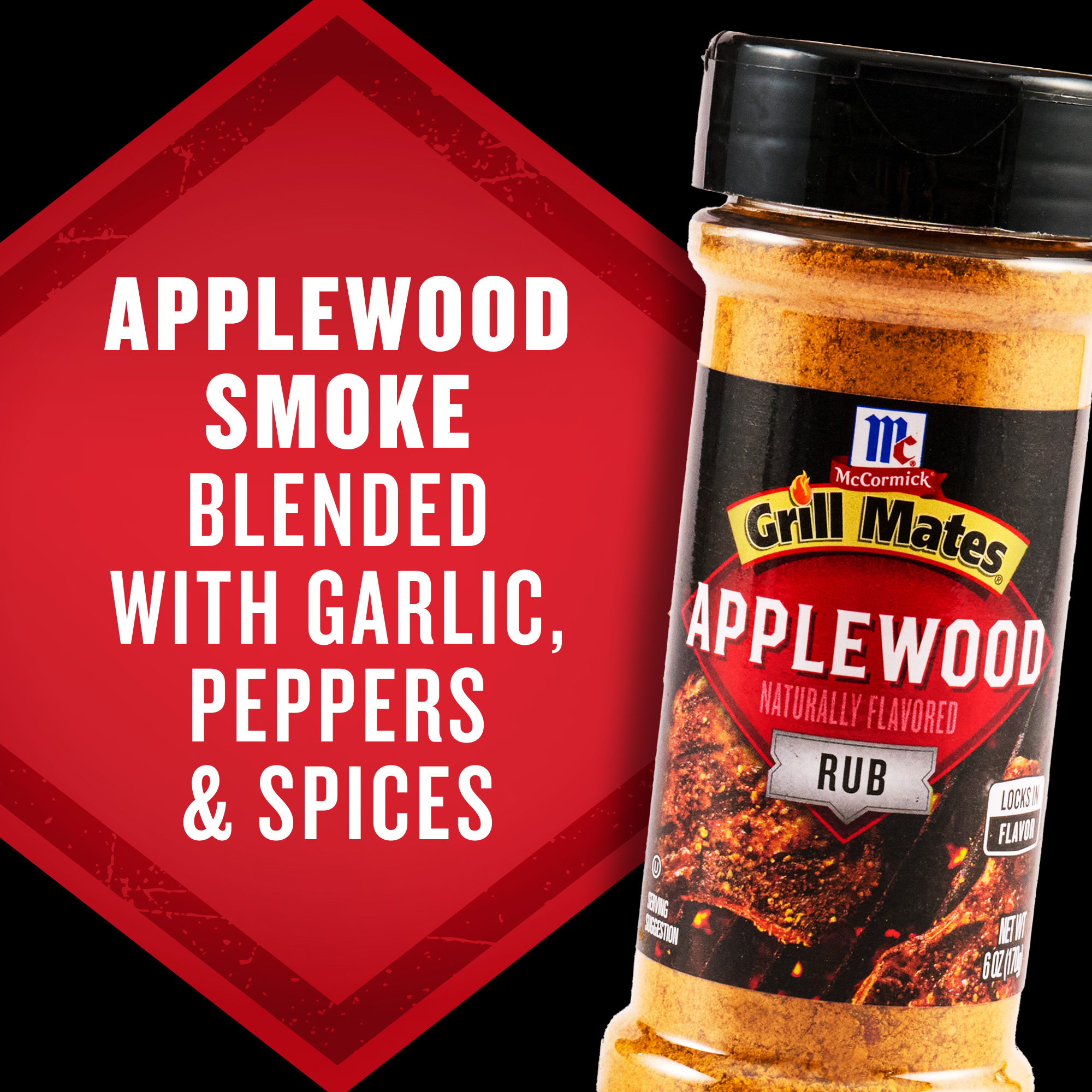 - Grill Mates Applewood Rub is a smoky, savory and slightly sweet blend of garlic, peppers and applewood smoke. Win at the grill every time with Applewood Rub, America's #1 grilling seasoning. It serves one purpose: to intensify the taste of your favorite cuts with McCormick herbs and spices.